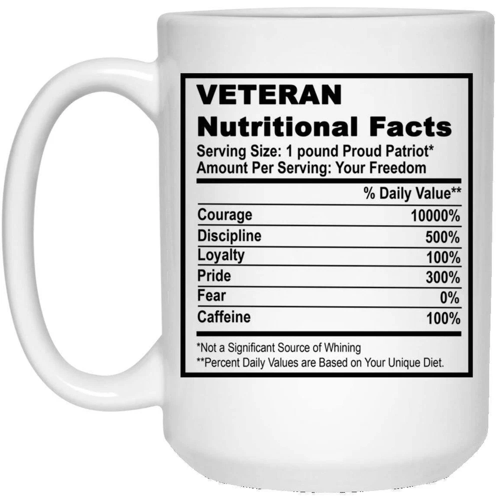 Veteran Nutritional Facts Coffee Mug Nutritional Facts Funny Coffee Mug Funny Product Details.. This high quality 11oz. ceramic white mug has a premium hard coat that provides crisp and vibrant color reproduction sure to last for years. Perfect for all hot & cold beverages. The highest quality printing possible is used. It will never fade no matter how many times you wash it. Material: 100% Ceramic. Print both sides. Dishwasher and Microwave Safe. High Gloss + Premium White Finish. Printed in the U.S.A. Personalized & Custom. We support personalized and custom mug to add custom, when placing an order, you can add notes to the "order note" in shipping address section. Also you can contact us directly via message. Shipping Info. Ready to ship in 1 to 2 business days, All products are made-to-order and proudly printed in the United States. Shipped by USPS and DHL, You will receive your order in 5-7 days. Replace & Refund. All products are defective during shipping broken, chipped will be replaced free of charge. You are not satisfied with the product, we will refund 100% money to you. If any other issues arise, please do not hesitate to message, we would be more than happy to assist you.
