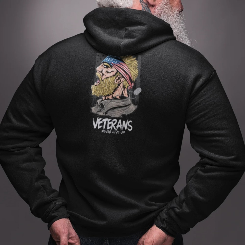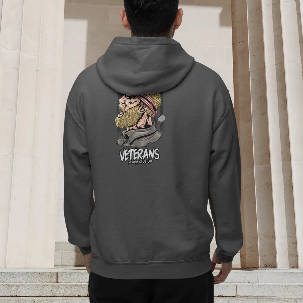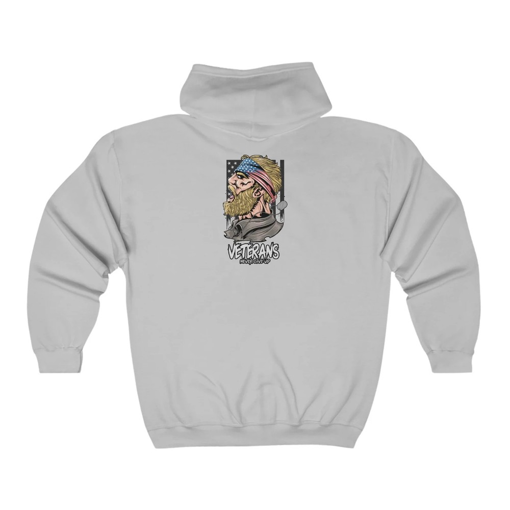 This Full Zip classic fit Hoodie is designed for veterans and features a back print design. Made of high-quality materials, it offers comfort and durability. Stay warm in style while showing support for our brave Veterans. Overview; The classic comfy zip-up, featuring air-jet spun yarn for a softer fleece with reduced pilling. Once put on, it will be impossible to take off. Durable silver-colored metal zipper with metal puller. This heavy blend hooded sweatshirt is relaxation itself. Made with a thick blend of cotton and polyester, it feels plush, soft and warm, a perfect choice for any cold day. In the front, the spacious kangaroo pocket adds daily practicality while the hood's drawstring is the same color as the base sweater for extra style Points. Fabric; Made with a medium-heavy fabric (8.0 oz/yd² (271 g/m²)) that consists of 50% cotton and 50% polyester for that cozy feel and warmth you need in a Hoodie. Fit; The classic fit along with the pouch pocket make for a highly comfortable, scratch-free wearing experience. Adjustable hood with self-colored woven cord and buttonhole openings for the Cord. Fabric blends; Heather Sport colors -may contain more than 50% polyester.