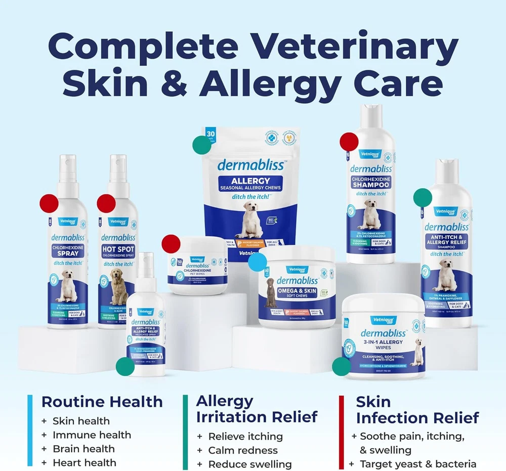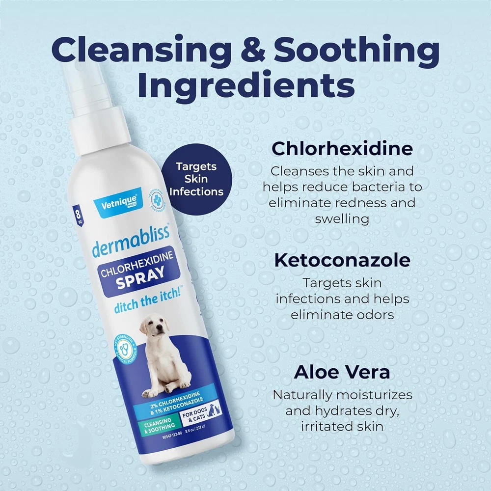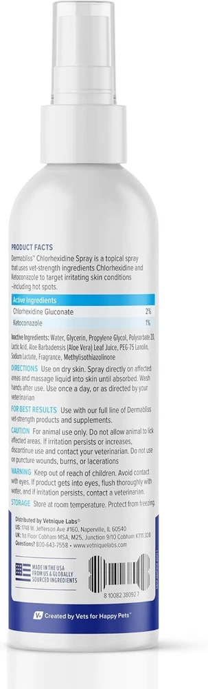 Vetnique Dermabliss Medicated Chlorhexidine Antiseptic 8oz, Spray Product Details Item Weight: 9.9 ounces Manufacturer: Vetnique Labs Item model number: DBSP-ABAF8OZ-2 Item Package Dimensions L x W x H: 7.87 x 1.77 x 1.65 inches Brand Name: Vetnique Labs Target Audience Keyword: dogs Directions: Use as directed on label Model Name: DBSP-ABAF8OZ-2 Color: Medicated Spray Size: 8oz Age Range Description: All Life Stages Specific Uses for Product: Coat Package Dimensions : 7.87 x 1.77 x 1.65 inches; 9.91 ounces Item model number : DBSP-ABAF8OZ-2 Manufacturer : Vetnique Labs VETERINARY STRENGTH FORMULA - Dermabliss Chlorhexidine Antiseptic Spray contains 2% Chlorhexidine and 1% Ketoconazole to target the most common types of skin infections and irritations. CONVENIENT VET-STRENGTH SPRAY - Dermabliss Medicated Spray is vet-formulated for skin issues in dogs and cats and comes in an easy-to-use formula for pet parents. Apply daily to help relieve skin irritation between baths! SOOTHING & EFFECTIVE - Our vet-strength spray combines soothing Aloe Vera with active ingredients to provide a simple solution for supporting your cat or dog’s skin problems without causing further irritation. SAFE FOR DOGS & CATS - Dermabliss Chlorhexidine Spray is safe to use on dogs and cats of all ages. For complete support, use with Dermabliss Chlorhexidine Wipes and Shampoo, with daily Dermabliss seasonal allergy supplements. CREATED BY VETS FOR HAPPY PETS - Our Dermabliss vet-formulated spray and all Vetnique Labs products are created with the health and well-being of pets in mind, MADE IN THE USA from globally sourced ingredients, and recommended by veterinarians worldwide.