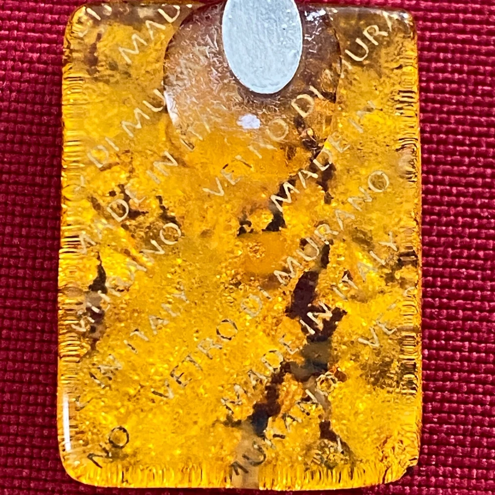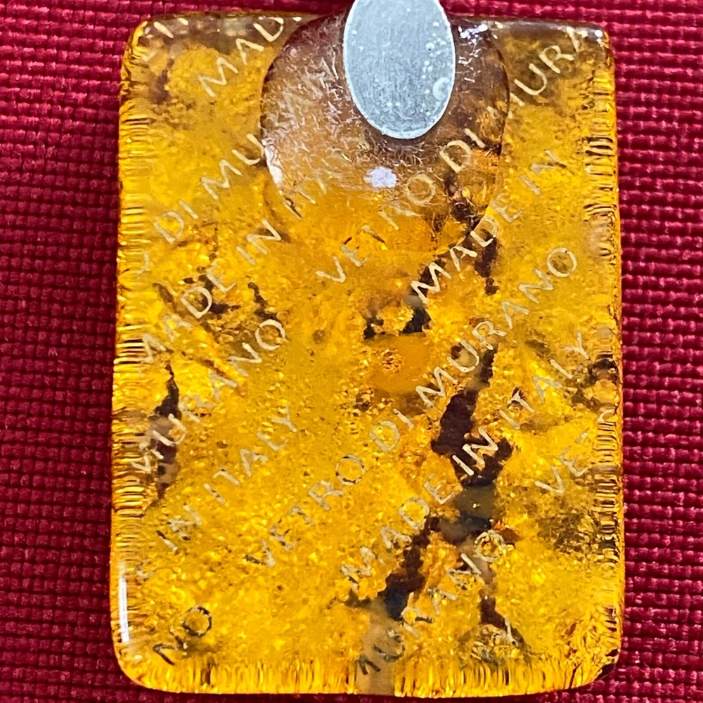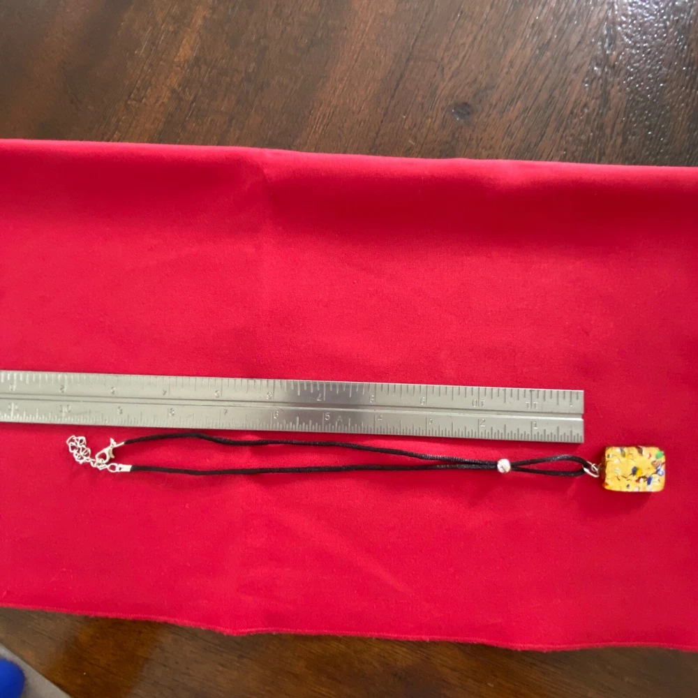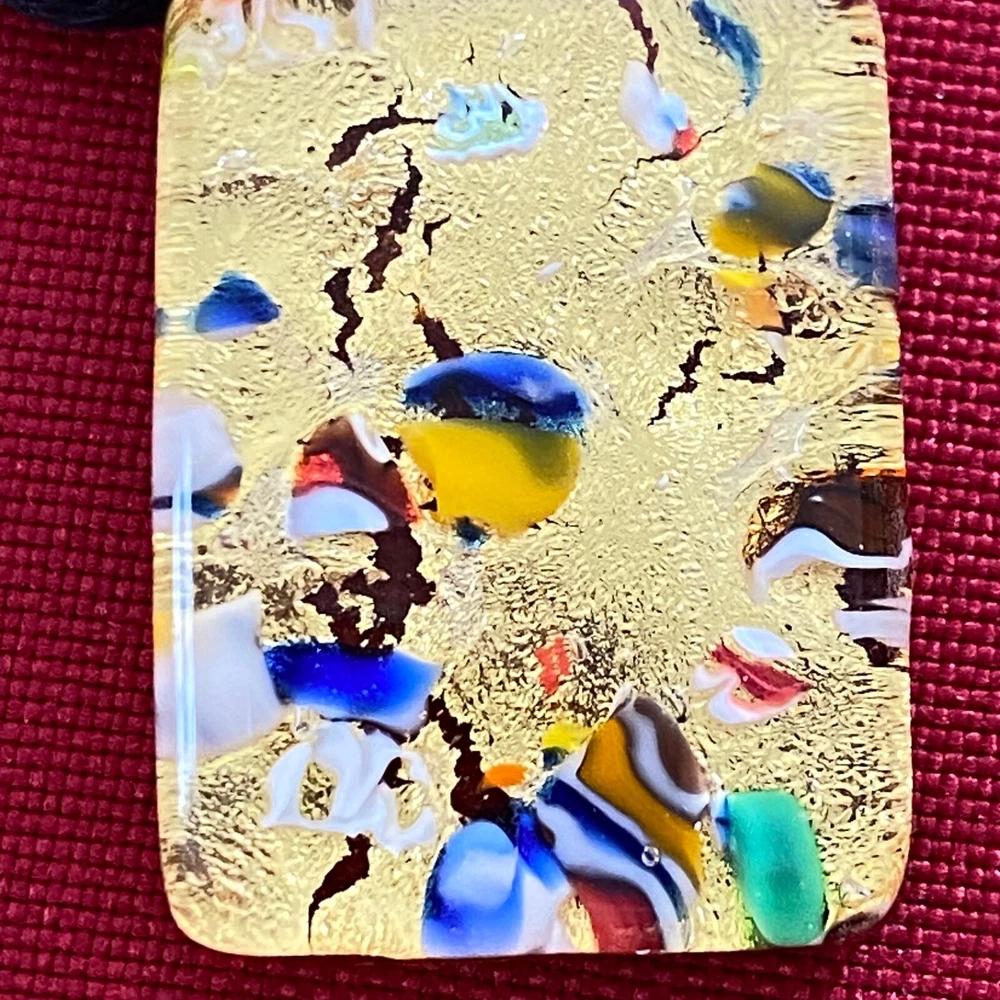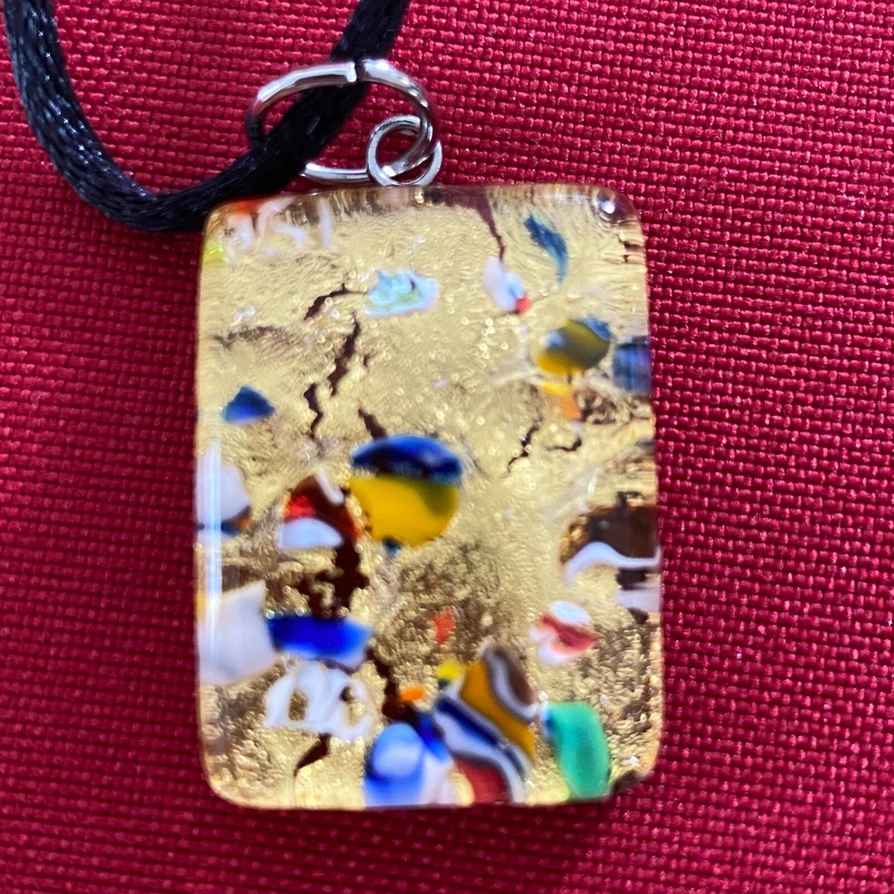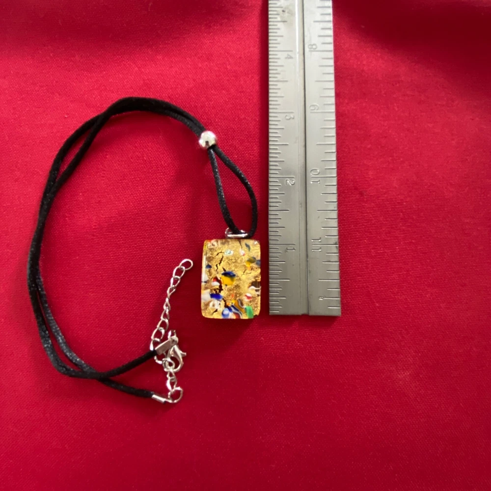 Vetro Di Murano Gold Glass Pendant Necklace with Millefiori Chips 9" Black Cord. This very nice pendant necklace would be a wonderful addition to your jewelry collection. It is in very nice condition with no chips or cracks. Its has a lobster claw clasp and an adjustable 9" black cord. Thank you for taking a look.