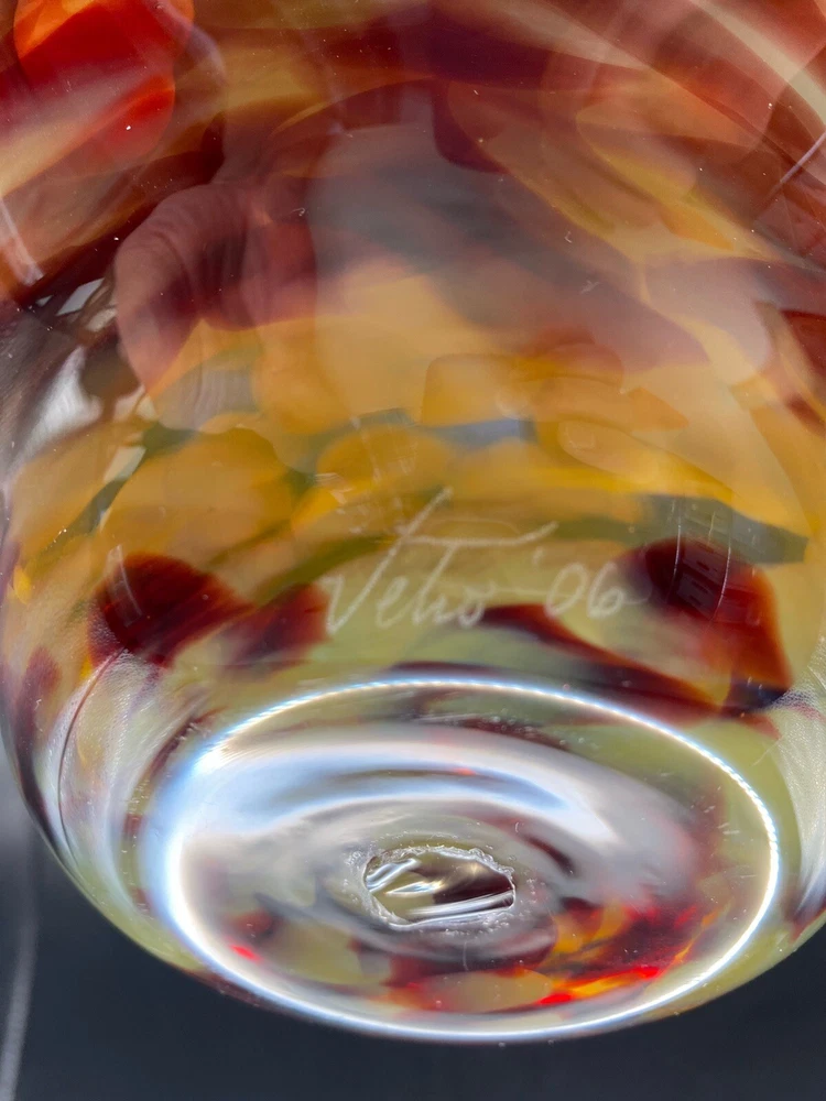 Vetro Handblown Art Glass Flared Bowl~Brown-Copper Swirl~Signed & Dated. Flared bowl with brown and copper swirls. 8 inches across. Photo # 6 shows Vetro & ‘06. In nice condition. No damage detected