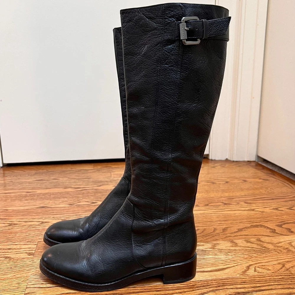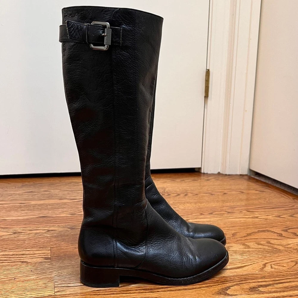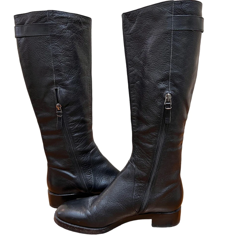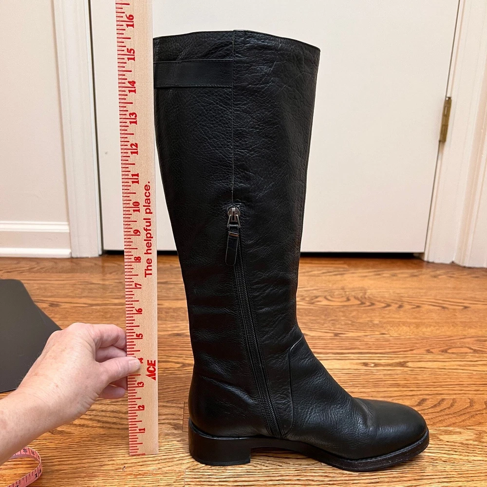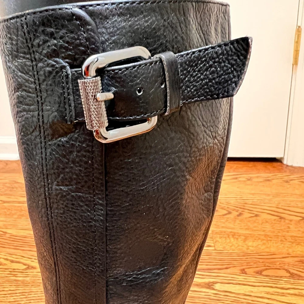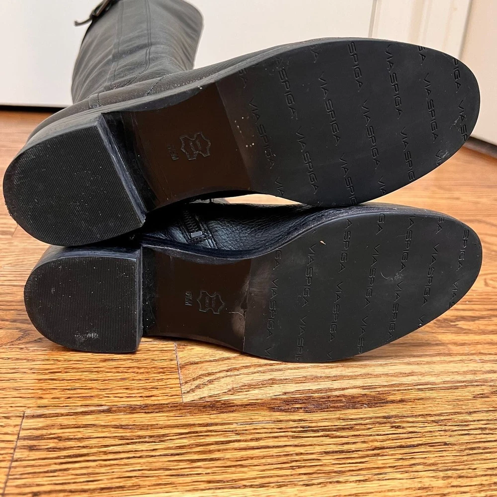 Via Spiga Tall Black Leather Riding Boots Sz 6.5 with Silver Buckle Hardware Good pre-owned condition. Some scuffs to the leather. See pics for details and measurements. Tags: riding, horse, equestrian, preppy, minimalist, neutral, fall, winter