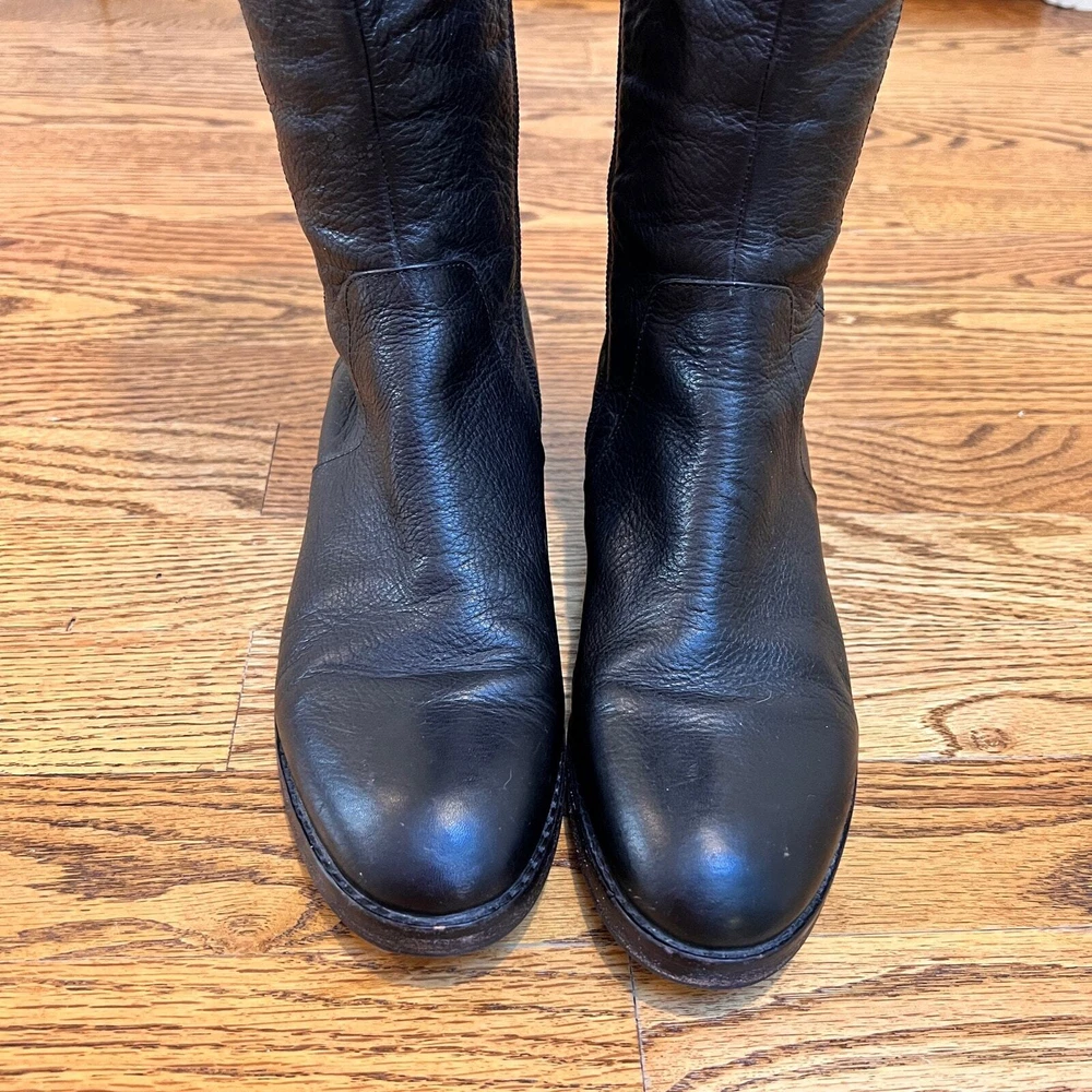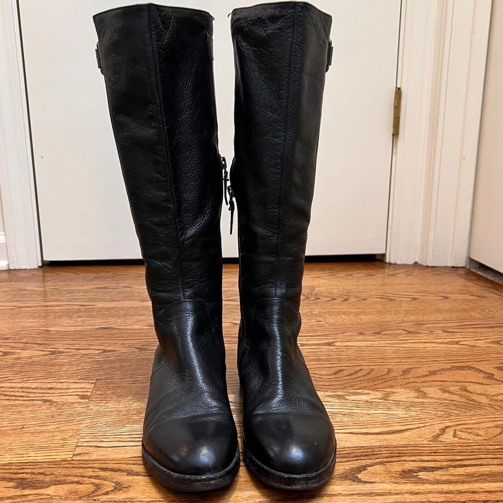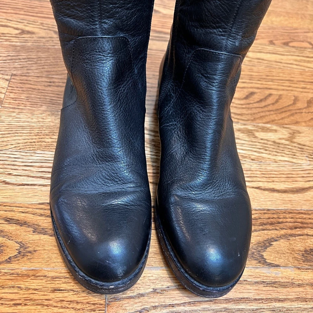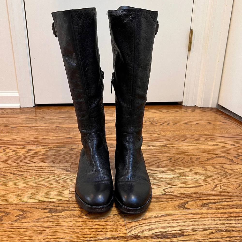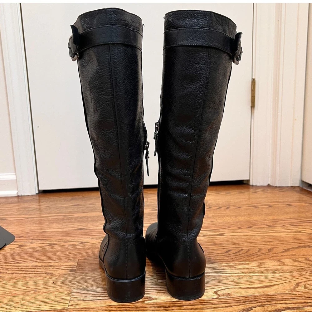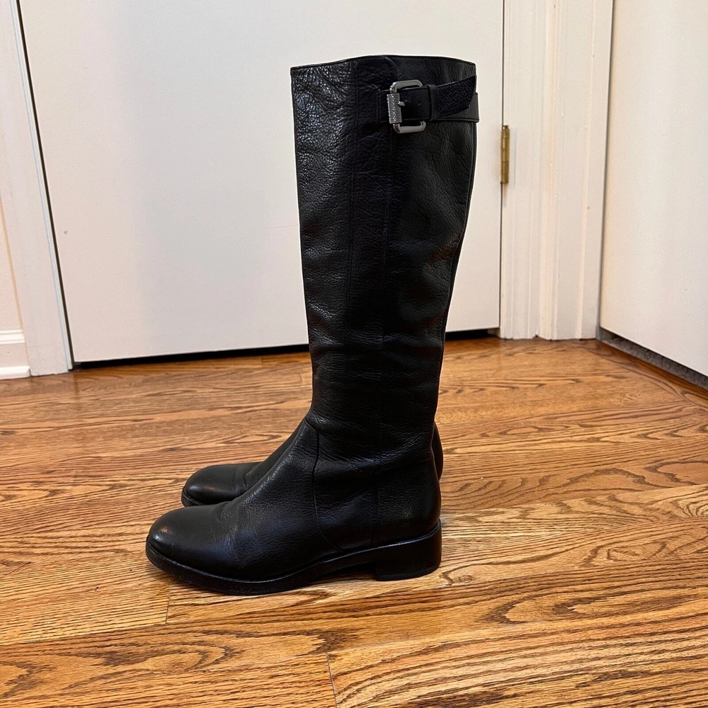 Via Spiga Tall Black Leather Riding Boots Sz 6.5 with Silver Buckle Hardware Good pre-owned condition. Some scuffs to the leather. See pics for details and measurements. Tags: riding, horse, equestrian, preppy, minimalist, neutral, fall, winter