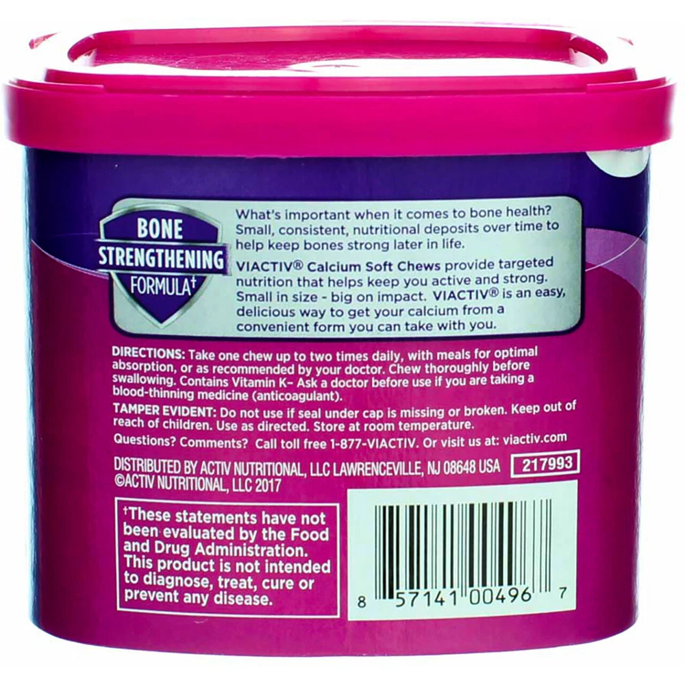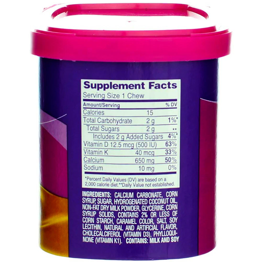 Product Description Two soft chews provide 100% of the daily value of calcium plus vitamin D3 and K, in a delicious convenient form you can take with you. Calcium: Helps maintain healthy bones. Vitamin D3: Boosts calcium absorption. Vitamin K: Helps in formation of bone proteins. Adequate calcium and vitamin D as part of a healthy diet, along with physical activity, may reduce the risk of osteoporosis in later life. Natural and artificial flavors. These statements have not been evaluated by the Food and Drug Administration. This product is not intended to diagnose, treat, cure or prevent any disease. Product Description Two soft chews provide 100% of the daily value of calcium plus vitamin D3 and K, in a delicious convenient form you can take with you. Calcium: Helps maintain healthy bones. Vitamin D3: Boosts calcium absorption. Vitamin K: Helps in formation of bone proteins. Adequate calcium and vitamin D as part of a healthy diet, along with physical activity, may reduce the risk of osteoporosis in later life. Natural and artificial flavors. These statements have not been evaluated by the Food and Drug Administration. This product is not intended to diagnose, treat, cure or prevent any disease. Disclaimer The product descriptions and instructions provided by Vitabox are for informational purposes only and are qualified in their entirety by the information available from manufacturers of the products. You should carefully read all product packaging, and contact the manufacturer with any questions before using a product. While we endeavor to ensure that product descriptions are current, manufacturers sometimes change their products. We are not liable for inaccuracies or misstatements about products. We do not provide medical advice or recommendations. You should not use the information provided by Vitabox for diagnosing or treating a health problem or disease. If you have or suspect that you have a medical problem, immediately contact your health care provider. Information and statements regarding dietary supplements have not been evaluated by the Food and Drug Administration or any other government agency and are not intended to diagnose, treat, cure, or prevent any disease.