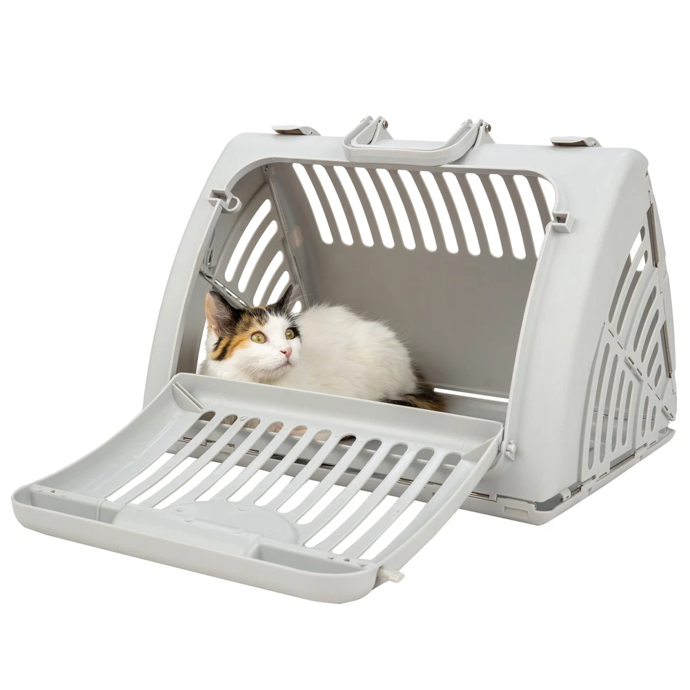 Pets crave a place to call their own so why are so many cat carriers essentially dog crates scaled down? The Vibrant Life plastic gray foldable cat carrier solves the problem with a design focused on keeping cats calm and collected while they're on the go, all while being simple to assemble and stow away when not in use for you. The unique tent-like shape creates a naturally cozy haven for your cat with plenty of grills and vents on all sides so that your pet can feel comfortable surveying their surroundings. It's easy to clean once the trip is over thanks to the door's wide design. A comfortable grip handles make a pleasant experience for you as well. Help your pets live the Vibrant Life! Our products are specially crafted with one goal in mind, seeing your pet at its very best. With a variety of offerings designed to keep animals healthy, happy, and energized, Vibrant Life stands out as the brand that truly puts your pet first. Vibrant Life Foldable Plastic Travel Cat Carrier, Gray, One Size Folds down neatly for storage in your closet or on a convenient shelf, yet set up in a cinch whenever you need to travel with your feline sidekick. it's a quick, cozy carrier for on-the-go The plastic and steel construction offers a long life of use, and the sturdy door has a single-motion door lock – it stays securely shut, but opens easily for you An extra large opening with a removable door makes cats feel comfortable walking into the carrier The unique triangular shape makes for a cozy lounging area for your cat, yet it has plenty of built-in slats and vents so your pet always has a complete, calming view of his surroundings Large opening and sturdy plastic make this carrier easy to clean with a damp cloth, soap, and water This carrier measures: 15.25” L x 18.5” W x 14.25” H 7.0 and holds one or more cats from extra small up to 25 LBS Easy walk-in and out carrier door makes it easy to use as an indoor home and allows your cat to become acclimated to the carrier before traveling The Vibrant Life gray cat carrier is the perfect sanctuary for your pet