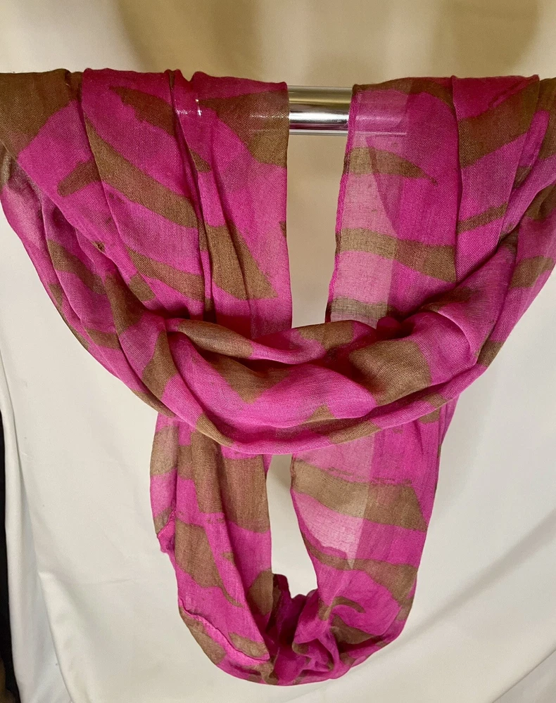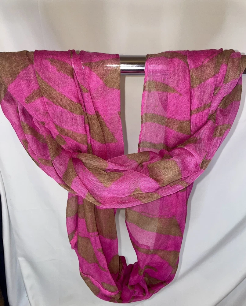 Description: Add a pop of color to your outfit with this gorgeous pink and brown striped infinity scarf. Perfect for layering during all seasons, this lightweight scarf combines comfort and style effortlessly. • Style: Infinity scarf • Color: Pink with brown stripes • Material: Soft and breathable fabric (feels like chiffon or lightweight polyester) • Length (circumference): Approximately 62 inches • Condition: Pre-owned in excellent condition with no visible tears or stains. Only used once! This scarf is perfect for casual wear, travel, or accessorizing your outfits with a bold, vibrant look.