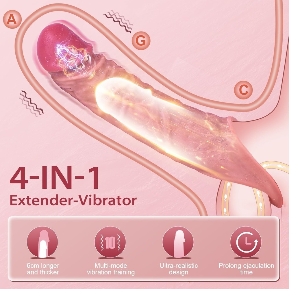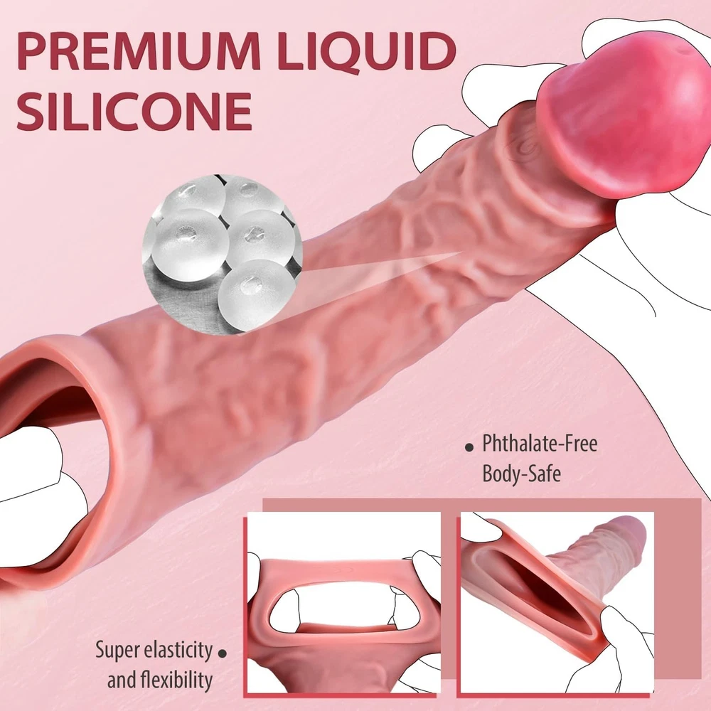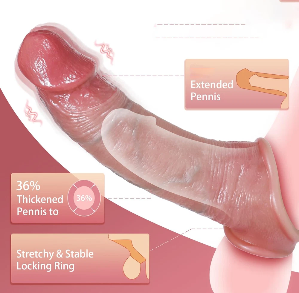 Vibrating Penis Extender Sleeve Cock Ring Sheath Vibrator Sex Toy for Men Couple <> <> <> Increase length and girth: Our penis sleeve can increase your length by 2.36in and increase the girth by 33%. It can better stimulate the C-spot and G-spot, allowing you and your partner to have a more intimate contact. It is a penis enlarger that can enhance erection and enlarge your penis Realistic and huge size: This male sex toy for men is exquisitely made with realistic textures, realistic veins on the penis sleeve, and a lifelike large glans, giving you a more realistic feeling when using it, and the huge 8.5-inch size allows you and your partner to enjoy closer stimulation Delay ejaculation and enhance erection: The Cock Sleeve has a thickened testicle penis ring that prolongs your erection time and delays ejaculation by restricting blood circulation in the right position, allowing you to last longer and enjoy more pleasure between couples Skin-friendly material and easy to clean: This penis extender uses reusable liquid silicone material, which is safe and environmentally friendly, super soft, tasteless and odorless. The soft and skin-friendly material brings a natural and real experience, and when used with lubricants, it has a smooth and soft feeling. The silicone material is washable and easy to clean, allowing you to use it unscrupulously at any time and in any occasion Discreet Package Shipping: We are committed to protecting your privacy through discreet packaging to ensure that no sensitive information is disclosed during shipping. When you purchase this penis enlargement sleeve, you can enjoy a powerful, confidence-boosting pleasure experience while getting a secure shopping guarantee