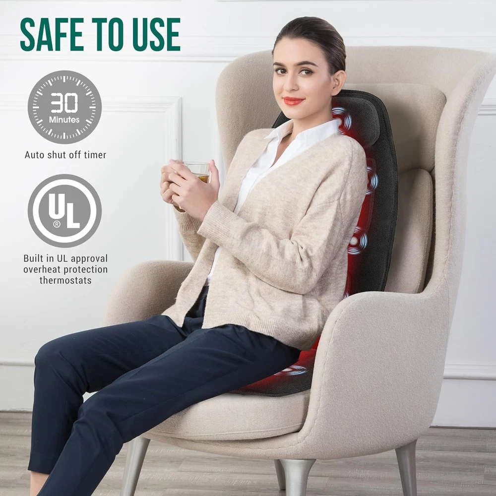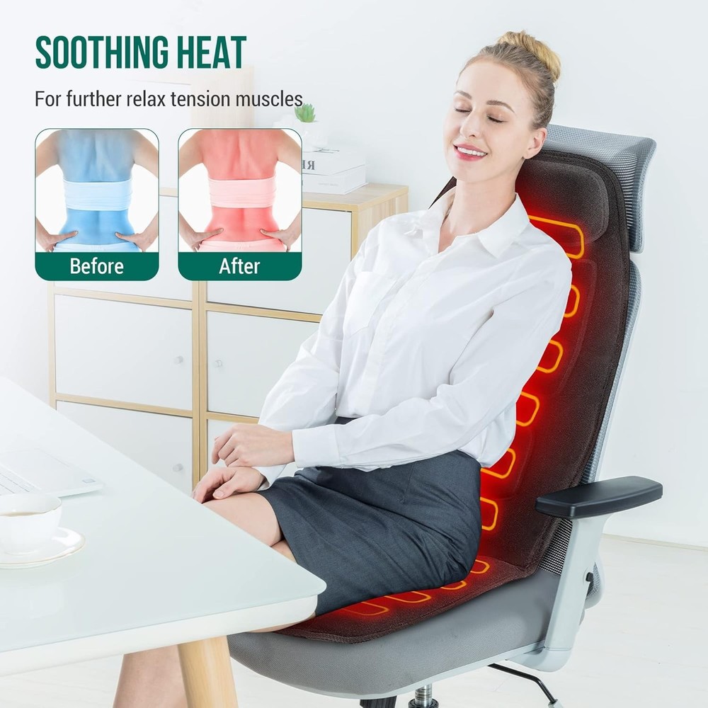 Vibration Back Massager with Heat, APP Control, Massage Seat Cushion with Extra Memory Foam Support Pad in Neck and Lumbar, 10 Vibration Massage Motors, 2 Heat Levels, Gifts Note: This is only a VIBRATION massager, not a Shiatsu Kneading massager. Do not buy this vibration back massage pad if you are looking for a shiatsu massager with rolling balls. Smart Application: This massage chair pad can connect "" APP to start a new smart healthy life and easily by operating your smart mobile . The default setting is 15 minutes to complete a cycle. It is recommended to use this massager up to 3 cycles a day only. Vibration Massage -The back massager with 10 powerful vibrating motors (8 spot for back and 2 for thighs ) and heat function, provides soothing gentle massage for back,thighs to help relieve muscle stress,tension. A PERFECT GIFT for Mothers day, Fathers day or birthday gift Christmas gift for your loved ones. Fast Heating & Safe - The seat warmer has 2 heat levels for full back and seat area, provides heat for back and hips, thighs. The back heater and seat heater can work separately. Fast heat-up, overheating protection system and 30-minute auto shut-off for safe use. Soft Plush Fabric & Non-Slip - This seat cushion cover is made of 100% ultra cozy plush, soft polyester that offers a comfortable and great feeling for body touch. Non-Slip rubber bottom, STAYS IN PLACE: Dual adjustable strap goes around back of chair seat to keep cushion stable and secure. Heated Vibration Back Massager With App Control
