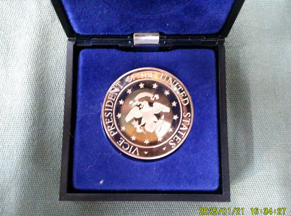The product is a Vice Presidential Seal challenge coin featuring Spiro T. Agnew, who served as Vice President under President Richard M. Nixon from 1969 to 1974. The coin is made of bronze and bears the Presidential Seal, representing the political theme of the Nixon administration. This collectible item was manufactured in the United States, specifically reflecting historical and political significance from that era.