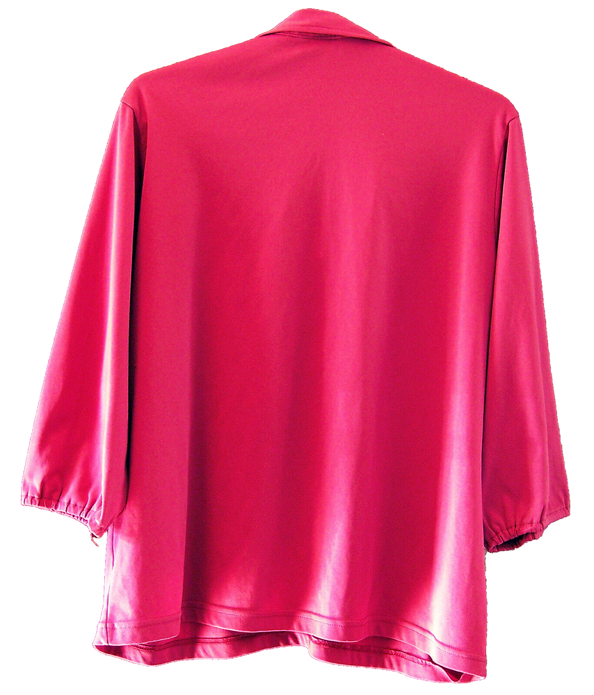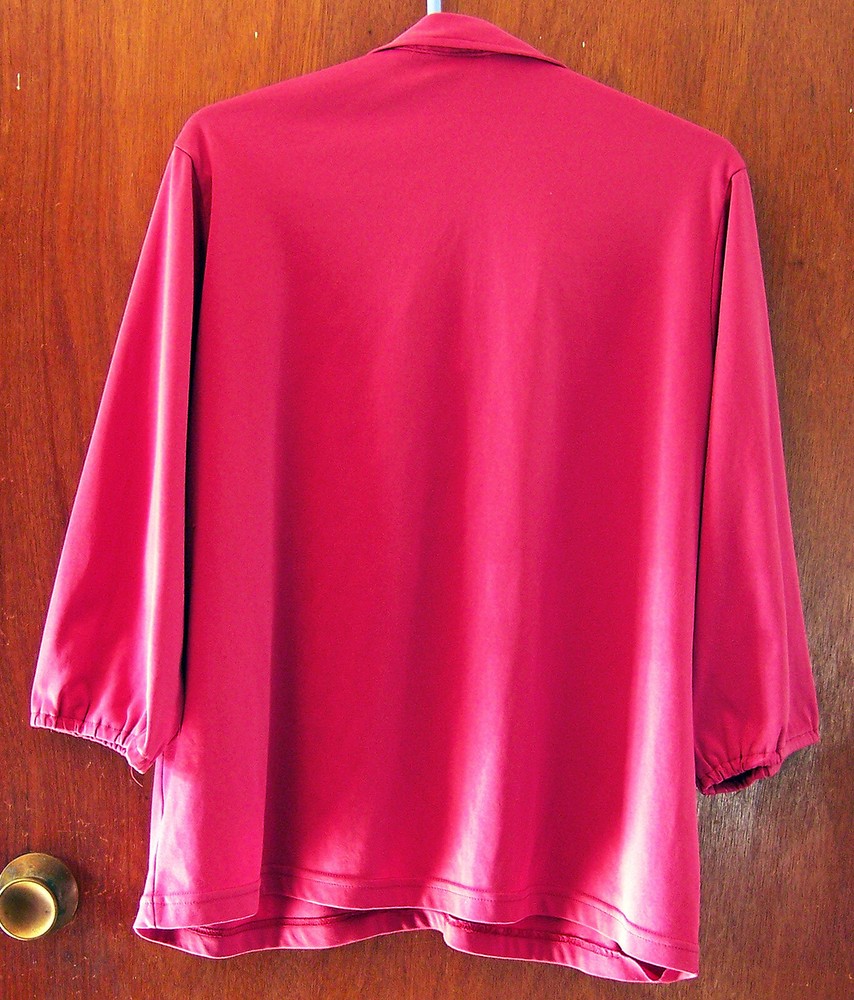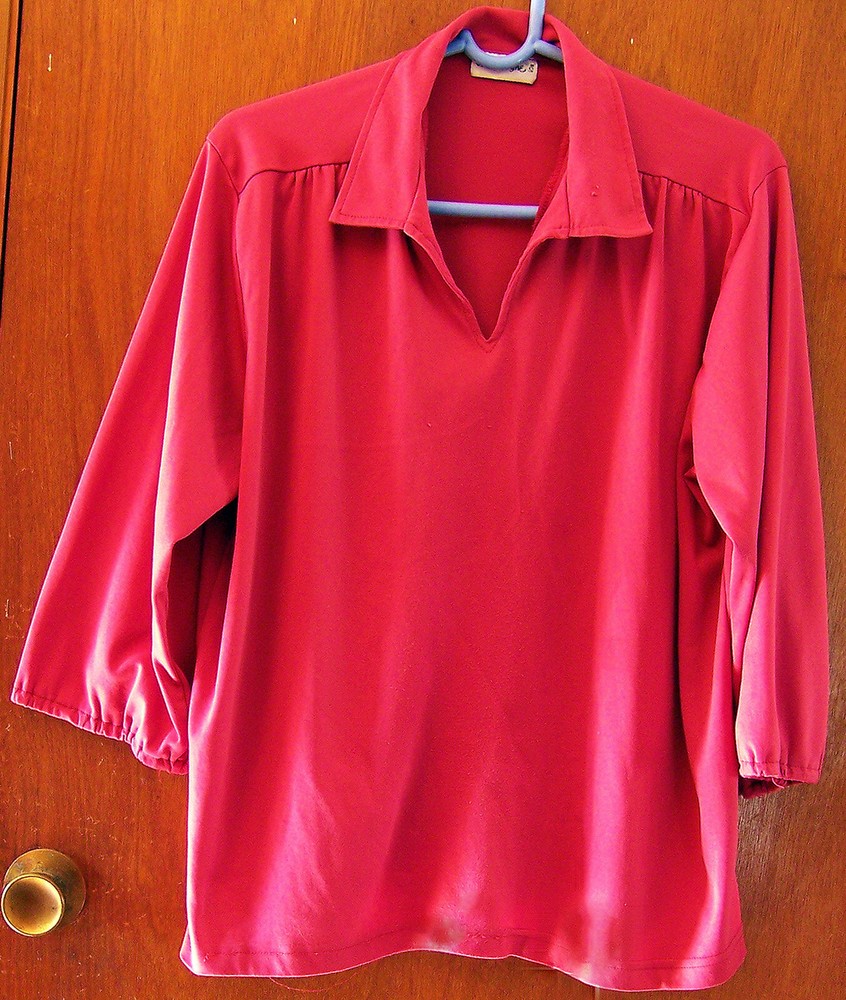 Vicki Wayne Women's Large V-Neck Polo Top Pullover Dark Dusty Pink Polyester Blouse. Size regular women's US L Large. Pullover style top. Length from shoulder seam to bottom hem measures approximately 26" inches. Measures approximately 23" inches across under arm seems. Sleeve measures from shoulder seam to bottom elastic banded hem is approximately 18" inches in length. 3/4 length sleeve style with elastic banded hem. V-neckline with collar. Color is a dark dusty pink. Made of a polyester knit fabric. Used good condition. Note:(collar has two pin wholes from where a brooch had been pinned on it, see close up photo of collar). From a smoke free home. A very good looking top. See photos. (These are my photos of the item and cannot be used for any reason.) I will combine shipping costs when you buy more than one item. Shipping cost is based on your location and weight. If there are any questions please ask before you buy. S ale is final. No refunds.