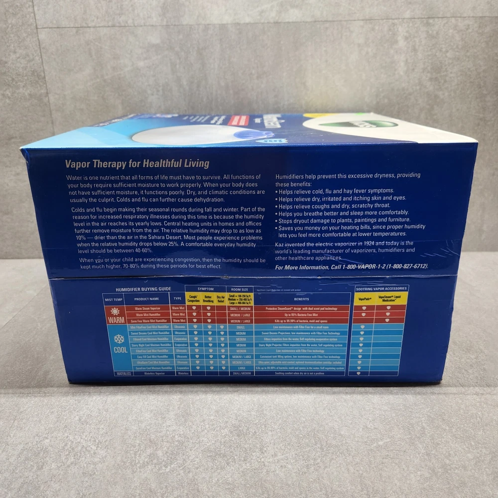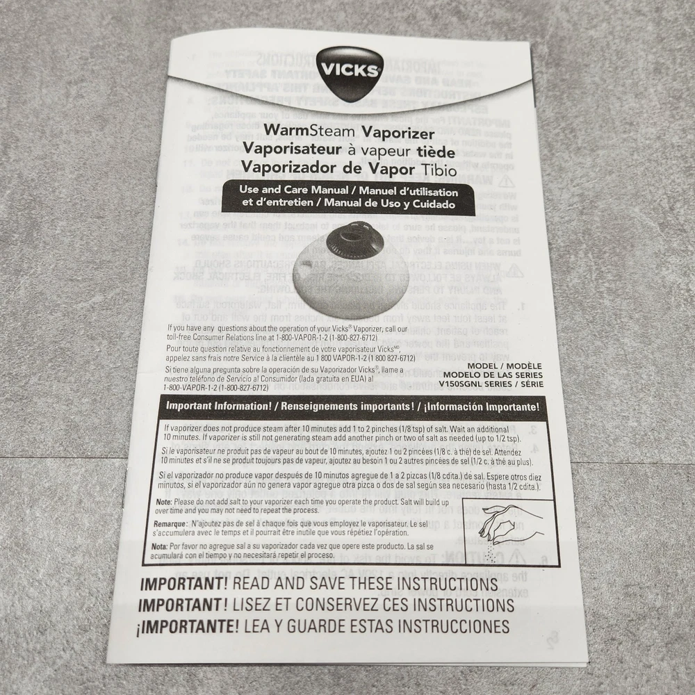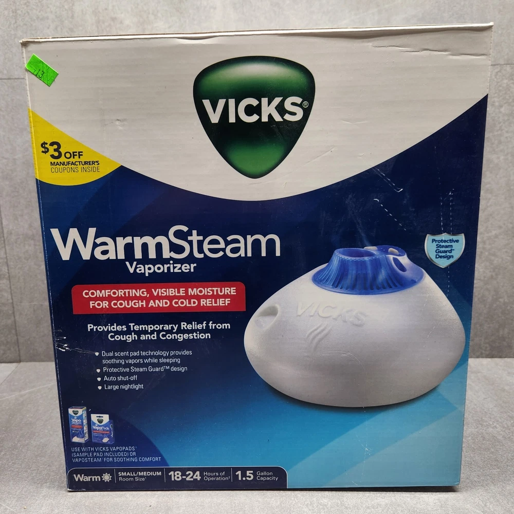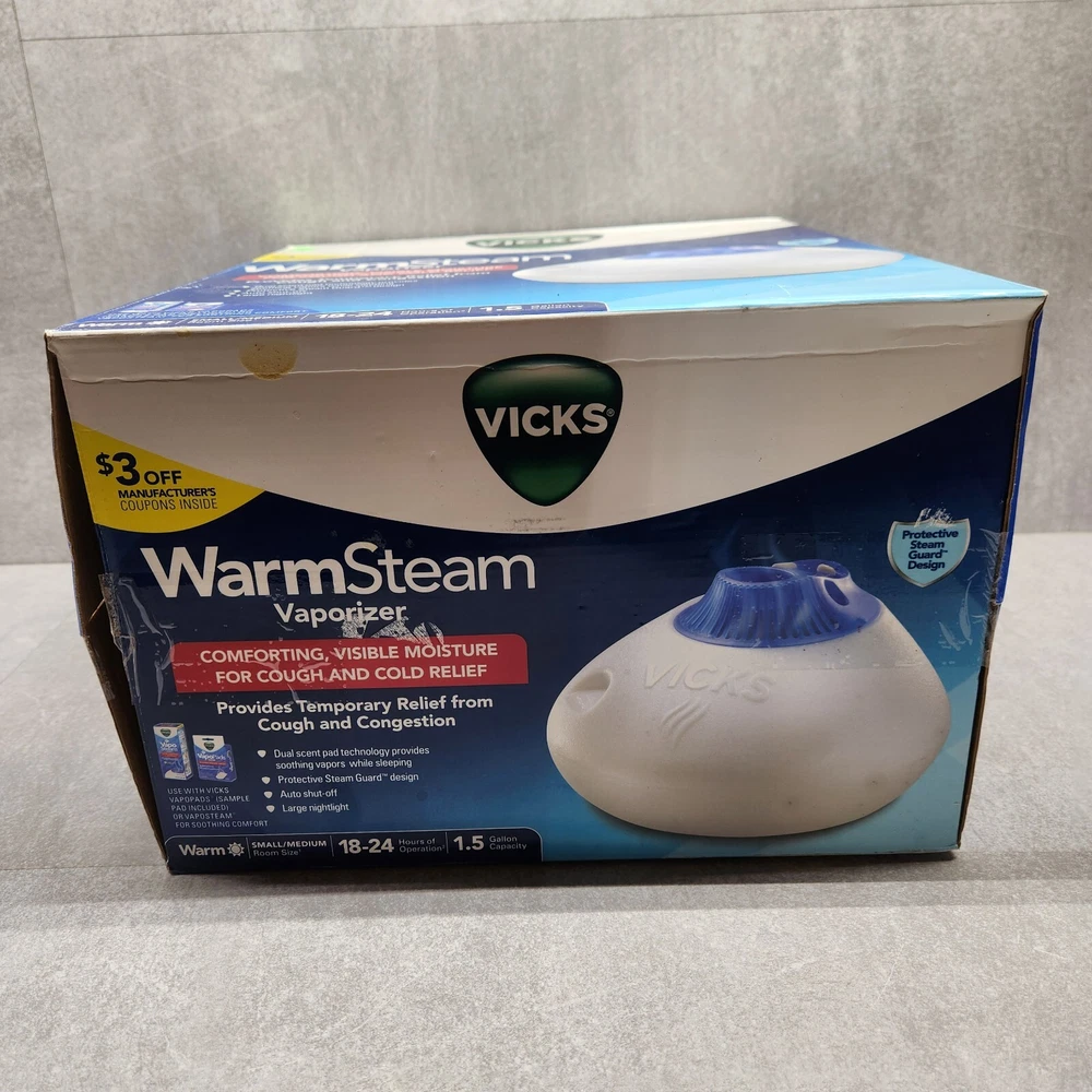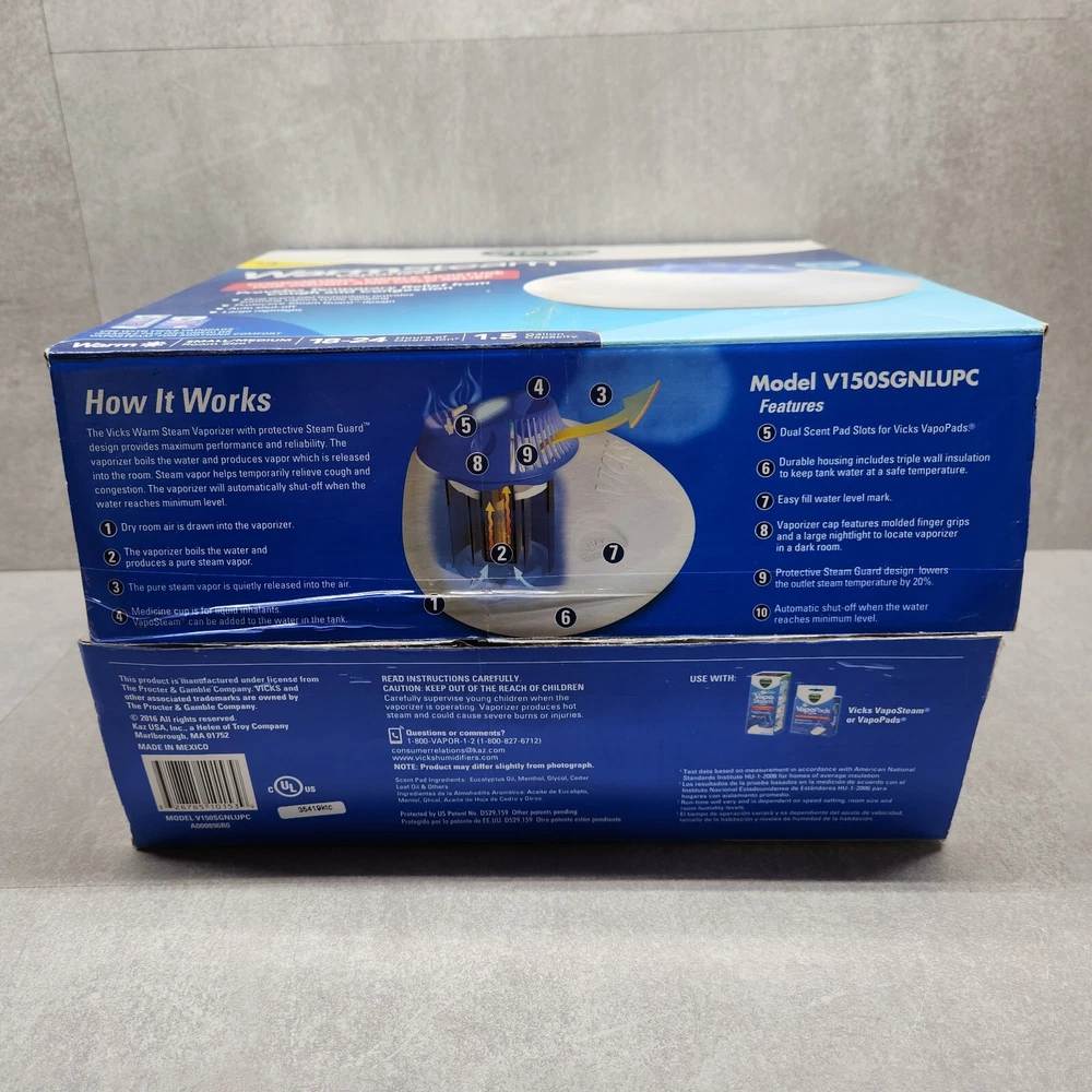 Vicks WarmSteam Vaporizer Humidifier 1.5 Gallon V150SGN, Used with Box, Tested Description: The Vicks WarmSteam Vaporizer provides soothing, visible moisture for temporary relief from coughs and congestion. With a 1.5-gallon tank, this vaporizer runs for 18-24 hours per filling, making it ideal for small to medium-sized rooms. It features dual scent pad slots for use with Vicks VapoPads (sold separately) and an automatic shut-off when the water reaches a minimum level. The unit also includes a large nightlight for easy use in the dark. Key Features: 1.5 Gallon Capacity : Provides up to 24 hours of operation Cough & Cold Relief : Soothing steam helps alleviate congestion Dual Scent Pad Slots : Compatible with Vicks VapoPads for extra comfort Auto Shut-Off : Unit turns off when the water level is low Large Nightlight : Easy to use at night Condition: Used, tested, and in good working condition. Comes with original box and manual. Box shows signs of wear. Shipping: Fast and free shipping! Perfect for adding comfort during the cold and flu season.