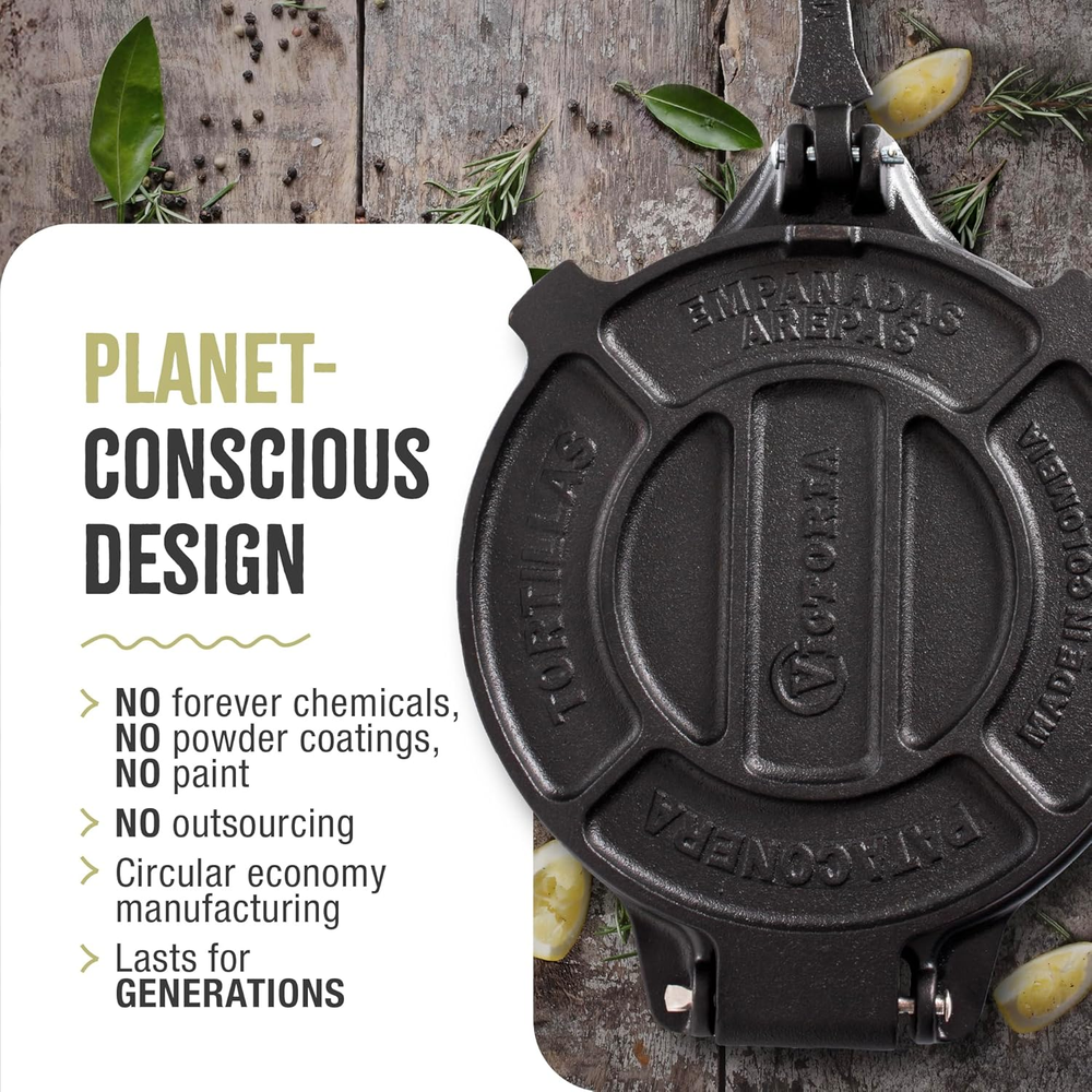 Store New Arrivals Add to Favorite View Feedback Contact Victoria 8 Inches Cast Iron Tortilla Press, Roti Maker and Tortilladora, Pataconera Seasoned with Flaxseed Oil, Made in Colombia Description Item model number TOR-003 Item Weight 8 Pounds Included Components Instruction Manual Color Black Special Feature Manual Brand Victoria Material Cast Iron Number of settings 1 Global Trade Identification Number 00815457020033 Manufacturer Victoria Is Discontinued By Manufacturer No Product Dimensions 10"D x 8"W x 4"H Size 8" CAST IRON TORTILLA MAKER: Our cast iron press is seasoned with non-GMO, kosher-certified flaxseed oil and made without PTFE, PFAS, or other forever chemicals. It has a smaller footprint than traditional wood or steel presses for easier storage. DURABLE MANUAL TORTILLA MAKER: Our professional tortilla press was designed with the user in mind. It features a reinforced design with engineered flat plates that prevent pinching and an ergonomic handle for better resistance. SPECIAL CARE: This pataconera features natural materials without synthetic coatings or paints. Our cookware requires special care and should never be air-dried or put in a dishwasher. Follow the included instructions for proper care and to avoid rust. EASY TO USE: With this tortilla presser, you can make homemade flour, corn, gluten-free, paleo, and wheat tortillas! You can also use it as a quesadilla maker, empanada maker, or roti maker or to make everything from arepas to tostones and more. A LEGACY OF TRADITION: Since 1939, Victoria has crafted high-quality cast iron cookware in our own factories in Colombia. Our circular economy manufacturing process cuts down on waste while producing earth-conscious products that stand the test of time. Product description The video showcases the product in use. The video guides you through product setup. The video compares multiple products. The video shows the product being unpacked. Victoria Tortilla Press Merchant Video 1 PREPARE THE DOUGH 2 PLACE THE DOUGH 3 CLOSE & PRESS 4 OPEN & FINISH 5 CARE INSTRUCTIONS SHOP VICTORIA COOKWARE Available Sizes 3 sizes 6 sizes 3 sizes 3 sizes 4 sizes Round or rectangular Recommended For Tortillas and quesadillas Meat, eggs, and stir-fries Pancakes, pizzas, and fajitas Meat and veggie skewers Roasts, stews, and bread Burgers, bacon, and paninis Free from PTFE and PFOA ✔ ✔ ✔ ✔ ✔ ✔ Oven Uses n/a Broiler and gas Broiler and gas Broiler and gas Broiler and gas n/a Stovetop Uses n/a Induction and ceramic Induction and ceramic Induction and ceramic Induction and ceramic n/a Outdoor Uses n/a Campfire and grill Campfire and grill Campfire and grill Campfire and grill n/a Made in Colombia ✔ ✔ ✔ ✔ ✔ ✔ ABOUT US We offer the best prices around on high quality products. Our E-store includes media such as books, movies, music and games while offering electronics, toys, sporting apparel, clothing, tools, general home, garden items and more. SHIPPING We are always working hard to ensure your package arrives as soon as possible. Please understand that some factors like weather, high postal traffic, and the performance of shipping companies are outside of our control. We offer free shipping to the lower 48 states and ship within 2 business days of payment, usually sooner. We do not accept P.O. Boxes. Please provide a physical address. RETURNS We offer a 30-Day Return Policy on items which you are not completely satisfied with. You have the option for a full-refund or an exchange of the item. No returns are available on items shipped outside of the USA. PAYMENT We accept PayPal. CONTACT US This page content is yet to come Please ad us to your favorite seller and visit again later Thank You CUSTOMER SATISFACTION We try our very best to make sure every customer is completely satisfied. If there's a problem, message us! We're happy to help.