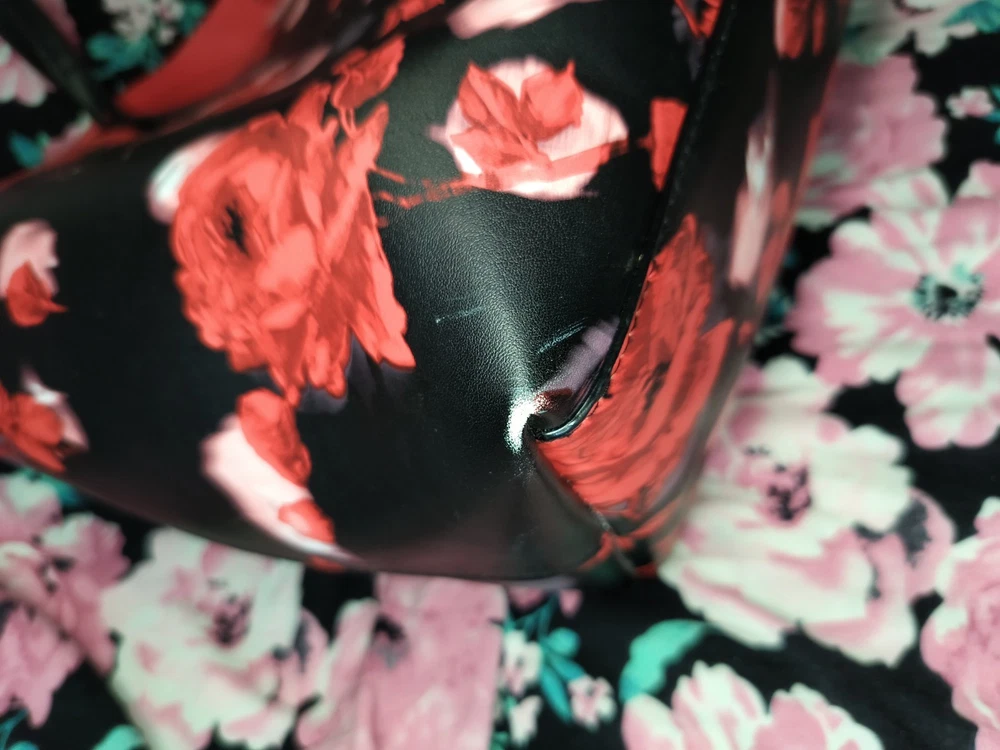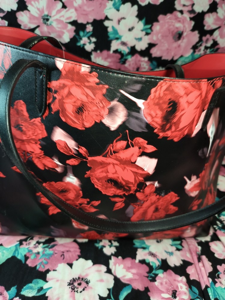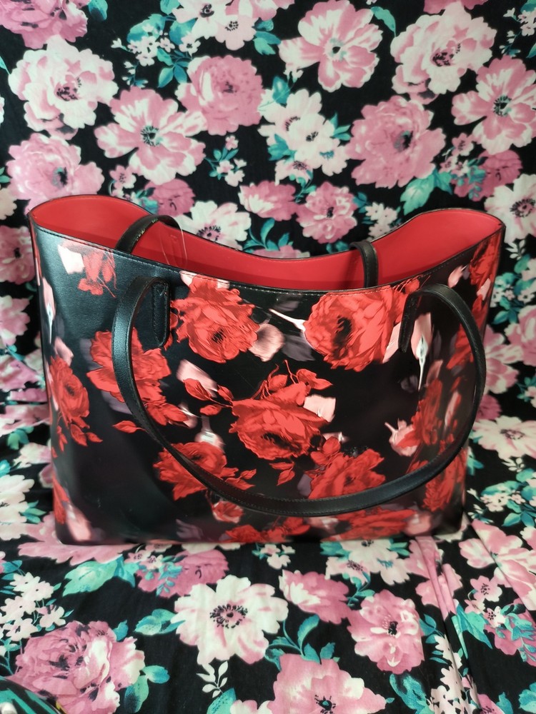 Has some flaws, shown in pictures still has it's original tag. The Victoria's Secret Large Black & Red Rose Floral Printed Tote Bag for 2019 is an exclusive, limited edition handbag designed for travel and casual occasions. The bag features a stylish rectangular shape with a floral pattern in black and red, accented with the Victoria's Secret logo. It has a spacious interior lined with red PVC, and is equipped with double black PVC handles for easy carrying. This tote bag is a fashionable and functional addition to any woman's wardrobe, showcasing the brand's signature style with a trendy flower and logo theme.