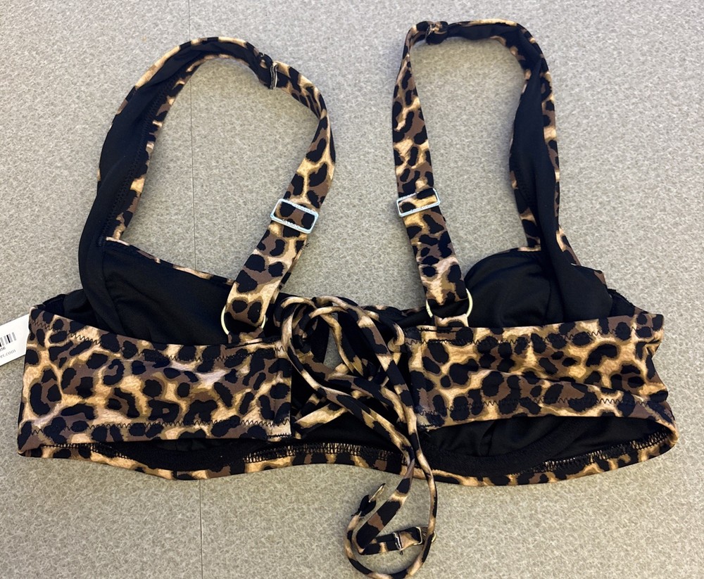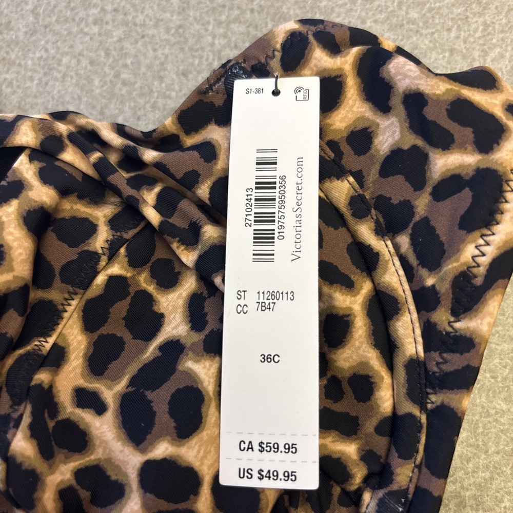 The Victoria's Secret Essential Full-Coverage Bikini Top in size 36C is a stylish and flattering swimwear option for women. Featuring a cute animal print pattern in True Cat color, this one-piece bikini top is made from a blend of recycled polyamide and elastane for a comfortable fit. Perfect for those looking for a regular-sized bikini top with a fun cat theme, this Victoria's Secret top is a must-have for any beach or pool wardrobe.