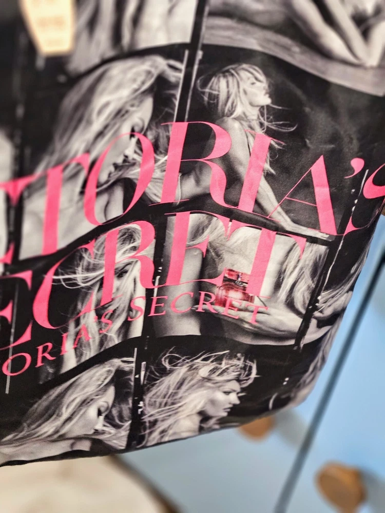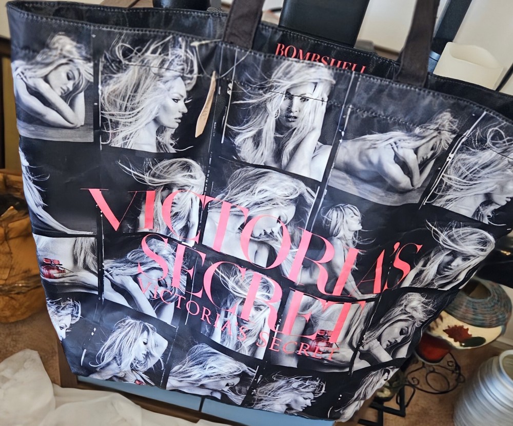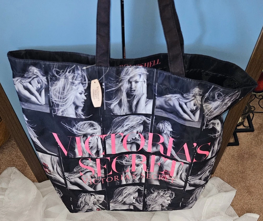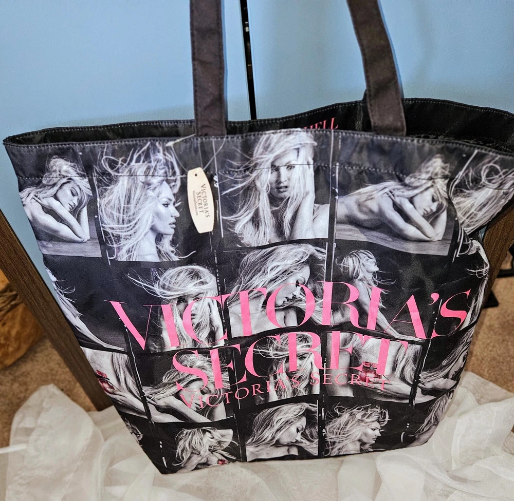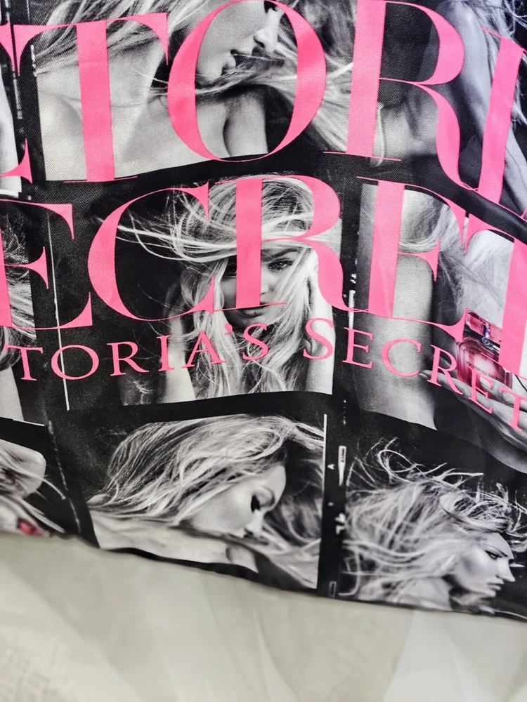 This is a Victoria Secret Large Tote for women, featuring a semi-circle shape with a width of 17 inches and a depth of 8 inches. It is designed with a black polyester exterior and lined with black polyester, making it lightweight and suitable for various occasions such as travel, parties, casual outings, formal events, or business use. The tote includes a shoulder strap for easy carrying, accentuated with strap details and a logo pattern, embodying a love-themed style with Victoria and Angel characters.