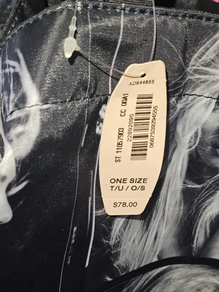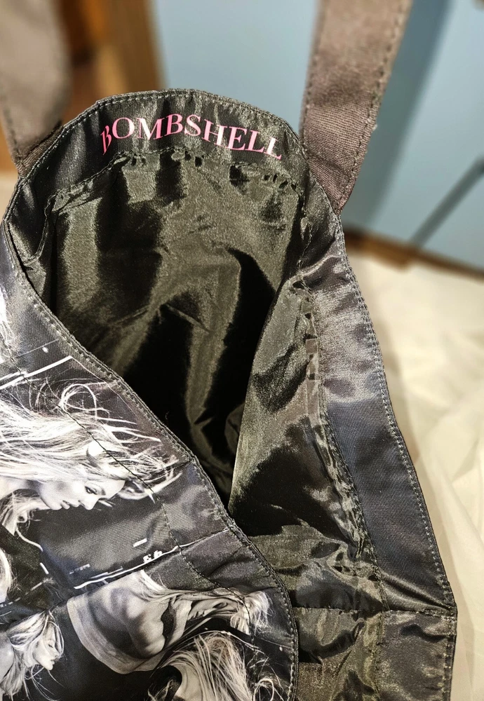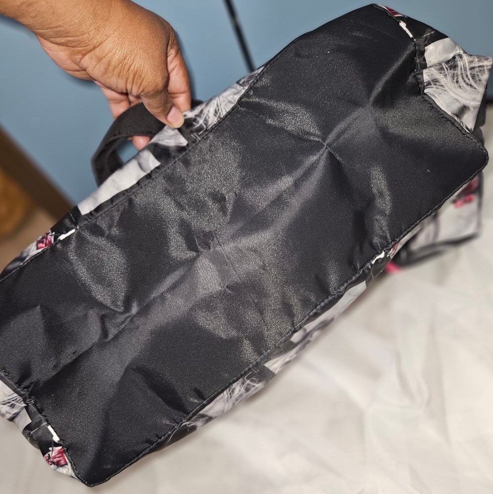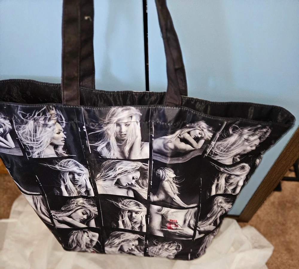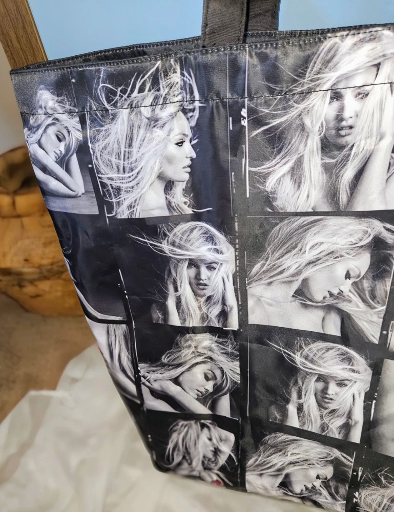 This is a Victoria Secret Large Tote for women, featuring a semi-circle shape with a width of 17 inches and a depth of 8 inches. It is designed with a black polyester exterior and lined with black polyester, making it lightweight and suitable for various occasions such as travel, parties, casual outings, formal events, or business use. The tote includes a shoulder strap for easy carrying, accentuated with strap details and a logo pattern, embodying a love-themed style with Victoria and Angel characters.