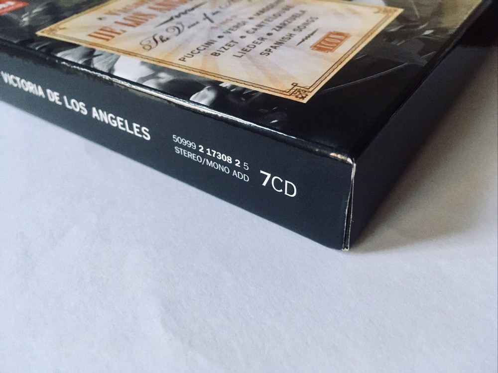 CD1 Operatic arias by VERDI, ROSSINI, MASCAGNI, CATALANI, MOZART, WAGNER & DE FALLA 76.04 Songs by TURINA VILLA LOBOS Bachianas brasileiras No.5 CD2 Excerpts from PUCCINI La bohème VERDI Simon Boccanegra LEONCAVALLO Pagliacci PUCCINI Suor Angelica Gianni Schicchi ROSSINI II barbiere di Siviglia VERDI La traviata PUCCINI Madama Butterfly 75.58 CD3 Excerpts from MASSENET Manon GOUNOD Faust 77.53 MASSENET Werther OFFENBACH Les Contes d'Hoffmann BIZET Carmen CD4 Popular songs by MENDELSSOHN, GRIEG, BRAHMS, DVOŘÁK, HAHN, DELIBES and others 79.48 Zarzuela arias by CHAPI, GIMÉNEZ, CHUECA, SERRANO, LLEÓ, CABALLERO and BARBIERI CD5 Chants d'Auvergne arr. JOSEPH CANTELOUBE 70.33 CD6 Art songs and Lieder by RAVEL, DUPARC, DEBUSSY, HAHN, FAURÉ, SCARLATTI, HANDEL, SCHUBERT, PURCELL, HAYDN, BEETHOVEN, DVOŘÁK, TCHAIKOVSKY, BRAHMS and MOZART 74.32 CD7 Songs of Spain by DE FALLA, MONTSALVATGE, TOLDRÁ, GRANADOS, VALVERDE, NIN and BARRERA/CALLEJA 78.39 Victoria de los Angeles soprano with Jussi Björling Dietrich Fischer-Dieskau Nicolai Gedda Elisabeth Schwarzkopf Alicia de Larrocha Gerald Moore Gonzalo Soriano Miguel Zanetti Sir Thomas Beecham Renato Cellini André Cluytens Rafael Frühbeck de Burgos Carlo Maria Giulini. Vittorio Gui Jean-Pierre Jacquillat Pierre Monteux Giuseppe Morelli Stanford Robinson Gabriele Santini Tullio Serafin. Heitor Villa-Lobos