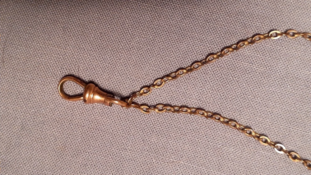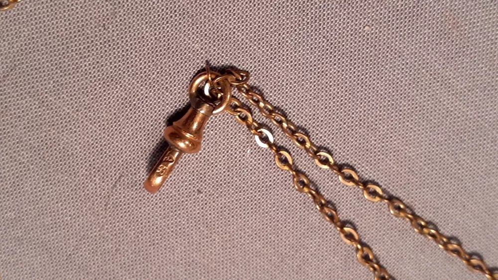 A Victorian ladies watch fob chain with opal slide in very good used condition. It is signed on the hook with an "A" and another symbol. See picture. The chain is 24 inches long. See many photos for complete description and condition.