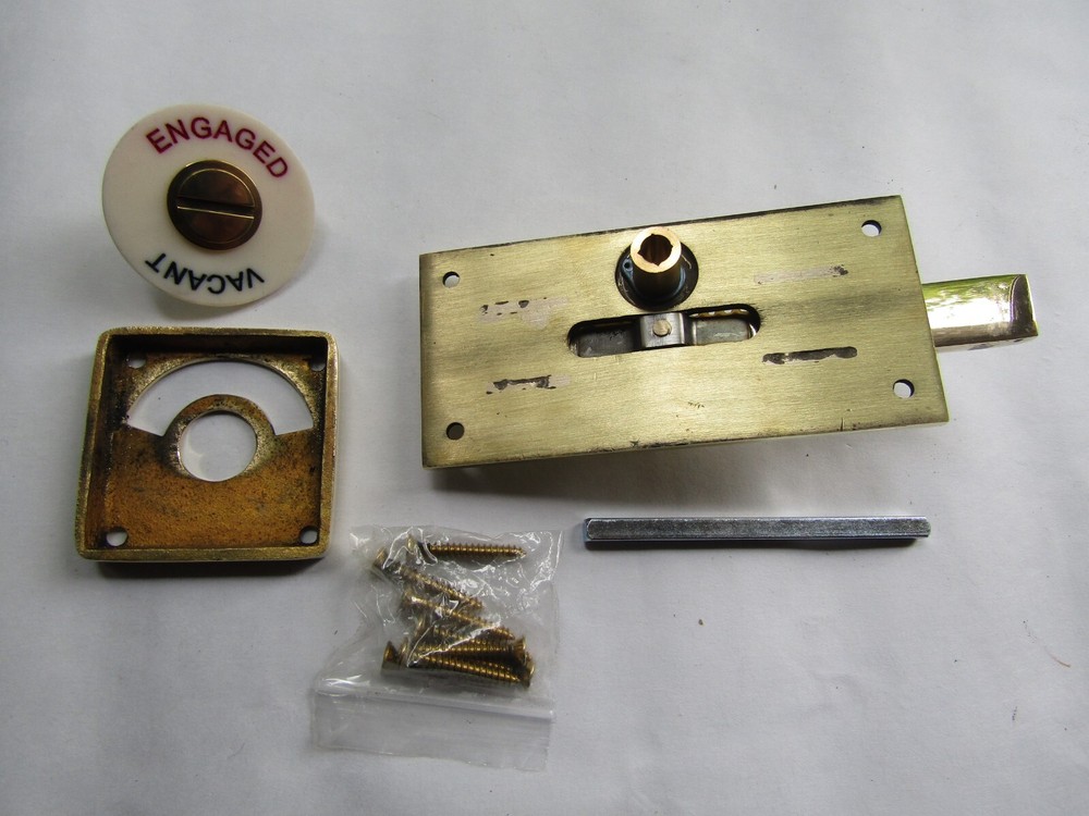 Buckingham washroom indicator bolts are ideal for toilet and washroom cubicles Reproduction of the old pattern Material: Heavy Solid brass Finish: Polished brass Unlacquered will develop own patina with age Main Bolt Body 105mm x 50mm Indicator 50 x 50mm Projection from surface 30mm Spindle 5mm x 80mm Shoot 20mm Bolt designed to slide into wood