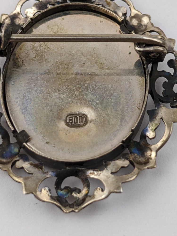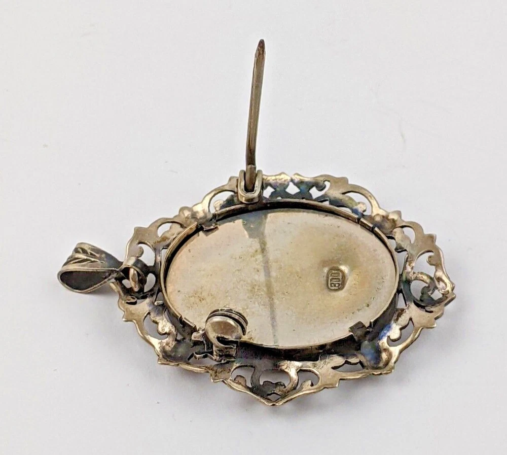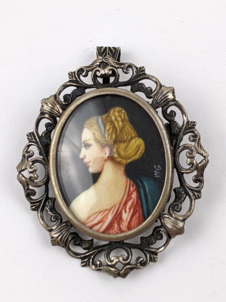 Beautiful antique Art Nouveau early 1900s Hand Painted Portrait Brooch or Pendant combination. The Oval portrait is hand painted and artist signed MG?. It is under a glass crystal and mounted in a wonderful 800 silver filigree frame. This is most likely Italian in origin. It has a locking pin mechanism and a hand chased bail to wear as a pendant. It is clearly marked for 800 silver. The brooch measures 1 3/4" by 1 3/8" and is in excellent well cared for estate condition. The frame has the original appropriate patina. 3202