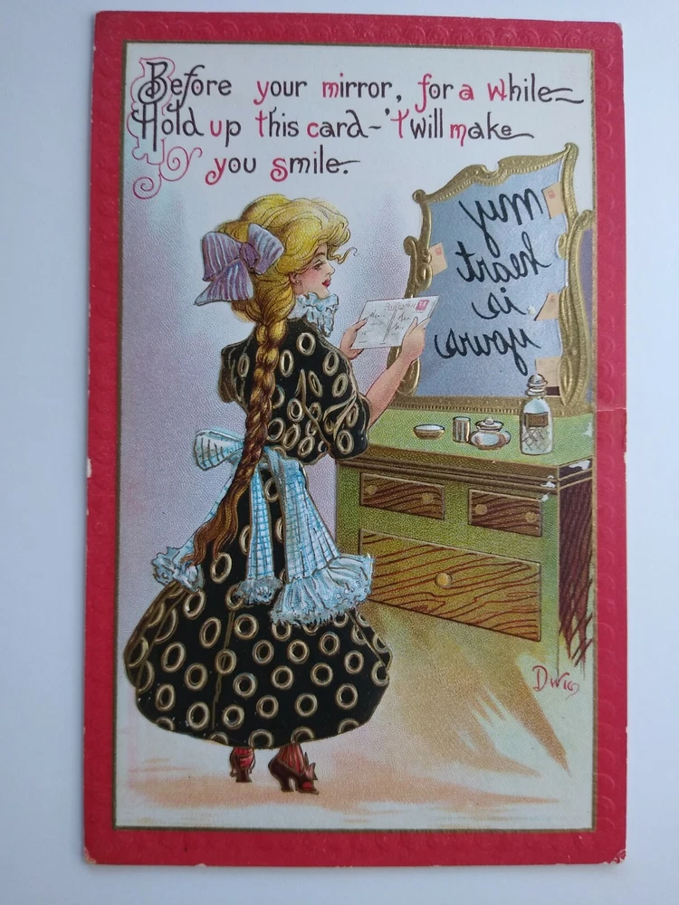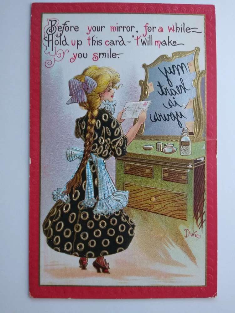 Victorian Postcard Blonde Witch Magic Mirror Dwig Series 30 My Heart Is Yours Original Antique non posted vintage original embossed fantasy postcard. Has edge crease and corner wear. Back has some wear. Artist signed Dwig on bottom. Printed in Germany. Ser. 30 on back. Stock #fan17. Additional vintage Halloween, Santa, Christmas, holiday postcards, are in our store. SHIPPING Bundle and save by using cart and making single payment. International buyers are responsible for any import fees/taxes. ABOUT US Seller of vintage ephemera, collectibles, retro gifts, advertising, artwork, vinyl records, pinball and arcade game flyers and parts, Mad magazines, antique Halloween & holiday postcards, Christmas items, super hero memorabilia, horror themed art, fun stuff. Combine to save by using the cart!
