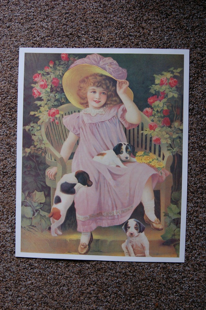Victorian Rose Garden Print 16x20 Girl with Hat & Puppies Wall Art