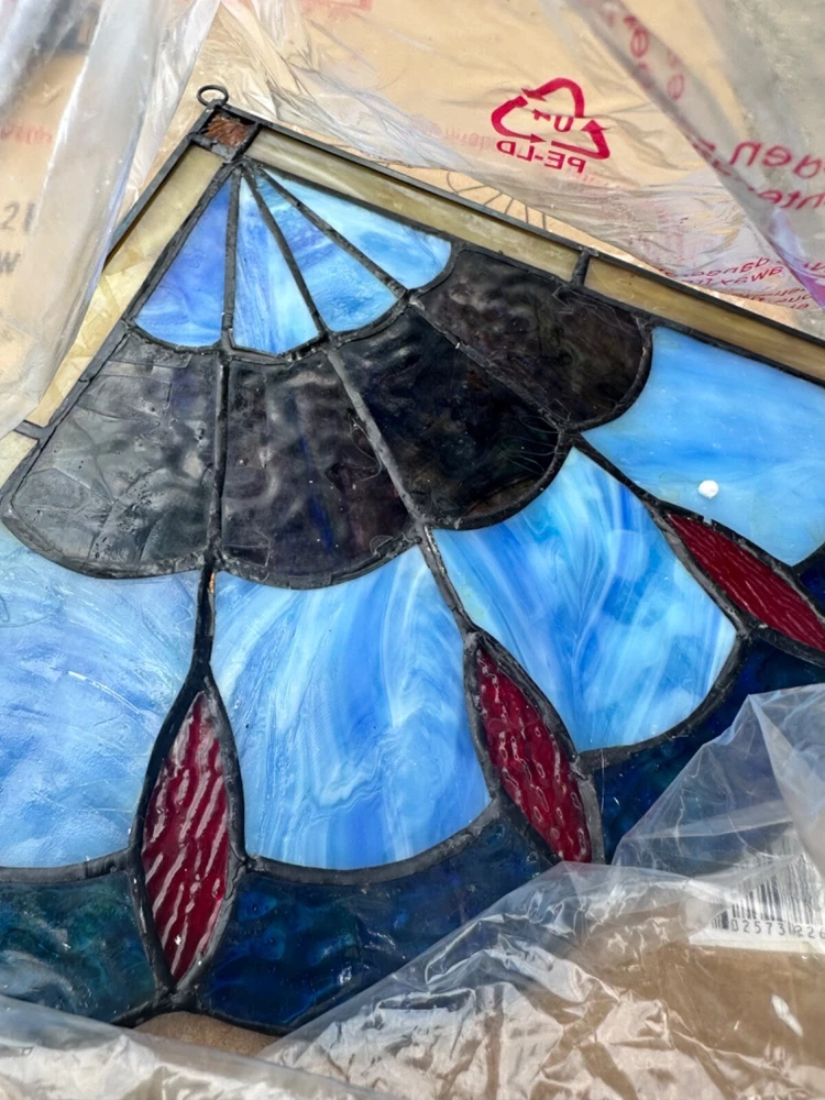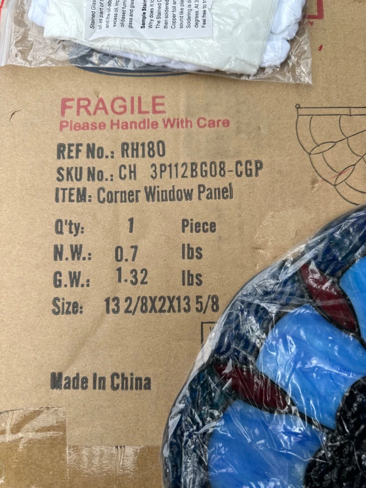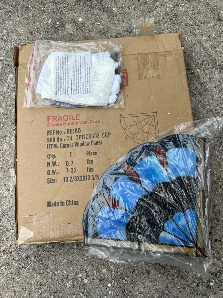 1 corner panel new in box. Victorian Tiffany-Glass Window Panel 8" Wide. Comes with all you see in the photo… Gloves and Care instructions.