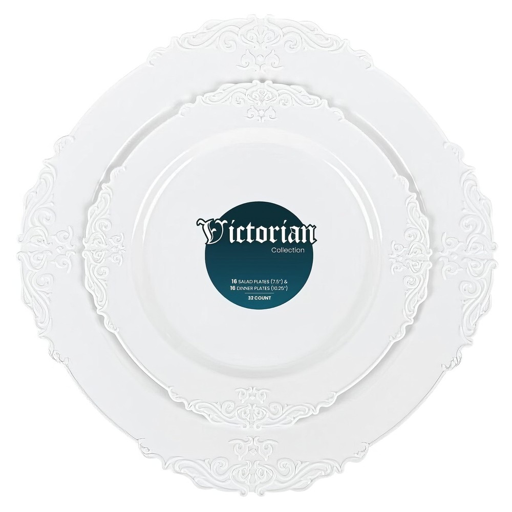These Victorian White Embossed Plates are the perfect choice for your special event. Crafted with a beautiful embossed design, they add an elegant touch to any table setting. Available in sizes, 7.5" and 10.25", these disposable dinnerware plates can be used for appetizers, entrees or desserts and can accommodate any party size. The durable plastic construction ensures that you get superior quality without sacrificing style while the convenient 32-count package makes it easy to stock up on all of your serving needs at once. Whether you're hosting a small gathering or a large celebration, these Victorian White Embossed Plates will help create an unforgettable experience! CLASSIC WHITE COLOR: The crisp, timeless white hue of these disposable plates effortlessly complements any table setting or party theme, adding sophistication to your event. DURABLE & DISPOSABLE: High-quality plastic construction ensures a sturdy dining experience while providing the convenience of effortless cleanup after your special occasion. SIZES FOR VERSATILITY: This 32-count set includes both 7.5" and 10.25" plates, allowing you to serve a variety of appetizers, entrees, and desserts with ease. ELEGANT DESIGN: Victorian White Embossed Plates showcase a stylish, traditional pattern that elevates any event, making them perfect for Thanksgiving, birthdays, anniversaries, and gatherings. ON-TREND & CONVENIENT: Impress your guests with the luxury of Victorian-inspired dinnerware without the hassle of traditional china, making party planning simple and enjoyable.