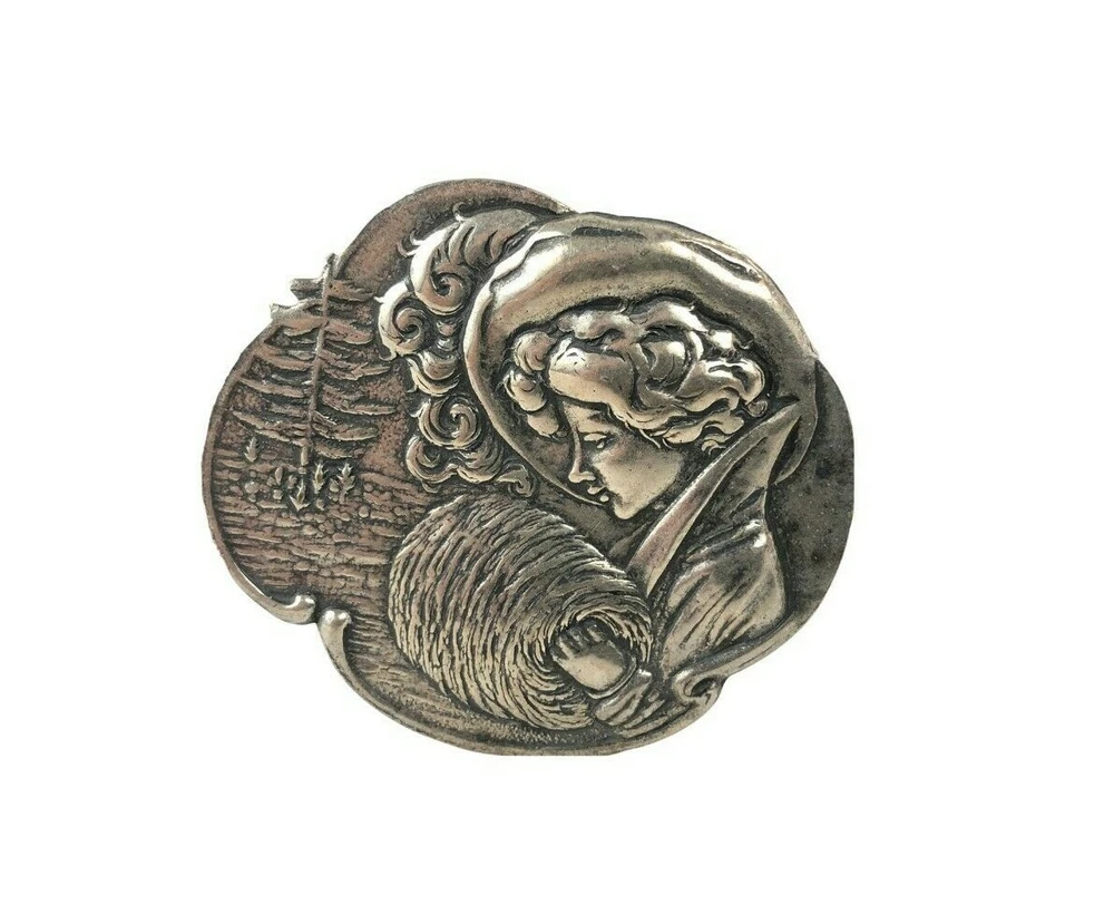 Victorian Woman w Hand Muff Hat Sterling Silver 925 Pin Brooch Estate Find 2 1/8 This is a nice heavy piece, very well designed. You will find scattered scratch and a nice patina, nothing serious, and the clasp is tight. Unmarked, tests as sterling 2 1/8" wide 18.0 gr