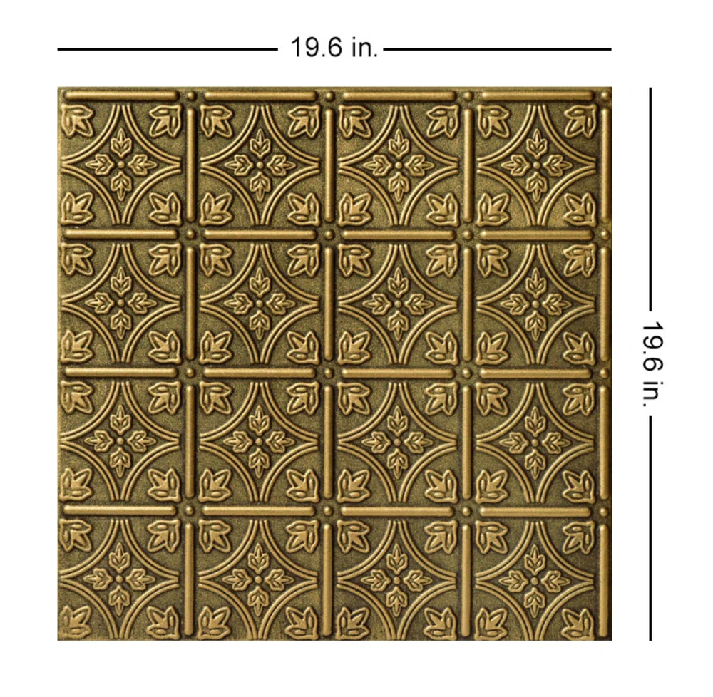 Finish: Metalic, Satin Gold Installation: Glue, Glue-Up, Adhesive Not Included Room: Conservatory, Hallway, Living Room, Bedroom, Foyer, Office Tile Size: 19.6x19.6 Features: Adhesive, Acustic, Lightweight, Moisture-Resistant, Covers Popcorn Ceiling Suitable For: Ceiling, Wall Accent Material: Foam, Polystyrene, Polystyrene Foam (Acoustic Foam) Style: Victorian, Ornate, Traditional, Vintage Pattern: Foral, Scrollwork Type: Glue-Up Celing Tiles Number in Pack: 48 Tile Look: Patterned Model: R125 Emma’s Flowers Brand: A La Maison Ceilings Color: Gold