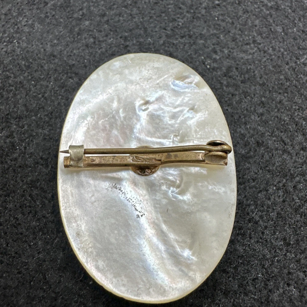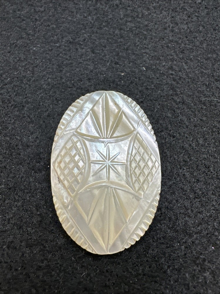 This beautiful oval brooch is a Victorian Mother-of-Pearl piece that exudes elegance and charm. The intricate design and craftsmanship of this antique jewelry item are evident in the delicate beige color and the unique shape. The brooch is made of Mother of Pearl material and is 2 inches in length, making it suitable for both men and women. The brooch is an original piece from the Edwardian era (1901-1910) and is a vintage item, making it a perfect addition to any antique collection. The brooch is a type of fashion accessory that can be worn on any occasion and adds a touch of sophistication to any outfit. The United States is the country of origin for this antique brooch, which is a must-have for any collector of vintage jewelry.