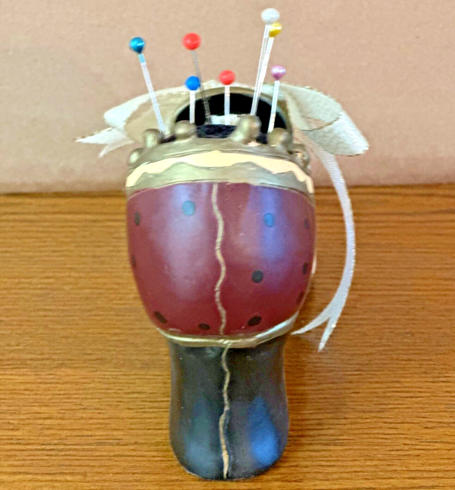 This vintage pincushion is absolutely charming! The hand-painted ceramic shoe has beautiful details in tan, maroon, gold, and black with a delicate ribbon bow. The felt sole adds a nice touch, and the colors are still vibrant with no chips—perfect condition! It's both a functional and decorative piece that adds a lovely Victorian flair to any sewing space. Shipping was quick and secure—very happy with this unique find!