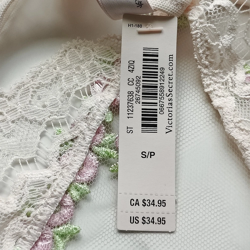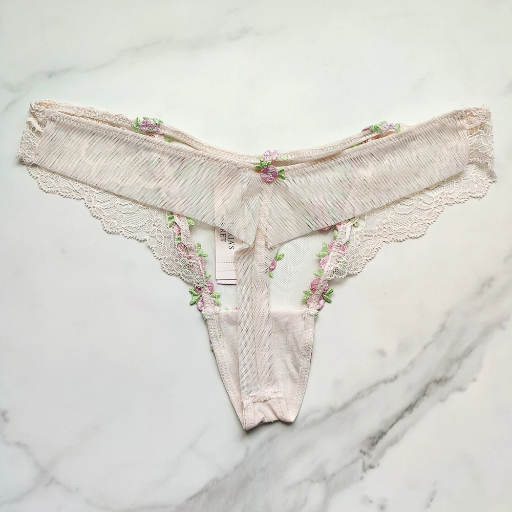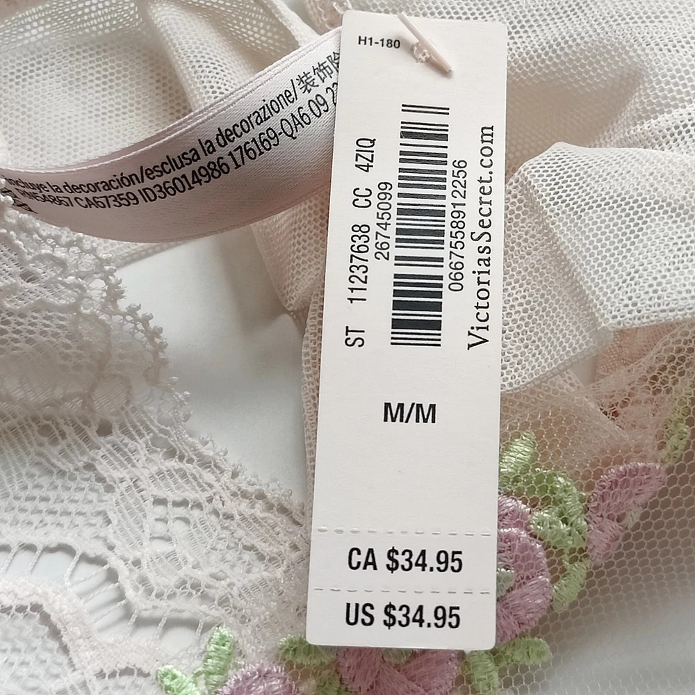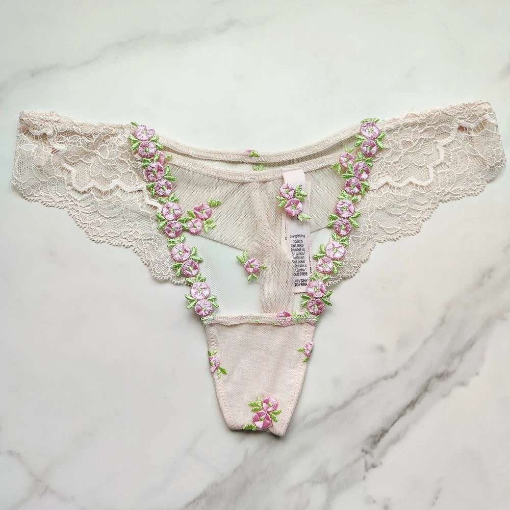 All photos are taken by Goob's Closet & Boutique and may not be reused without permission. Goob's Closet & Boutique lists inventory on multiple platforms. If you choose to wait to purchase or "Watch" this item, it may sell out on another platform first, and will then be removed from eBay without notice to you. This thong-style panty provides minimal back coverage and a low-rise fit for a comfortable and stylish look. The front and back panels features sheer mesh, offering a delicate and airy feel. The floral lace side panels add an enchanting touch, and the 3D floral rosebud embroidery at the front and back provides beautiful detail, giving this panty a unique and romantic appearance. The elastic at the waist and leg openings ensures a secure and comfortable fit, and the 100% cotton gusset provides breathability where it’s needed most. Details Thong Style Minimal Back Coverage Low Rise Sheer Tulle Mesh Front Panel Sheer Mesh Back Panels Floral Lace Side Panels 3D Floral Rosebud Embroidery at Front and Back Elastic at Waist and Leg Openings Made Partially from Recycled Materials 100% Cotton Gusset Style No. 11237638 Material Body: 100% Polyamide Embroidery: 100% Polyester Lace: 65% Recycled Polyamide, 24% Polyamide, 11% Elastane Back: 88% Polyamide, 12% Elastane Gusset: 100% Cotton Care Machine Wash Measurements Victoria's Secret Size Small (S) will fit US Size 4-6, Waist 26-27 inches, Hips 35.5-37.5 inches best. Victoria's Secret Size Medium (M) will fit US Size 8-10, Waist 28-29 inches, Hips 38.5-39.5 inches best. Victoria's Secret Size Large (L) will fit US Size 12-14, Waist 30.5-32 inches, Hips 41-42.5 inches best. Victoria's Secret Size Extra Large (XL) will fit US Size 16-18, Waist 34-36 inches, Hips 44.5-46.5 inches best.