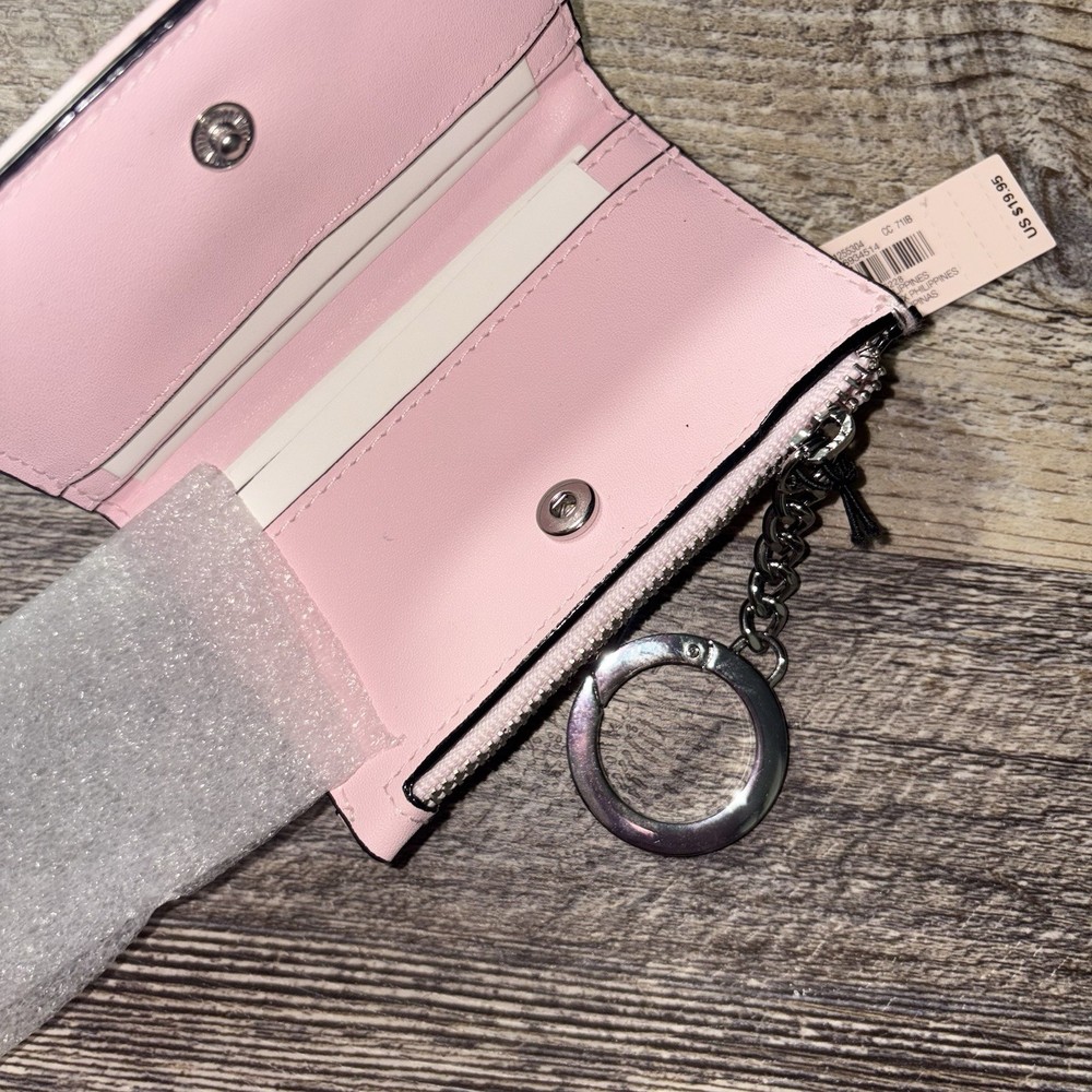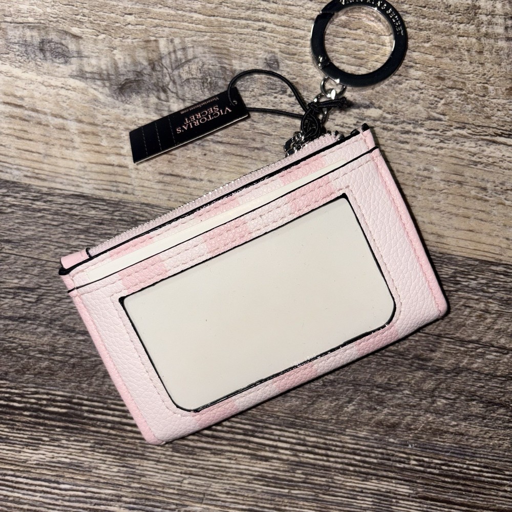 The VICTORIA'S SECRET Foldover Card Case Wallet Keychain is a stylish and compact accessory for women. Made from imported polyurethane, this small wallet features a striped pattern in multiple colors with the signature Victoria's Secret logo accent. The keychain style makes it convenient to carry and has a built-in credit card feature for added functionality. Perfect for organizing your cards and keys in a fashionable way.