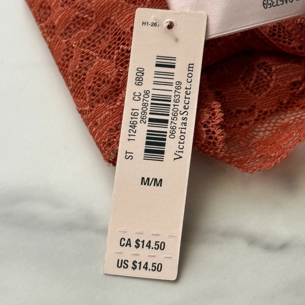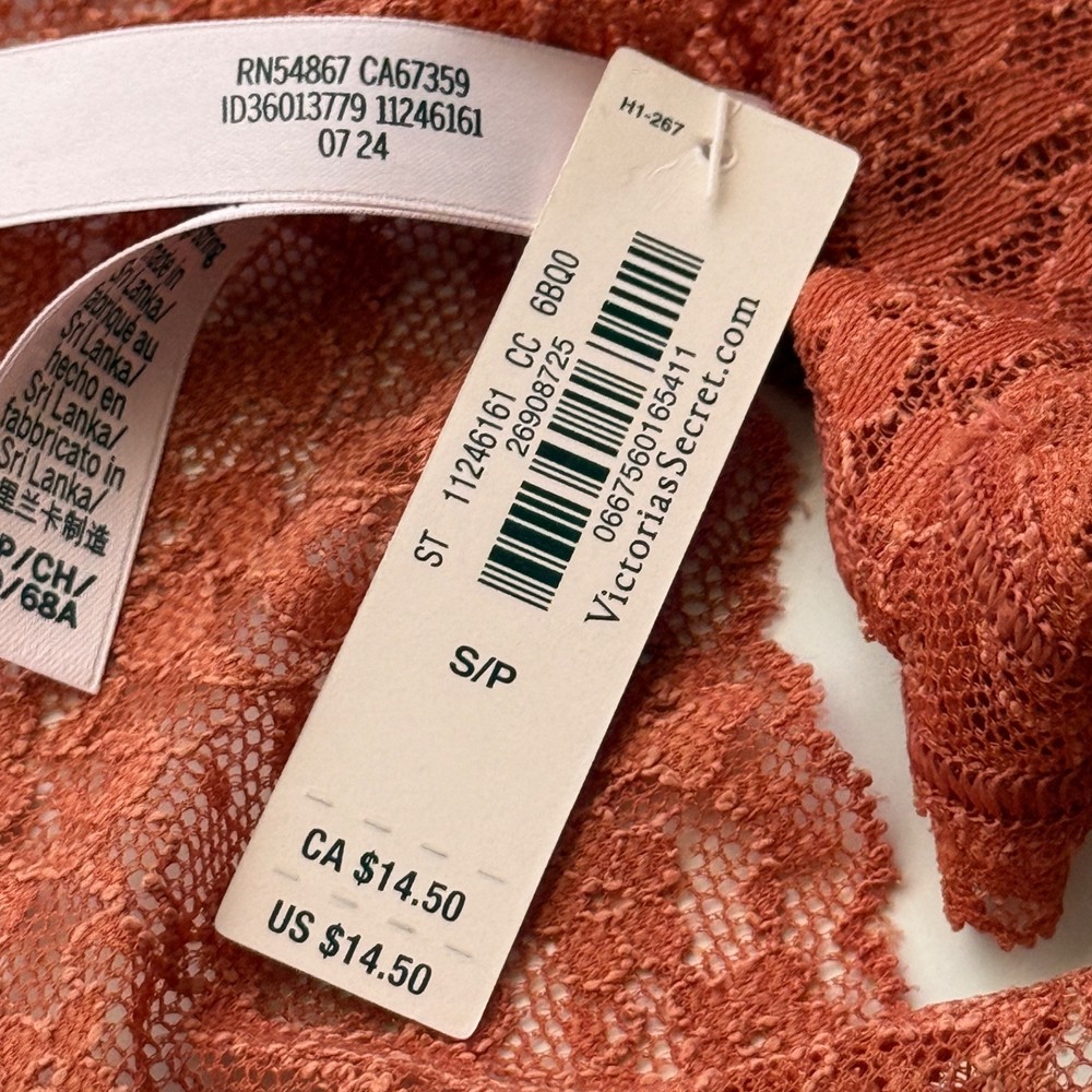 All photos are taken by Goob's Closet & Boutique and may not be reused without permission. This item is listed on multiple platforms and may sell elsewhere without notice. If you're interested, we recommend purchasing now to ensure availability. This panty features a thong style with minimal back coverage and a flattering low-rise fit. The all-over sheer stretch posey floral lace gives it a delicate, beautiful look that stays flat for a no show-through effect, making it perfect for any outfit. Plus, it's made partially from recycled materials, so it's a more sustainable choice. The gusset is made from 100% cotton, ensuring breathability and comfort where it's needed most. Details Thong Style Minimal Back Coverage Low Rise All-Over Sheer Stretch Posey Floral Lace Lace Stays Flat For No Show-Through Made Partially From Recycled Materials 100% Cotton Gusset Style No. 11220020 or 11246161 Color: Gingerbread Color Code (CC): 6BQ0 Material Body: 55% Recycled Polyamide, 35% Polyamide, 10% Elastane Waist: 55% Recycled Polyamide, 31% Polyamide, 14% Elastane Gusset: 100% Cotton Care Machine Wash Measurements Victoria's Secret Size Small (S) will fit US Size 4-6, Waist 26-27 inches, Hips 36.5-37.5 inches best. Victoria's Secret Size Medium (M) will fit US Size 8-10, Waist 28-29 inches, Hips 38.5-39.5 inches best. Victoria's Secret Size Large (L) will fit US Size 12-14, Waist 30.5-32 inches, Hips 41-42.5 inches best. Victoria's Secret Size Extra Large (XL) will fit US Size 16-18, Waist 34-36 inches, Hips 44.5-46.5 inches best. Mannequin Mannequin is shown wearing a size Small (S). Mannequin measurements are: Bust 34 inches, Waist 25 inches, Hips 34 inches.