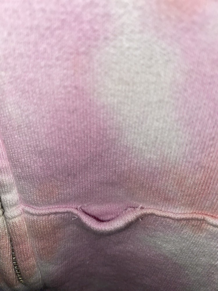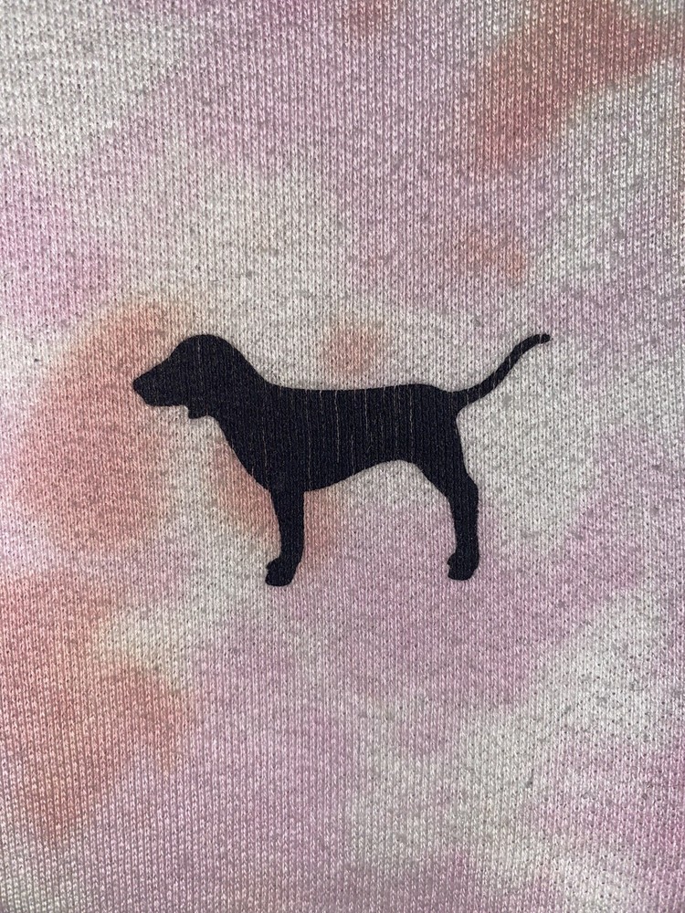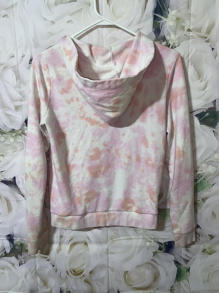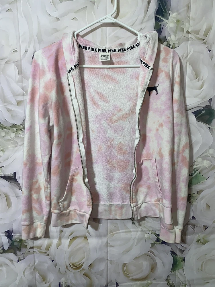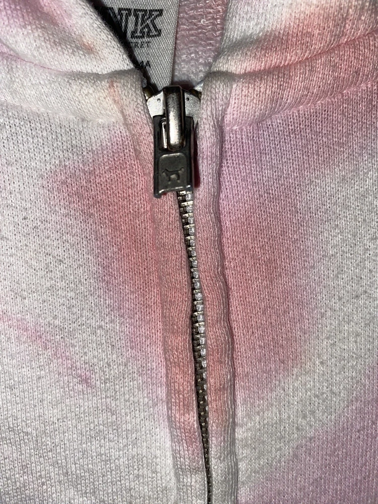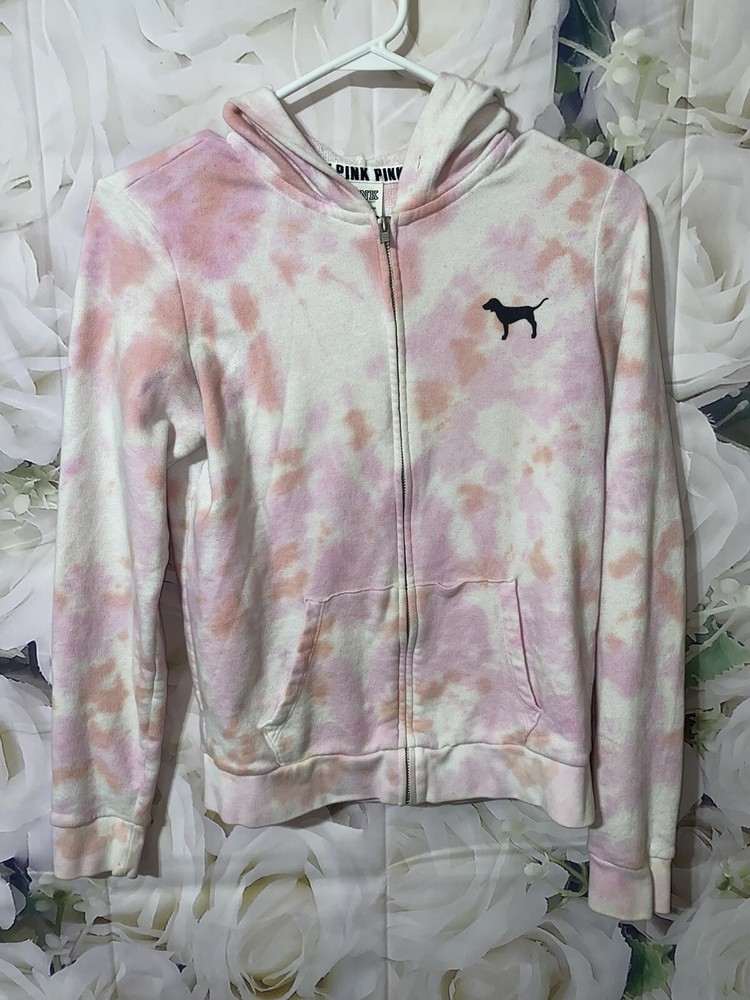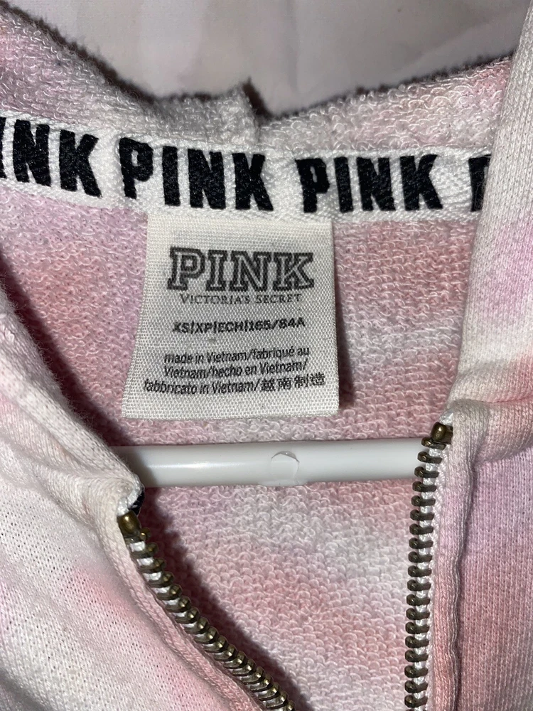 VS PINK Tie-Dye Hooded Zip Front Sweatshirt ~ Size XS. Used good condition 78% cotton 22% polyester Small snags that you can’t tell Hole depicted in the photo Half zipper cut off, but can still zip up all the way Pit to pit: 18.5 inches Length without hood: 22 inches Sleeves: 21 inches Smoke-free home