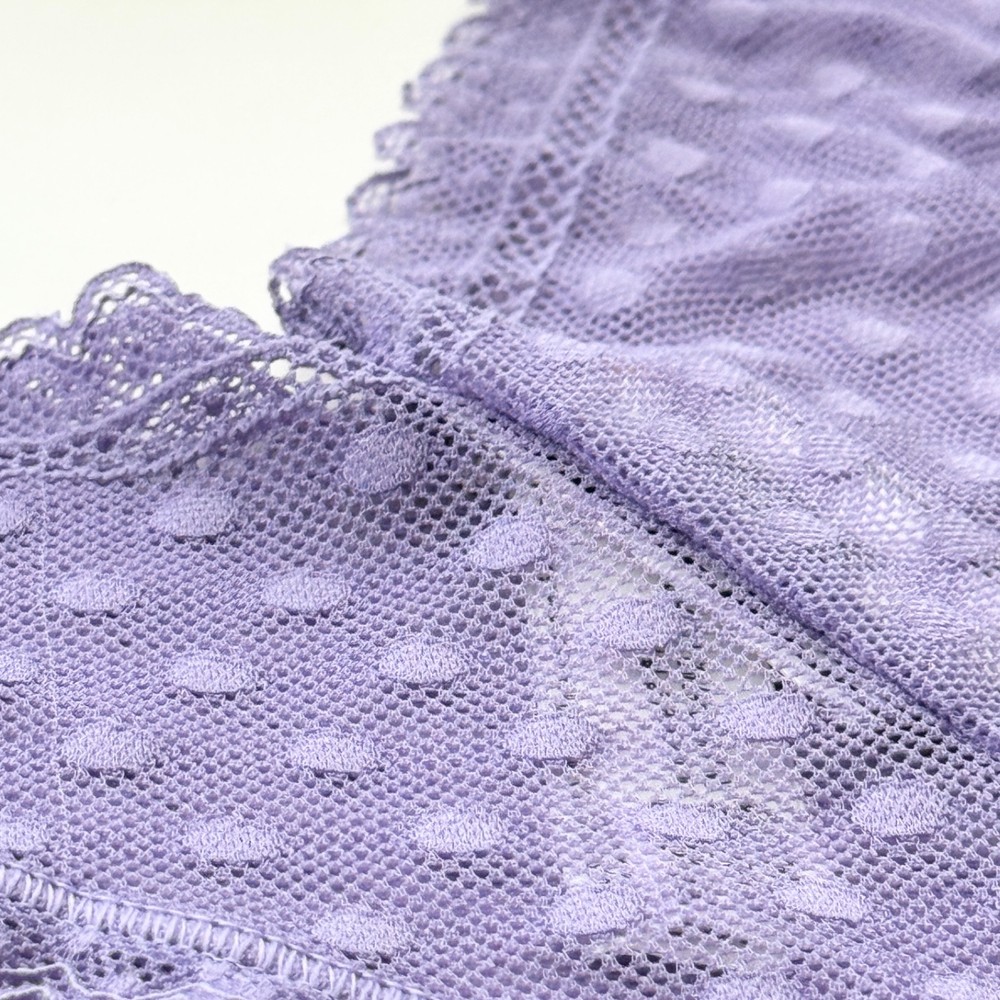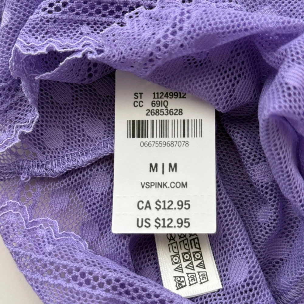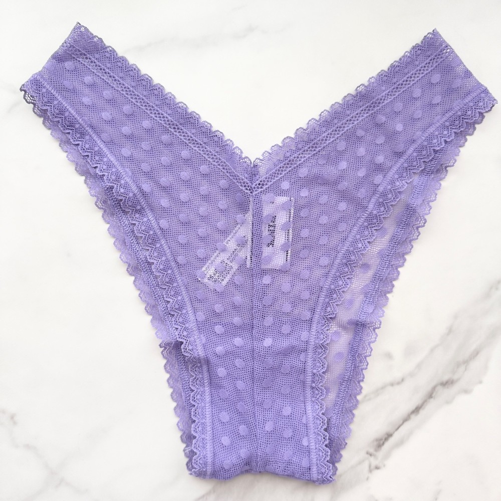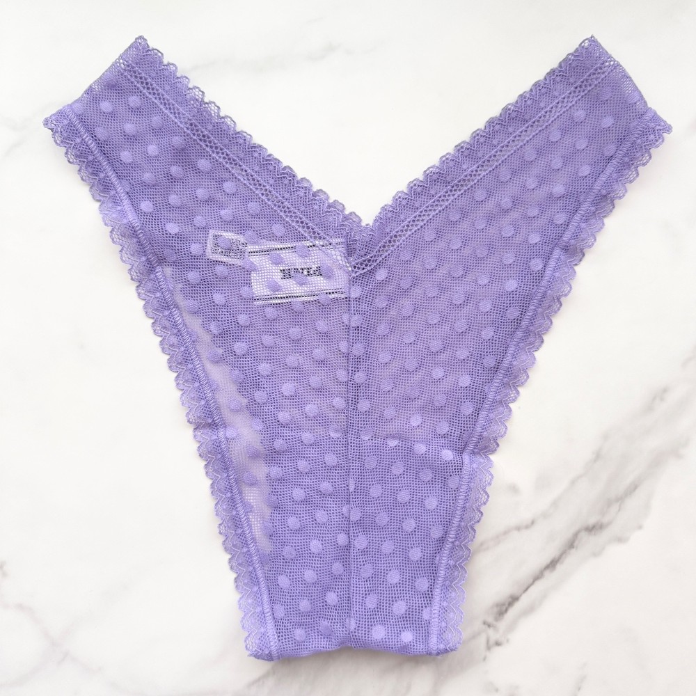 All photos are taken by Goob's Closet & Boutique and may not be reused without permission. This item is listed on multiple platforms and may sell elsewhere without notice. If you're interested, we recommend purchasing now to ensure availability. This cheeky Brazilian bikini panty features all-over dainty dot sheer lace that stretches to move with you while offering a light, barely-there feel. The low-rise fit and high-cut leg openings create a flattering silhouette, while the V-front waistband adds a playful twist that lies smoothly under clothes. With cheeky back coverage and a breathable 100% cotton gusset, it's as comfy as it is cute. Made partially from recycled materials, it’s a stylish and sustainable pick you'll reach for again and again. Details Brazilian Bikini Style Cheeky Back Coverage Low Rise High-Cut Leg Openings All-Over Dainty Dot Sheer Stretch Lace V-Front Waist Made Partially From Recycled Materials 100% Cotton Gusset Style No. 11249912 Color: Wysteria Purple Color Code (CC): 69IQ Material Body: 67% Recycled Polyamide, 17% Polyamide, 16% Elastane Gusset: 100% Cotton Care Machine Wash Measurements PINK Victoria's Secret Size Small (S) will fit US Size 4-6, Waist 26-27 inches, Hips 36.5-37.5 inches best. PINK Victoria's Secret Size Medium (M) will fit US Size 8-10, Waist 28-29 inches, Hips 38.5-39.5 inches best. PINK Victoria's Secret Size Large (L) will fit US Size 12-14, Waist 30.5-32 inches, Hips 41-42.5 inches best. PINK Victoria's Secret Size Extra Large (XL) will fit US Size 16-18, Waist 34-36 inches, Hips 44.5-46.5 inches best. Mannequin Mannequin is shown wearing a size Small (S). Mannequin measurements are: Bust 34 inches, Waist 25 inches, Hips 34 inches.