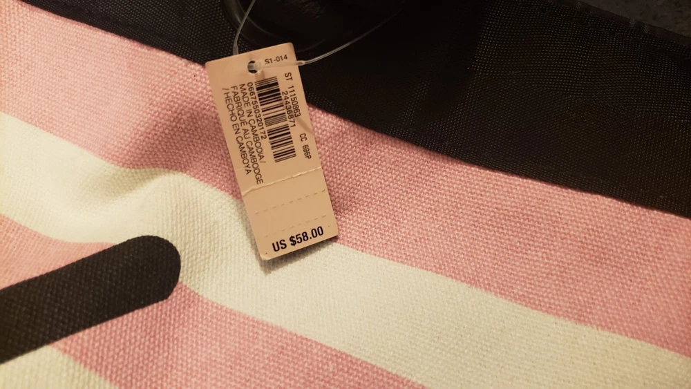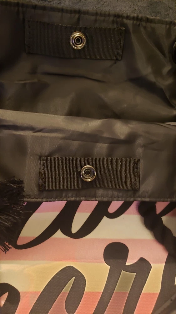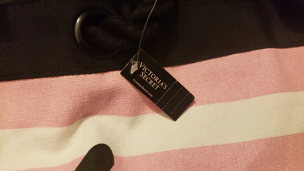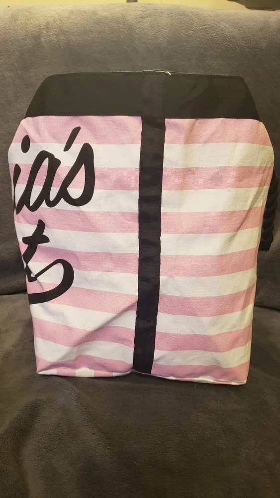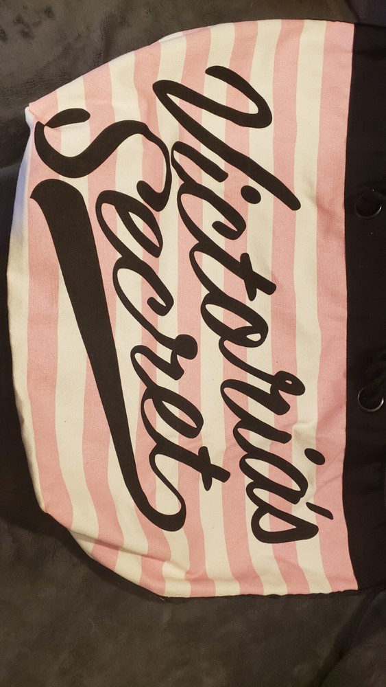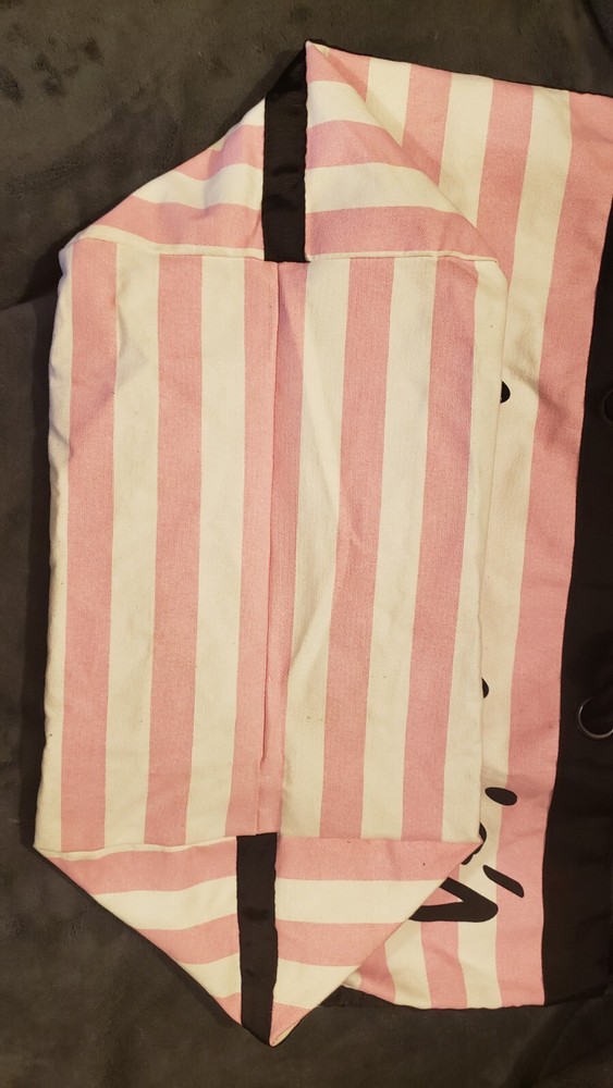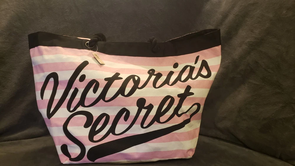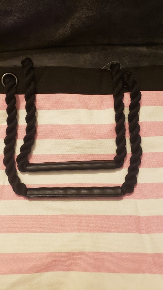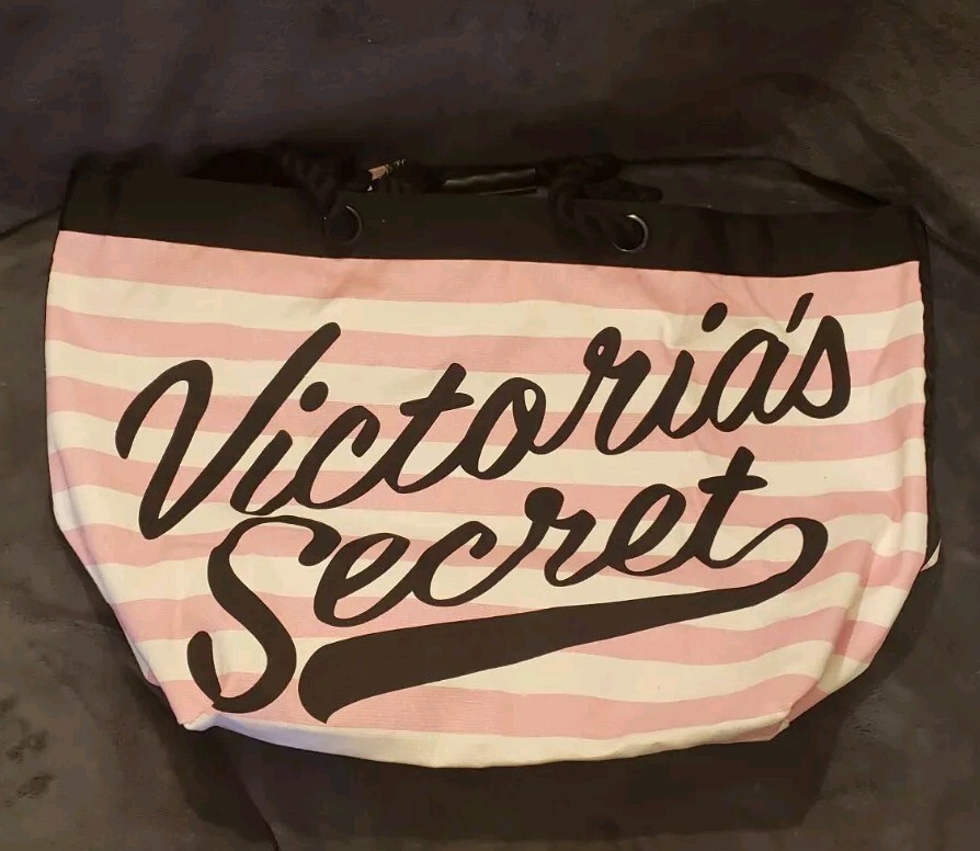 This is a Victoria's Secret Signature Stripe Getaway Beach Tote Bag with a signature pink and white striped pattern. It has a snap closure and rope double straps with an 8.5" drop. The tote is large in size with a fabric lining and one inside pocket. It is designed for everyday use and is fun and functional, perfect for anytime outings. Was $58 NWT Beach Overnighter Daily Large Weekender