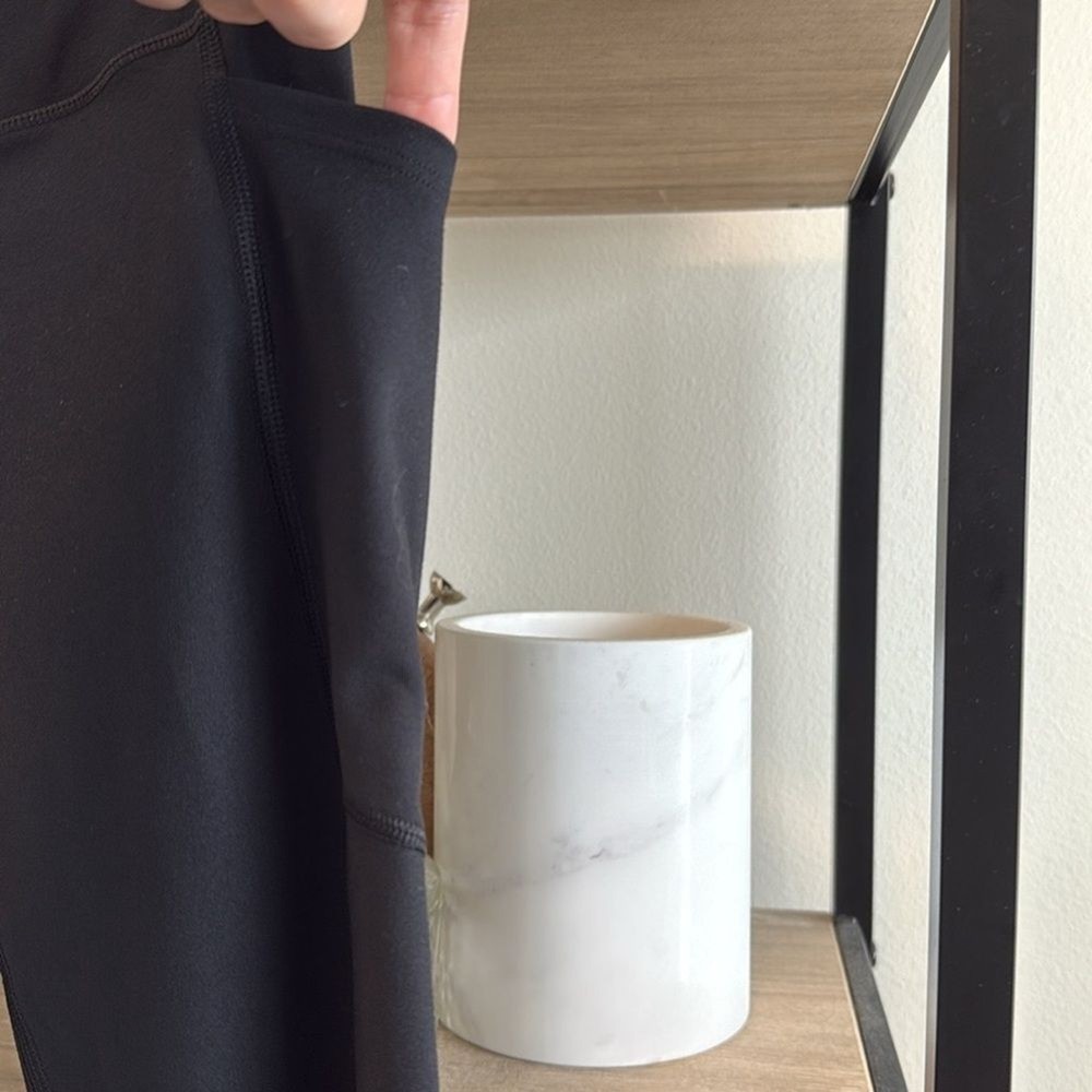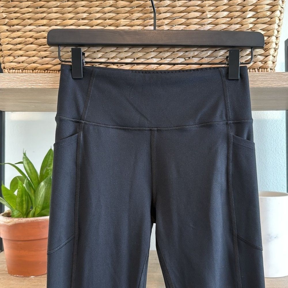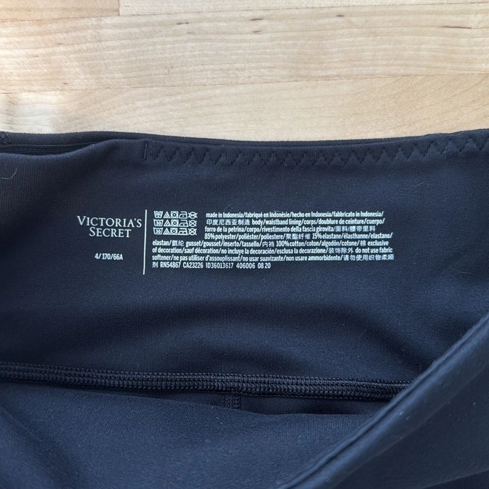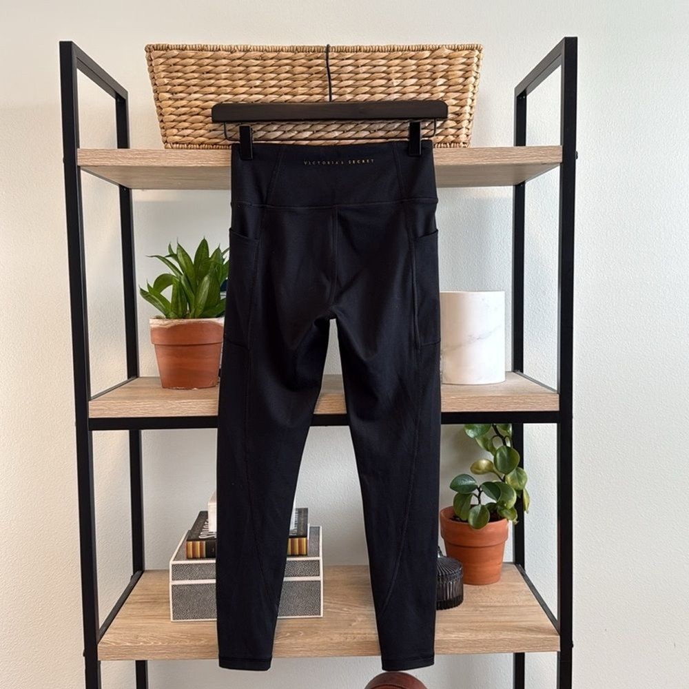 Victoria's Secret Sport Yoga Mid-Rise Black Capri Legging, 4 (Small) Like new condition. 85% Polyester, 15% Elastane mid-weight stretch compression knit fabric. 2 pockets at the outside hip- perfect for a phone/keys/wallet. Hidden pocket inside the waistband. Measurements taken flat: Waist: 12.75" Front Rise: 9.25" Inseam: 23.5" Leg Opening: 3.75"