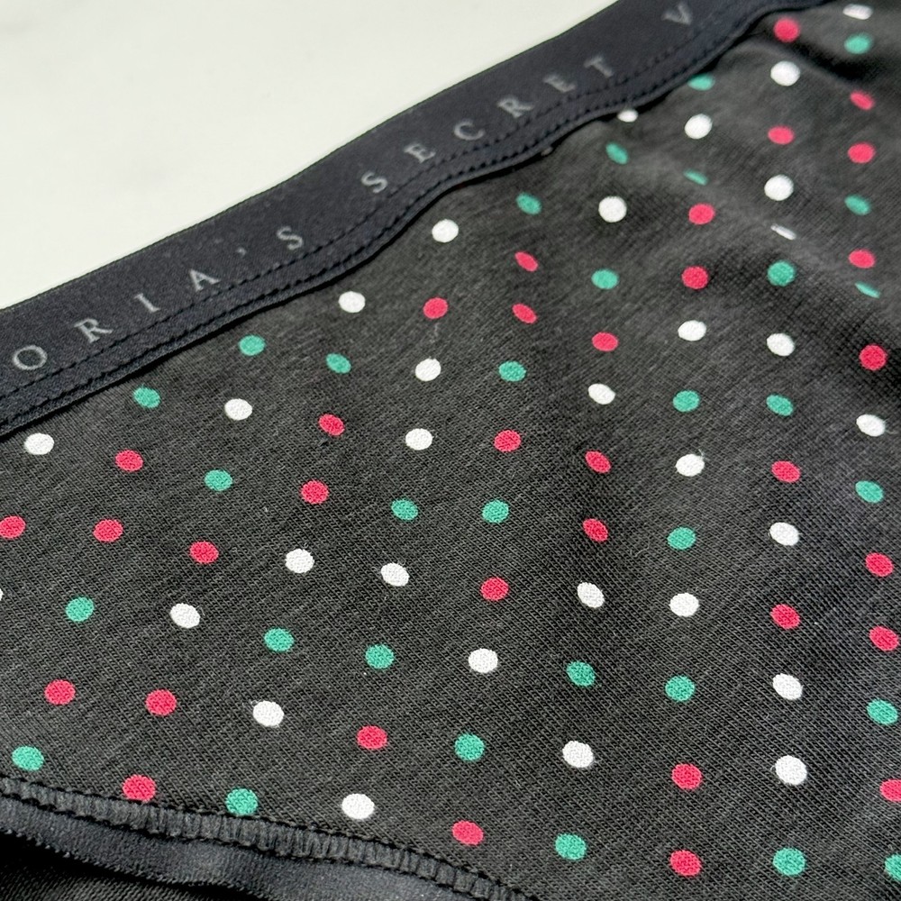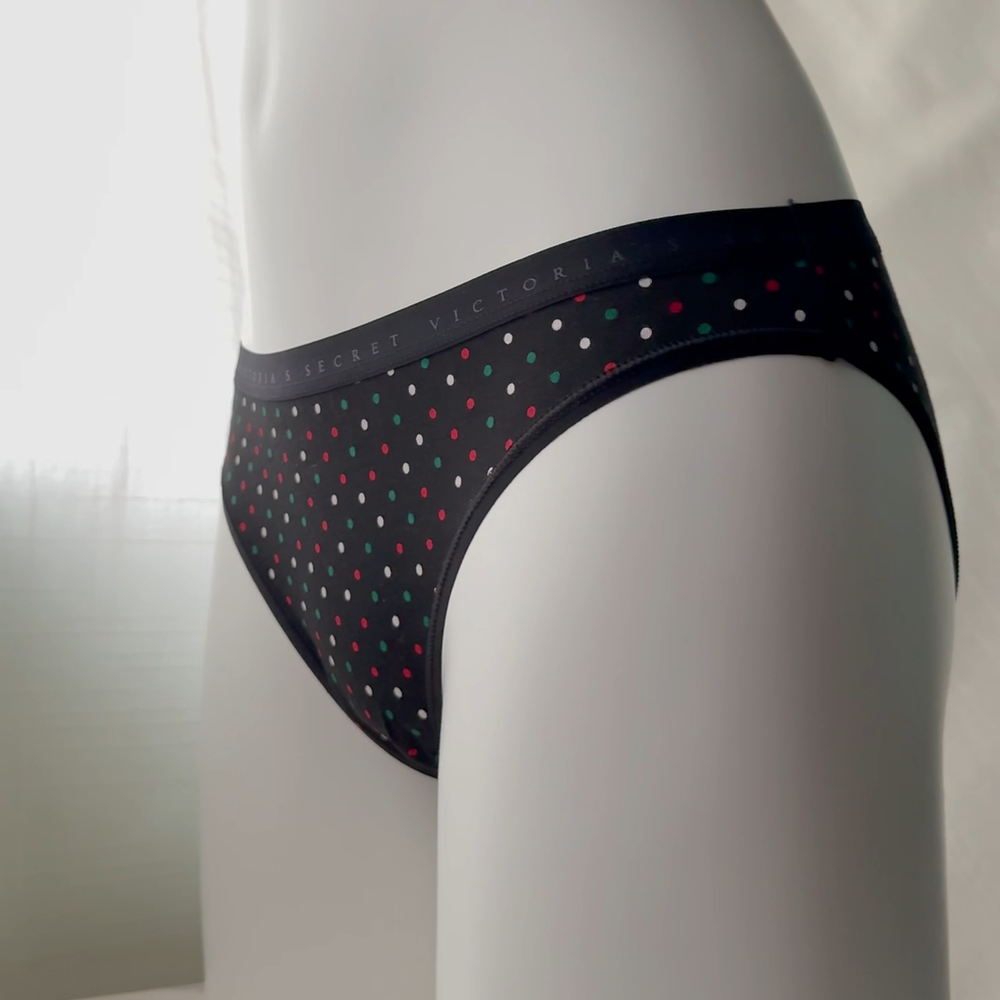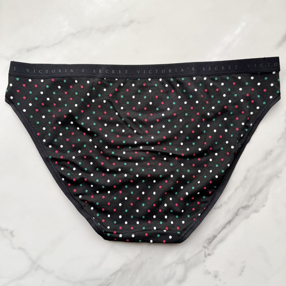 All photos are taken by Goob's Closet & Boutique and may not be reused without permission. Goob's Closet & Boutique lists on multiple platforms. If you choose to wait to purchase or "Watch" this listing, it may sell out on another platform first, and will then become out of stock and will no longer be available for purchase on eBay without notice to you. This bikini panty provides moderate back coverage with a mid-rise fit that’s both flattering and practical. Crafted from a smooth cotton-modal blend, it feels breathable and soft against the skin, ideal for all-day wear. The elastic waistband features the iconic Victoria’s Secret logo, while the tag-free design ensures no irritation. Finished with elastic at the leg openings, this panty is made to stay in place for a comfortable fit. Machine washable for easy care, it's a perfect choice for daily comfort and style. Details Bikini Style Modern/Moderate Back Coverage Mid Rise Stretch Cotton Blend Fabric Victoria's Secret Logo Elastic Waistband Elastic at Leg Openings Tag-Free Design Style No. 11244855 Color: Black Festive Dots Material Body/Gusset: 57% Cotton, 38% Modal, 5% Elastane Care Machine Wash Measurements Victoria's Secret Size Small (S) will fit US Size 4-6, Waist 26-27 inches, Hips 36.5-37.5 inches best. Victoria's Secret Size Medium (M) will fit US Size 8-10, Waist 28-29 inches, Hips 38.5-39.5 inches best. Victoria's Secret Size Large (L) will fit US Size 12-14, Waist 30.5-32 inches, Hips 41-42.5 inches best. Victoria's Secret Size Extra Large (XL) will fit US Size 16-18, Waist 34-36 inches, Hips 44.5-46.5 inches best. Mannequin Mannequin is shown wearing a size Small (S). Mannequin measurements are: Bust 34 inches, Waist 25 inches, Hips 34 inches.