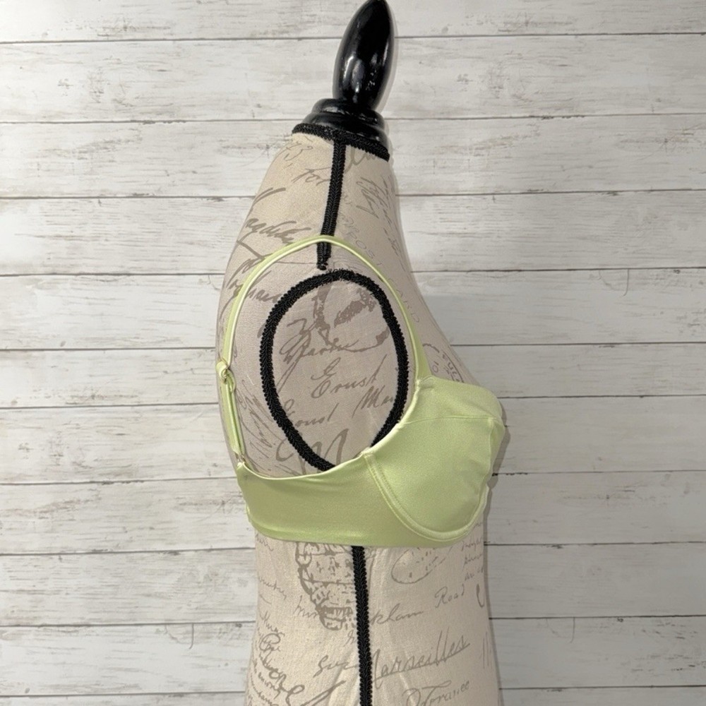 Victoria’s Secret size 34DDD swim top in the color “iced olive”. Gold tone hardware. Lined cups with underwire. Comfortably wide adjustable shoulder straps. Adjustable swan hook back close. 80% Polyamide, 20% Elastane Perfect condition!