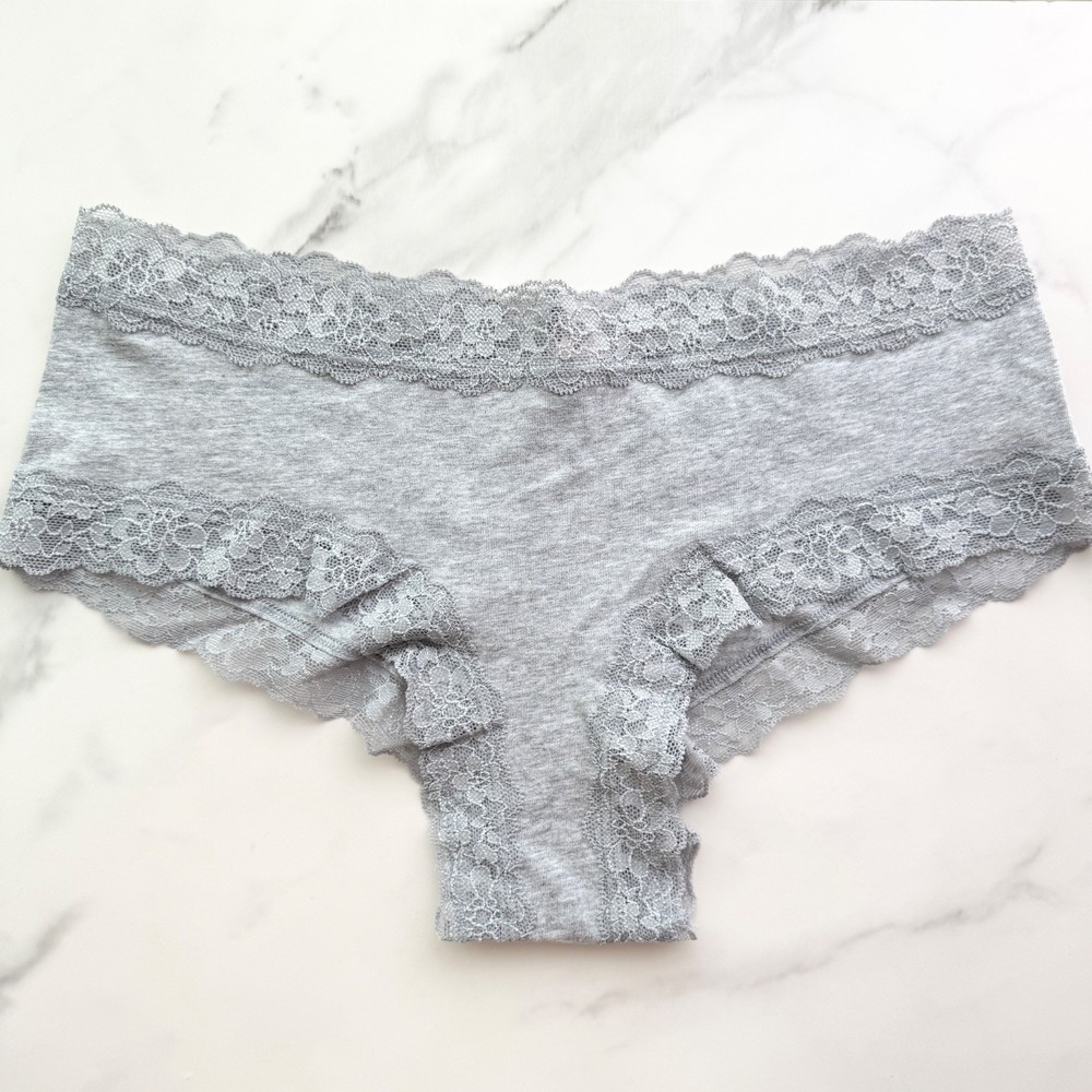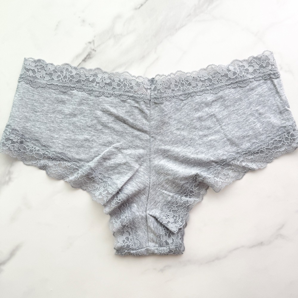 All photos are taken by Goob's Closet & Boutique and may not be reused without permission. This item is listed on multiple platforms and may sell elsewhere without notice. If you're interested, we recommend purchasing now to ensure availability. This cheeky panty blends the softness of cotton-modal fabric with the delicate beauty of floral stretch lace for a flirty, feminine feel. The low-rise fit and cheeky back coverage create a flattering silhouette, while the smooth, stretchy body moves comfortably with you. Plus, the seam down the center back enhances the fit for natural shaping. Made partially from recycled materials and finished with a 100% cotton gusset, this style is as breathable as it is beautiful—perfect for everyday wear with a little extra charm. Details Cheeky Style Cheeky Back Coverage Low Rise Smooth Soft Stretch Cotton Modal Body Floral Sheer Stretch Lace At Waist And Leg Openings Seam Down Center Back For Ideal Fit Made Partially From Recycled Materials 100% Cotton Gusset Style No. 11246627 Color: Heather Grey Color Code (CC): 1NG0 Material Body/Gusset: 57% Cotton, 38% Modal, 5% Elastane Waist/Leg Lace: 55% Recycled Polyamide, 32% Polyamide, 13% Elastane Care Machine Wash Measurements Victoria's Secret Size Small (S) will fit US Size 4-6, Waist 26-27 inches, Hips 36.5-37.5 inches best. Victoria's Secret Size Medium (M) will fit US Size 8-10, Waist 28-29 inches, Hips 38.5-39.5 inches best. Victoria's Secret Size Large (L) will fit US Size 12-14, Waist 30.5-32 inches, Hips 41-42.5 inches best. Victoria's Secret Size Extra Large (XL) will fit US Size 16-18, Waist 34-36 inches, Hips 44.5-46.5 inches best. Mannequin Mannequin is shown wearing a size Small (S). Mannequin measurements are: Bust 34 inches, Waist 25 inches, Hips 34 inches.
