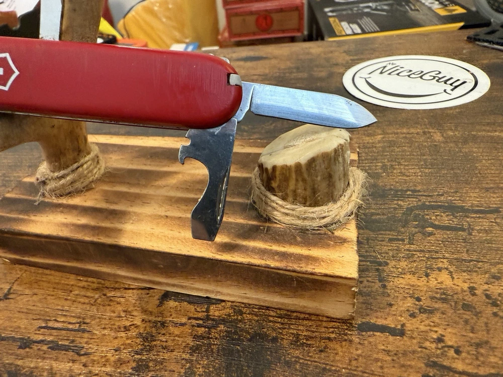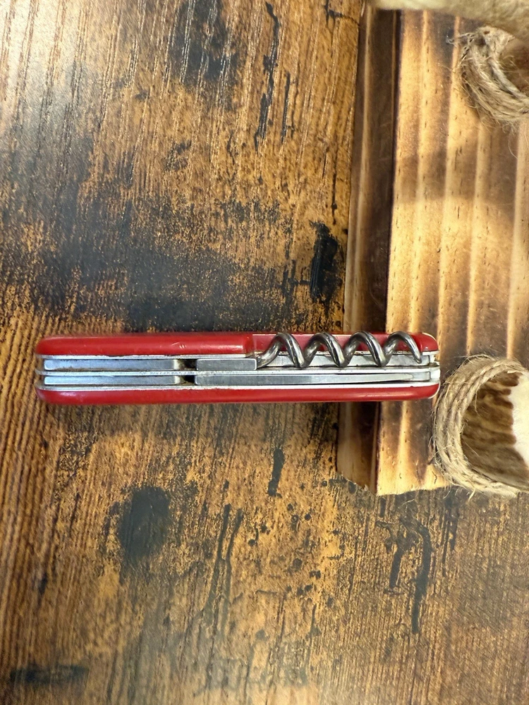 The Victorinox 91mm Spartan / Standard Swiss Army Knife is a vintage multi-tool with two blades: a drop point and a clip point. The knife features a slipjoint lock type and a manual opening mechanism. The handle is made of durable cellidor plastic in a classic red color. This iconic knife is a versatile and reliable tool for various tasks, making it a must-have for outdoor enthusiasts and collectors alike.