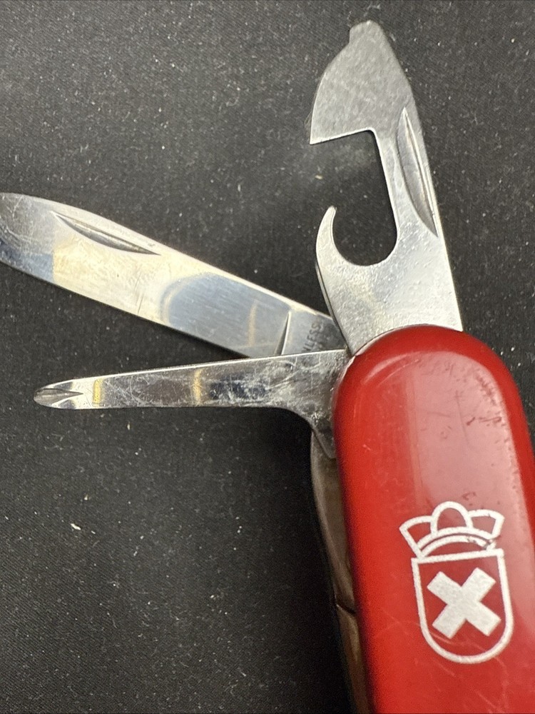 Product Line: Victorinox Swiss Army knives Opening Mechanism: Manual Color: Red Original/Reproduction: Original Dexterity: Ambidextrous Blade Range: Under 2.75in. Blade Edge: Plain Brand: Victorinox Swiss Army Tools: Bottle Opener, Corkscrew, Magnifying Glass, Punch, Scissors, Screw Driver, Can Opener, Phillips Screwdriver Blade Material: Stainless Steel Country/Region of Manufacture: Switzerland Year: 1980s Type: Pocketknife Model: Explorer Handle Material: Cellidor Blade Type: Spear Point Lock Type: Slipjoint