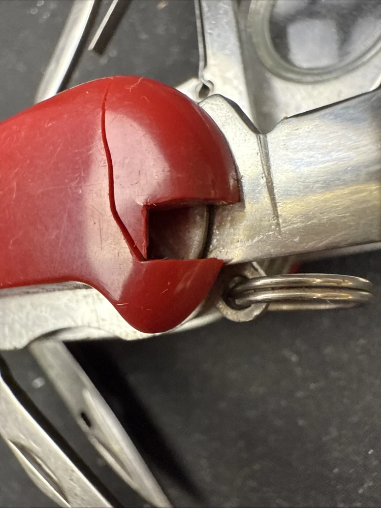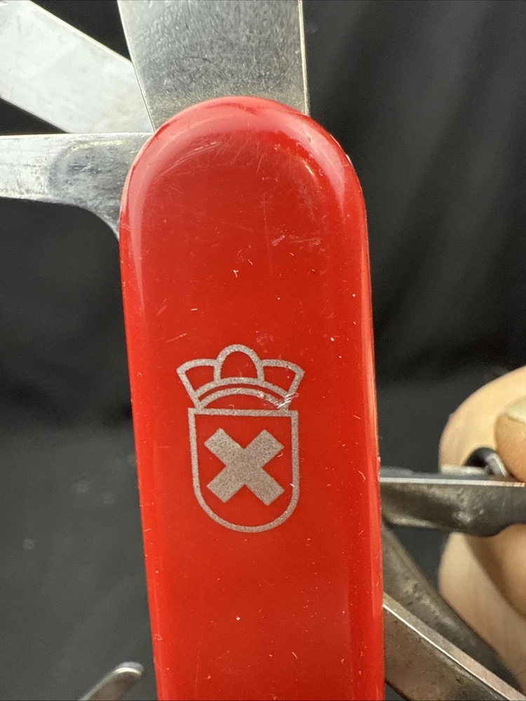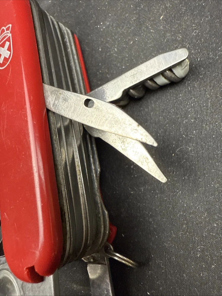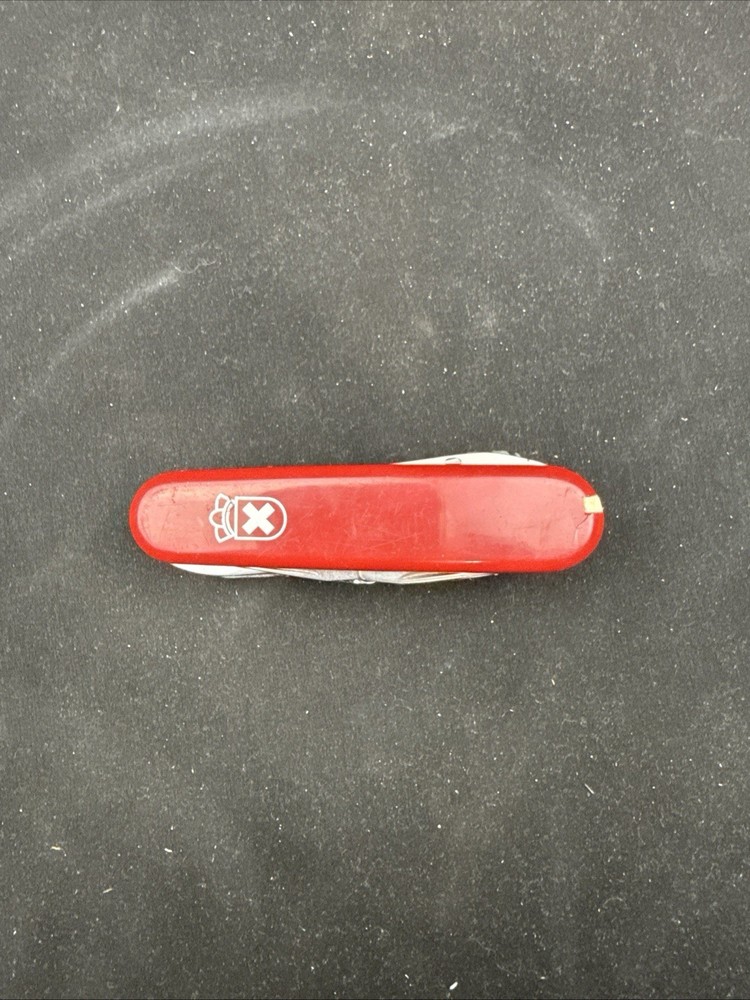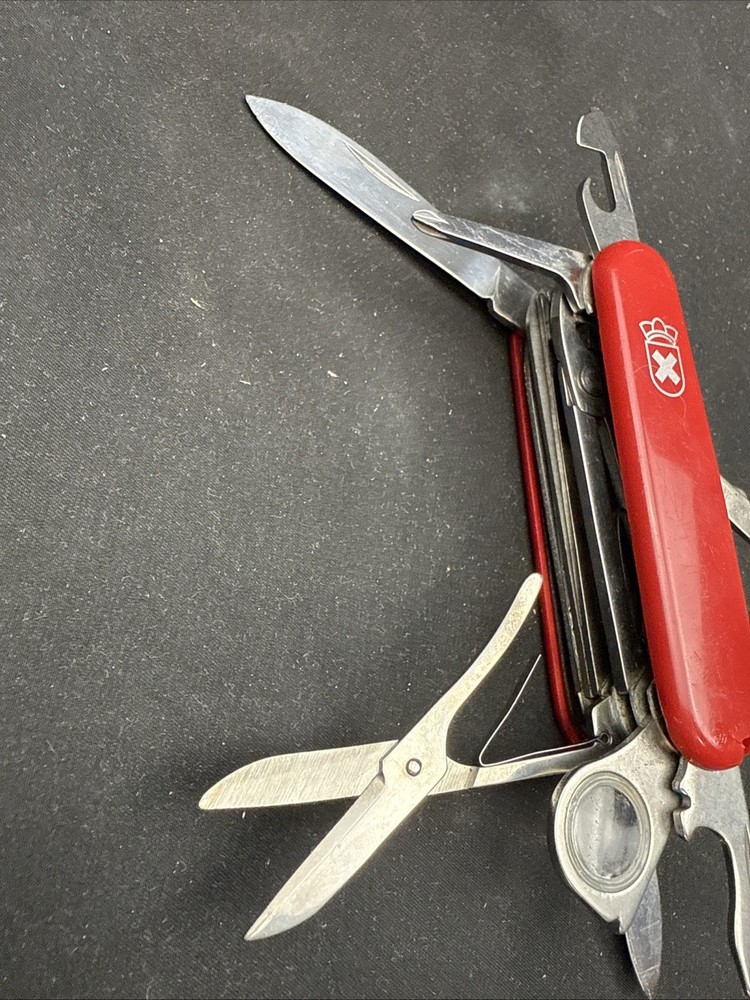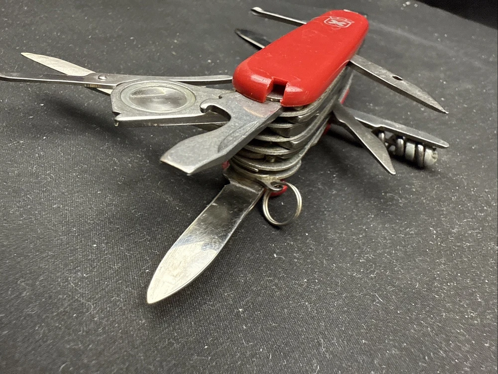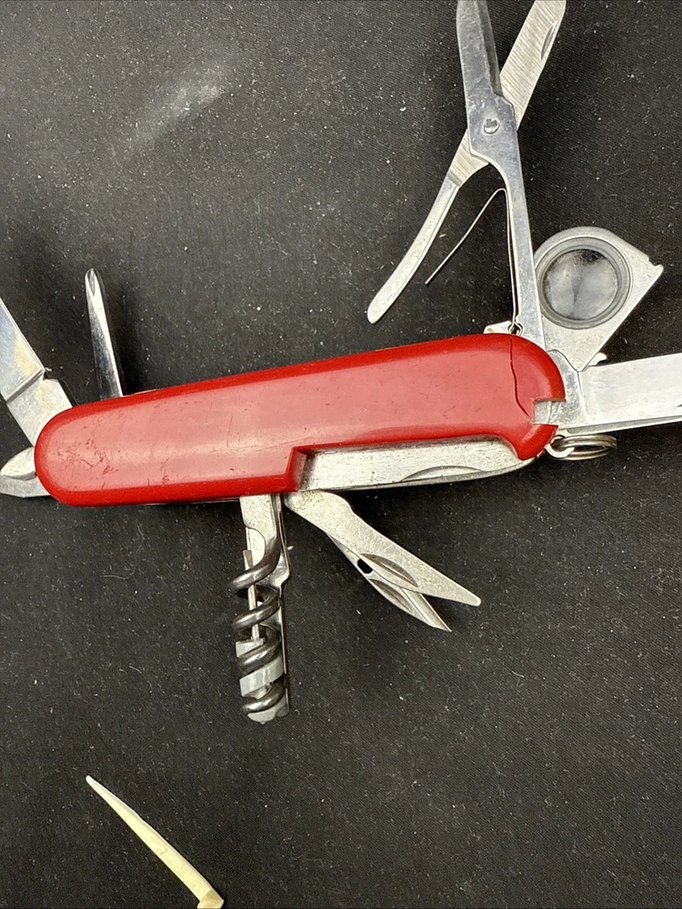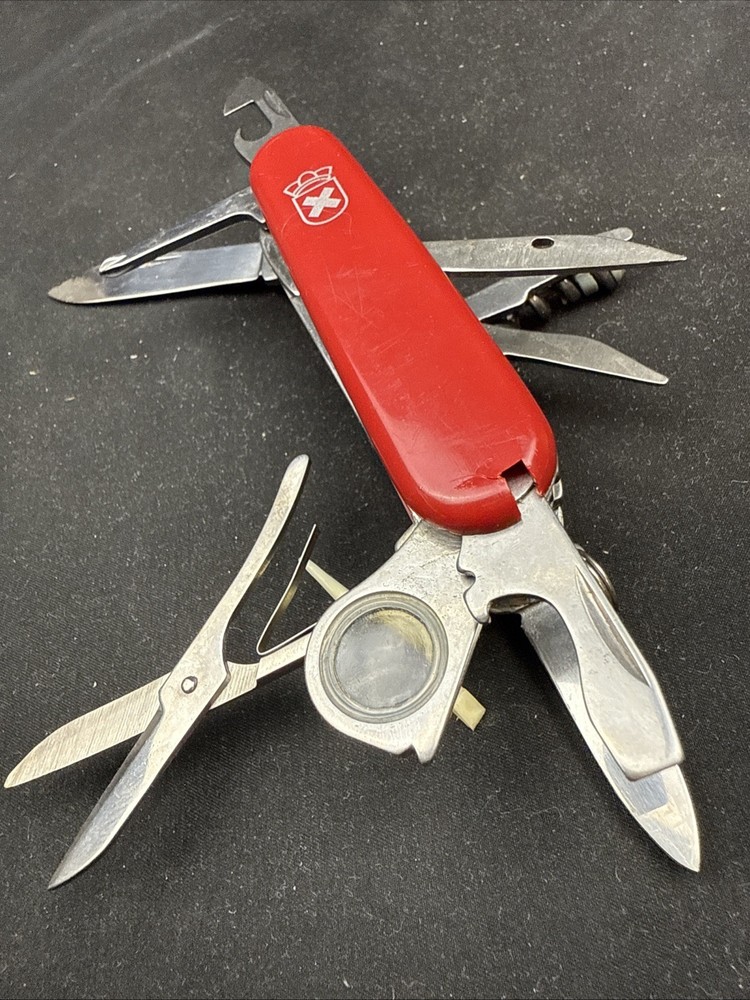 The Victorinox Explorer Swiss Army Knife with a magnifying glass is a versatile and compact tool perfect for outdoor enthusiasts. Made with stainless steel blades, this pocketknife features a spear point blade and a range of useful tools including a punch, corkscrew, scissors, screwdriver, bottle opener, and more. The red-colored handle is made of Cellidor material and the knife is ambidextrous, making it suitable for both left and right-handed users. Perfect for fishing, camping, or any outdoor activity, this original 1980s model from Switzerland is a must-have for any collection of modern folding knives. Non-branded side of the knife has a crack near where the tweezers would normally go. doesn’t impact knife performance.