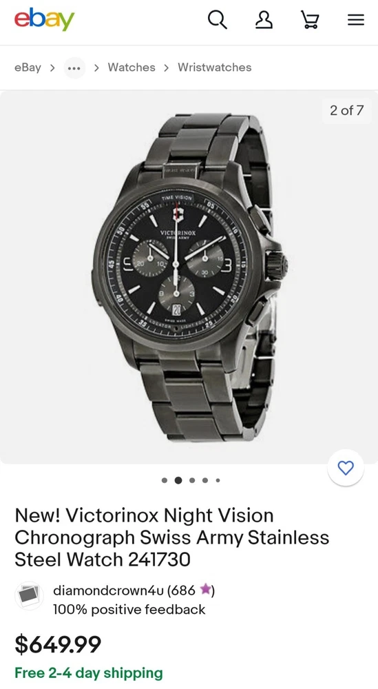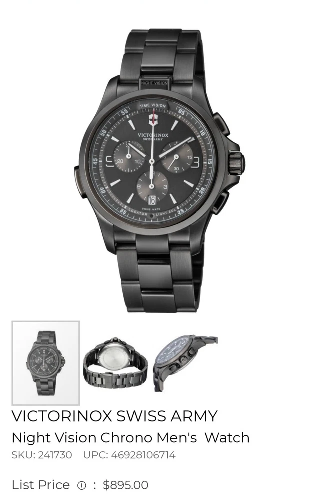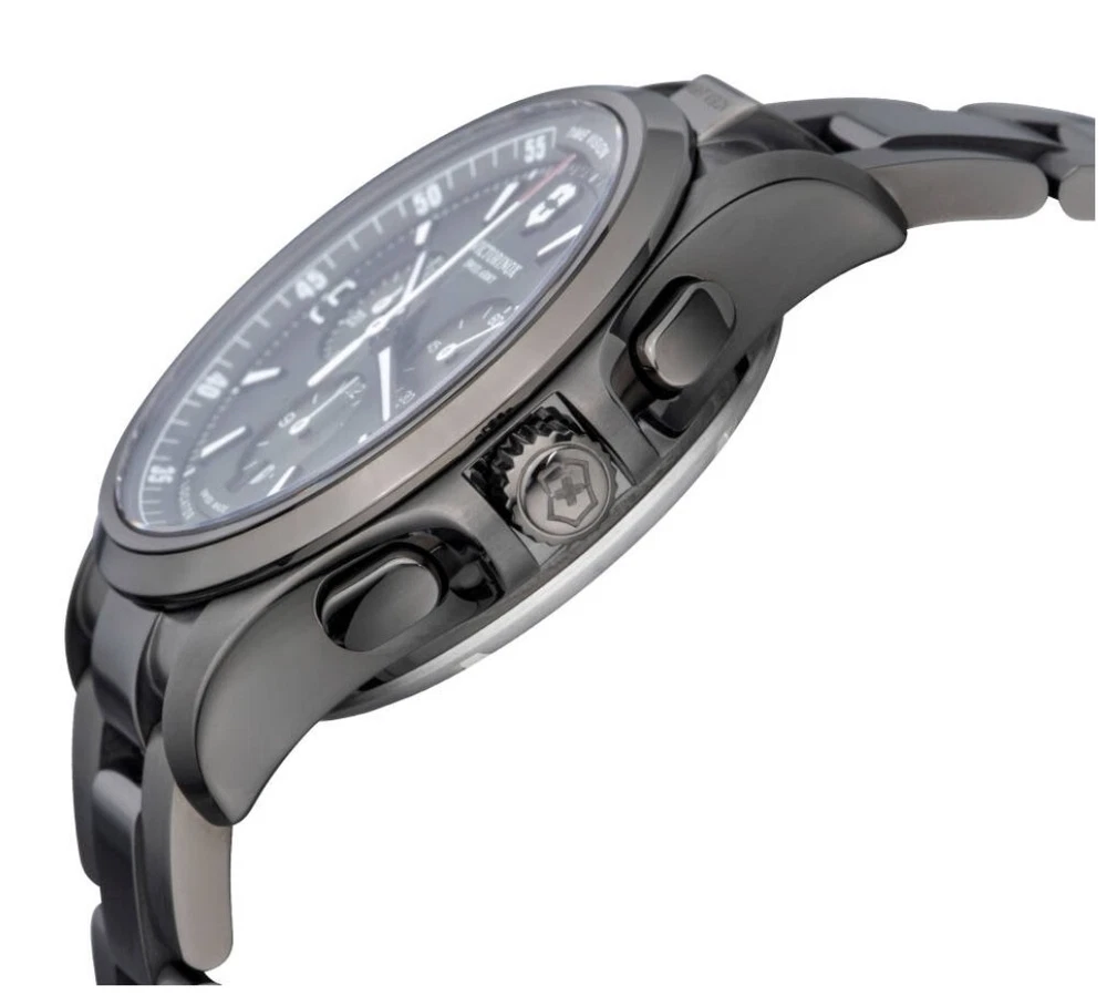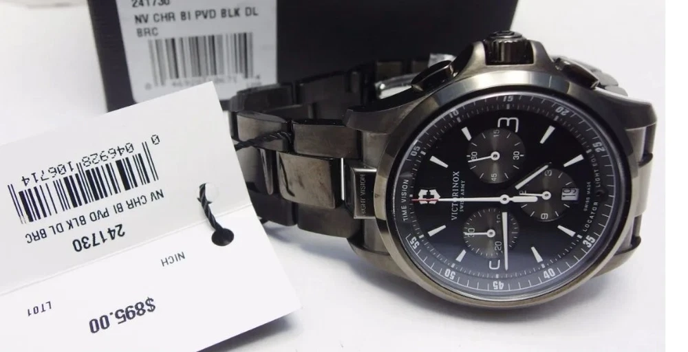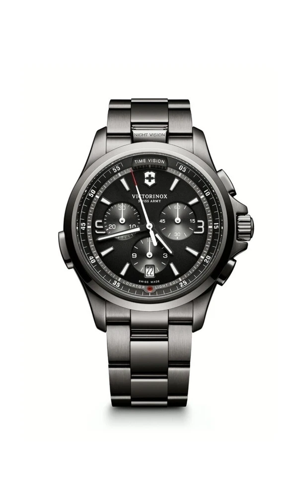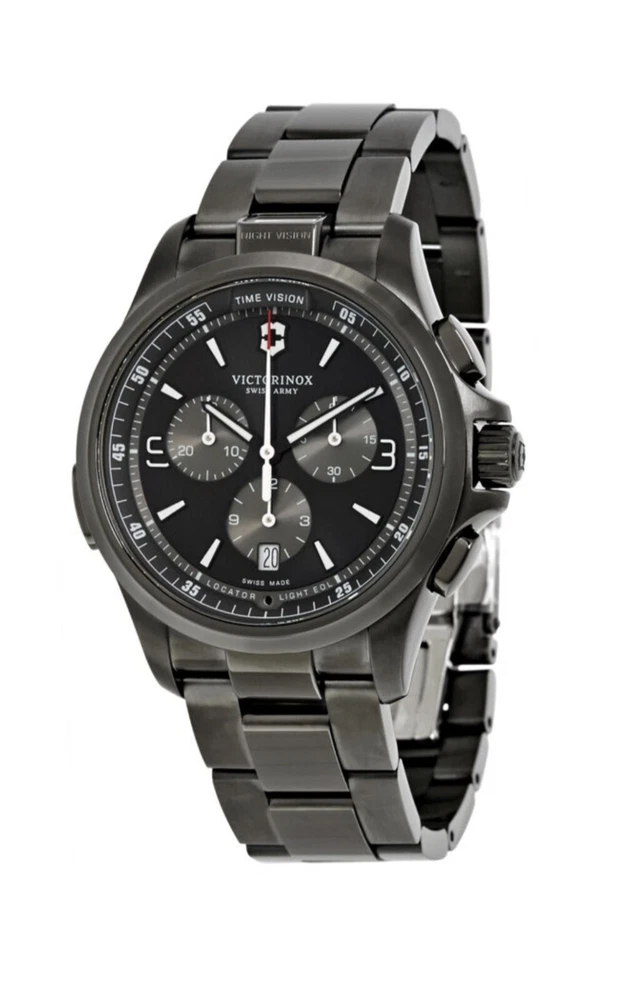 Elevate your style with the Victorinox Swiss Army Night Vision Black Bracelet Watch 241730. This modern men's wristwatch features a round black stainless steel case with a fixed black PVD coated bezel. The watch is powered by a precise quartz (battery) movement and boasts a chronograph function, allowing for accurate timekeeping and date display. The black stainless steel bracelet has a double-locking fold-over clasp and can fit a wrist size of up to 7.6-8 inches. The Victorinox Swiss Army Night Vision Black Bracelet Watch 241730 is water-resistant up to 50 meters (5 ATM) and comes with its original box and papers. The watch is covered by a 2-year manufacturer warranty. This watch is perfect for casual wear and can complement any outfit with its sleek and stylish design.Near mint.