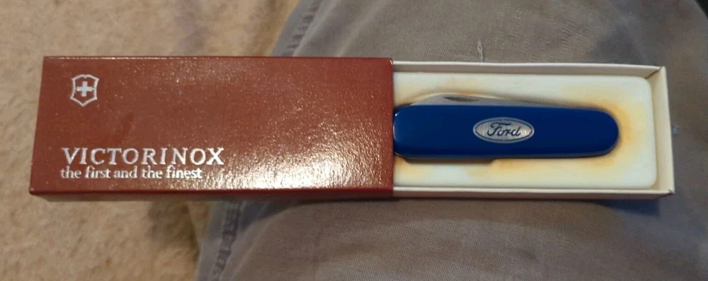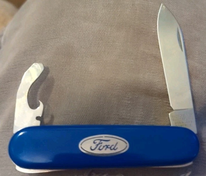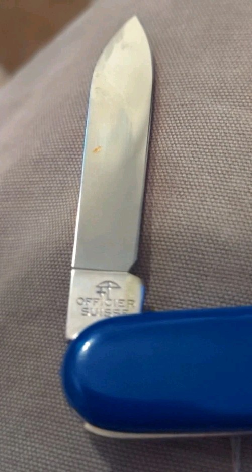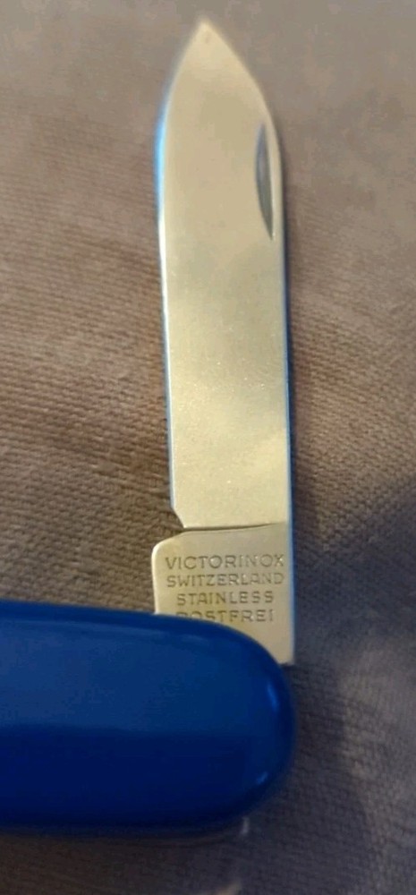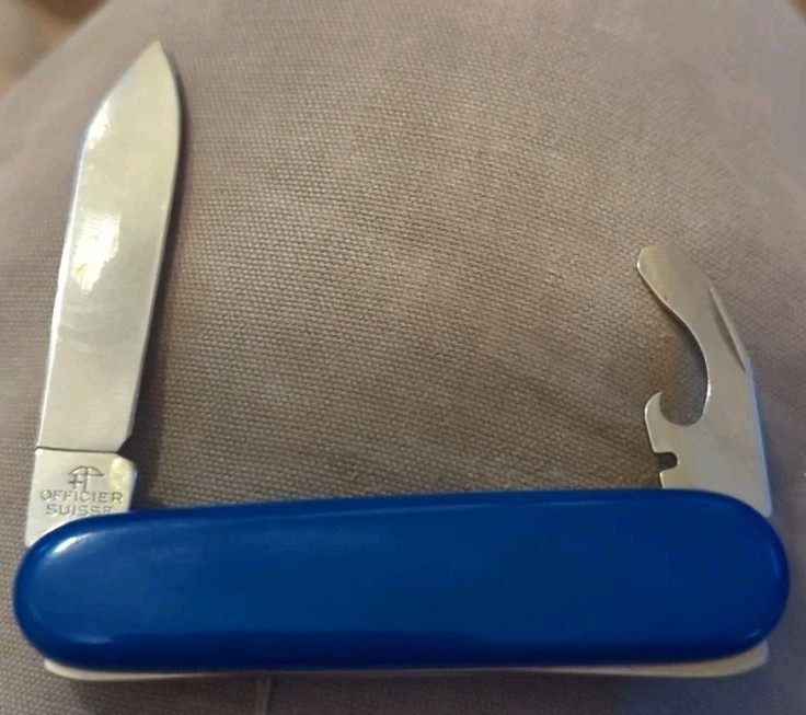 The Victorinox Officer Suisse Swiss Army pocket knife features a stainless steel blade with a plain edge and a lockback opening mechanism, making it easy to use. This collectible modern folding knife comes in a stylish blue color and includes a bottle opener, perfect for any practical use. Made by the renowned brand Victorinox, this original Swiss Army knife is ambidextrous and is a must-have for collectors or those who appreciate quality craftsmanship from Switzerland. Knife is New in Box. Opens Easily. Thank you