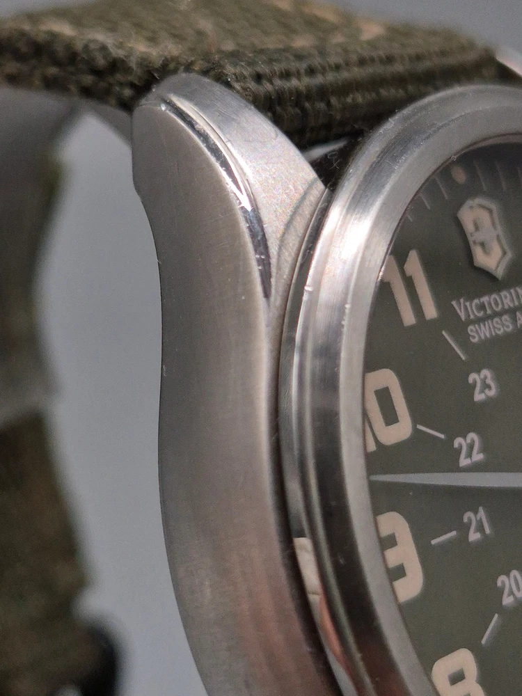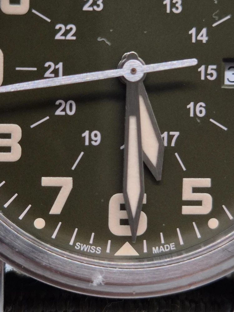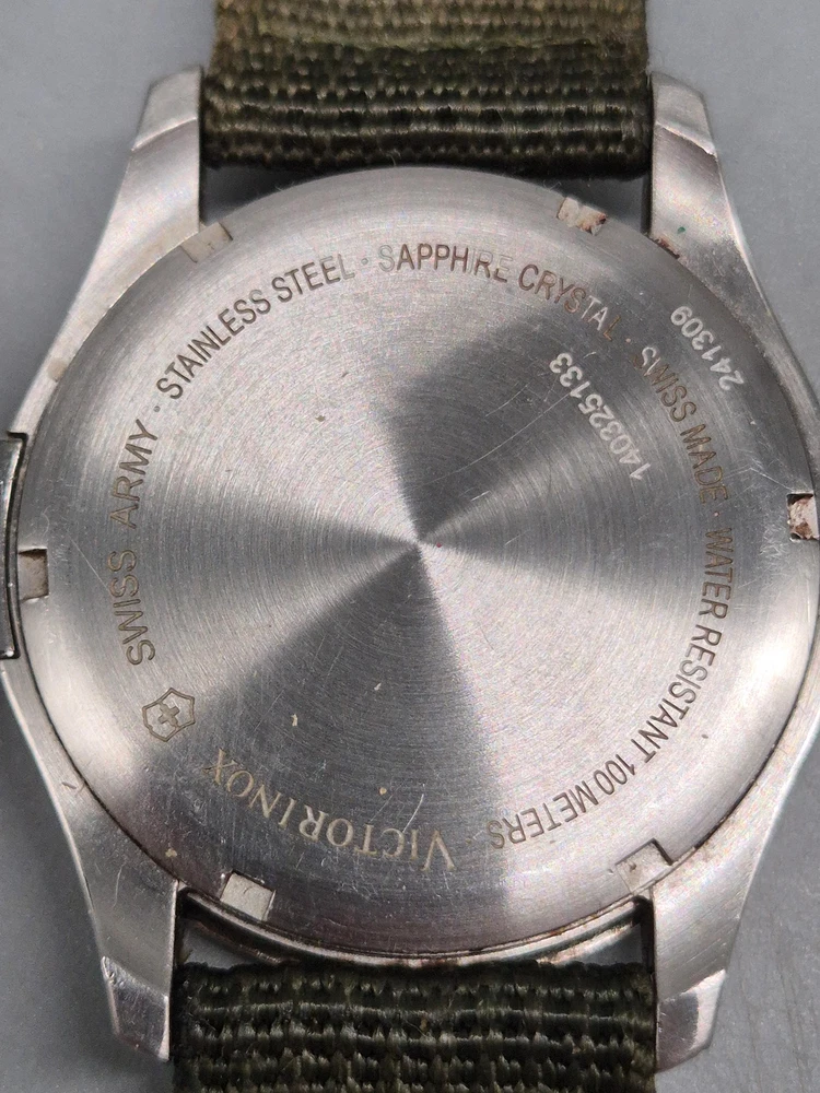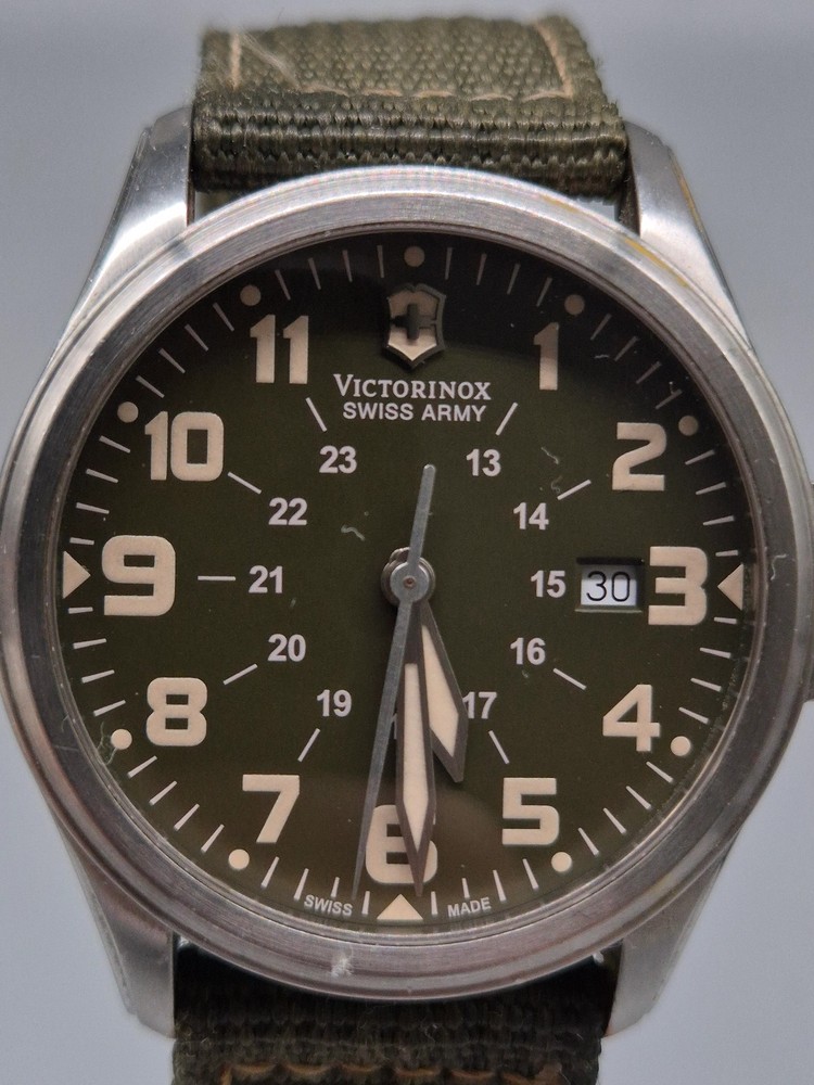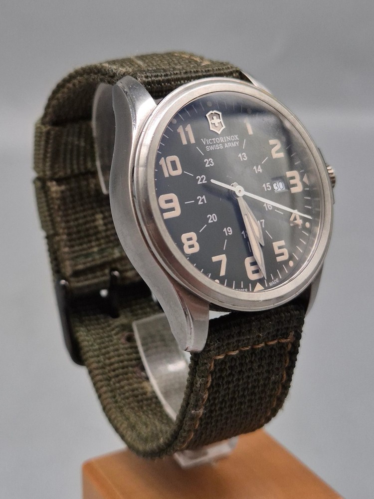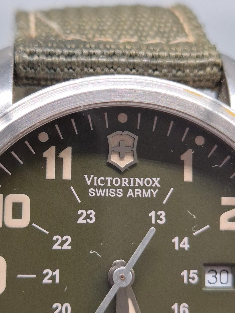 Diese Victorinox Swiss Army Herren Uhr besticht durch ihren klaren, funktionalen Feld-Militärstil kombiniert mit hochwertiger Swiss-Made Verarbeitung. Das Edelstahlgehäuse und das kratzfeste Saphirglas sorgen für Langlebigkeit, während das dunkelgrüne Zifferblatt mit klaren Leuchtzeigern und 24‑Stunden-Skala für optimale Ablesbarkeit sorgt. Ein praktisches Datumsfenster befindet sich bei 3 Uhr. Das grüne Textilband mit Metalldornschließe ergänzt das robuste Gesamtbild und passt perfekt zum Outdoor-Charakter der Uhr. Details: Artikelnummer: GJK0059 Uhr: Herren Uhr Marke: Victorinox Swiss Army Material: Edelstahlgehäuse, Saphirglas, Textilband Funktionen: Quarzwerk, Datumsanzeige, Leuchtzeiger, 24‑Stunden-Anzeige Gehäusedurchmesser: ca. 40 mm (ohne Krone) Armband: Textilband, Länge: ca. 24 cm inkl. Schließe Wasserdicht: bis 10 atm Gewicht: ca. 70 g Zustand: Gebraucht – das Edelstahlgehäuse zeigt feine Kratzer an Hörnern und Lünette, das Glas ist klar und bis auf kleine Microkratzer unauffällig. Textilband mit leichten Gebrauchsspuren, aber insgesamt sauber. Besondere Merkmale: – Schweizer Quarzwerk: zuverlässig & präzise – Saphirglas – sehr widerstandsfähig gegen Kratzer – Klare 24‑Stunden-Skala – ideal für militärischen Look – Outdoor-taugliche Wasserdichtigkeit (10 atm) – Authentisches Victorinox Swiss Army-Design – Vielseitig: tauglich für Alltag, Reisen und Outdoor-Abenteuer