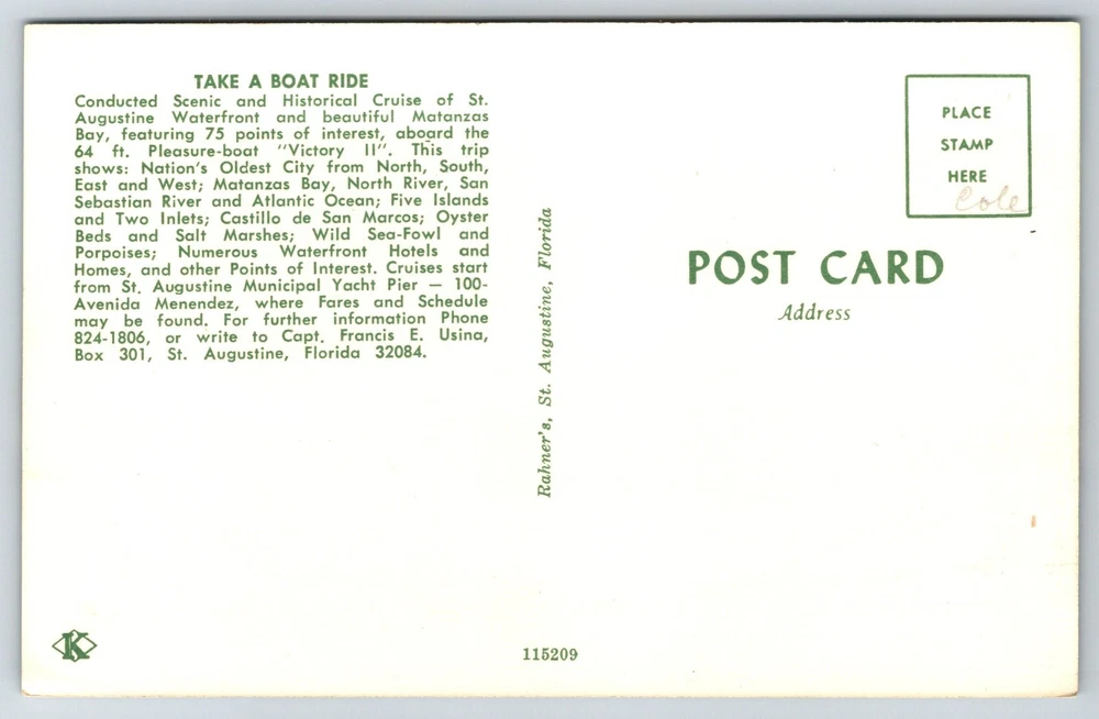 You are buying a Vintage " Victory II Cruise St Augustine Waterfront Matanzas Bay FL Postcard . " Card Size is approx. 3.5" X 5.5". In stock, Usually Ships Within 24 hours! 100% Satisfaction Guaranteed! If you have any problems with this purchase, please contact me before leaving feedback, and I will do my absolute best to make you satisfied. Check all my other listings in my store. RETIREDWITHBOOKS. Thank you!