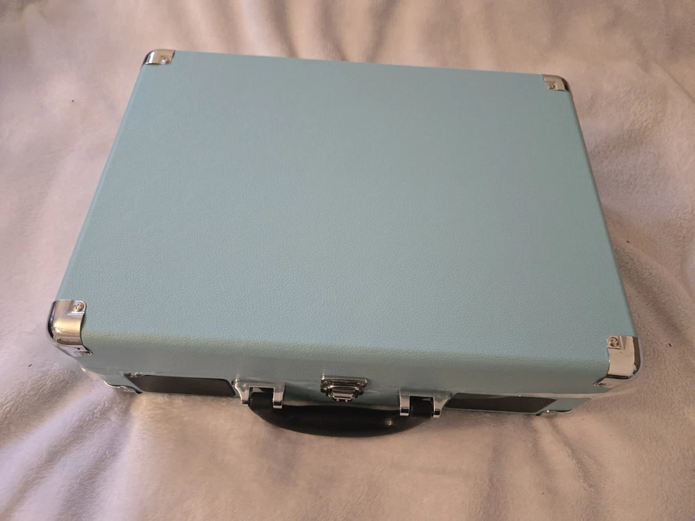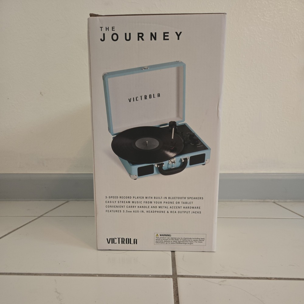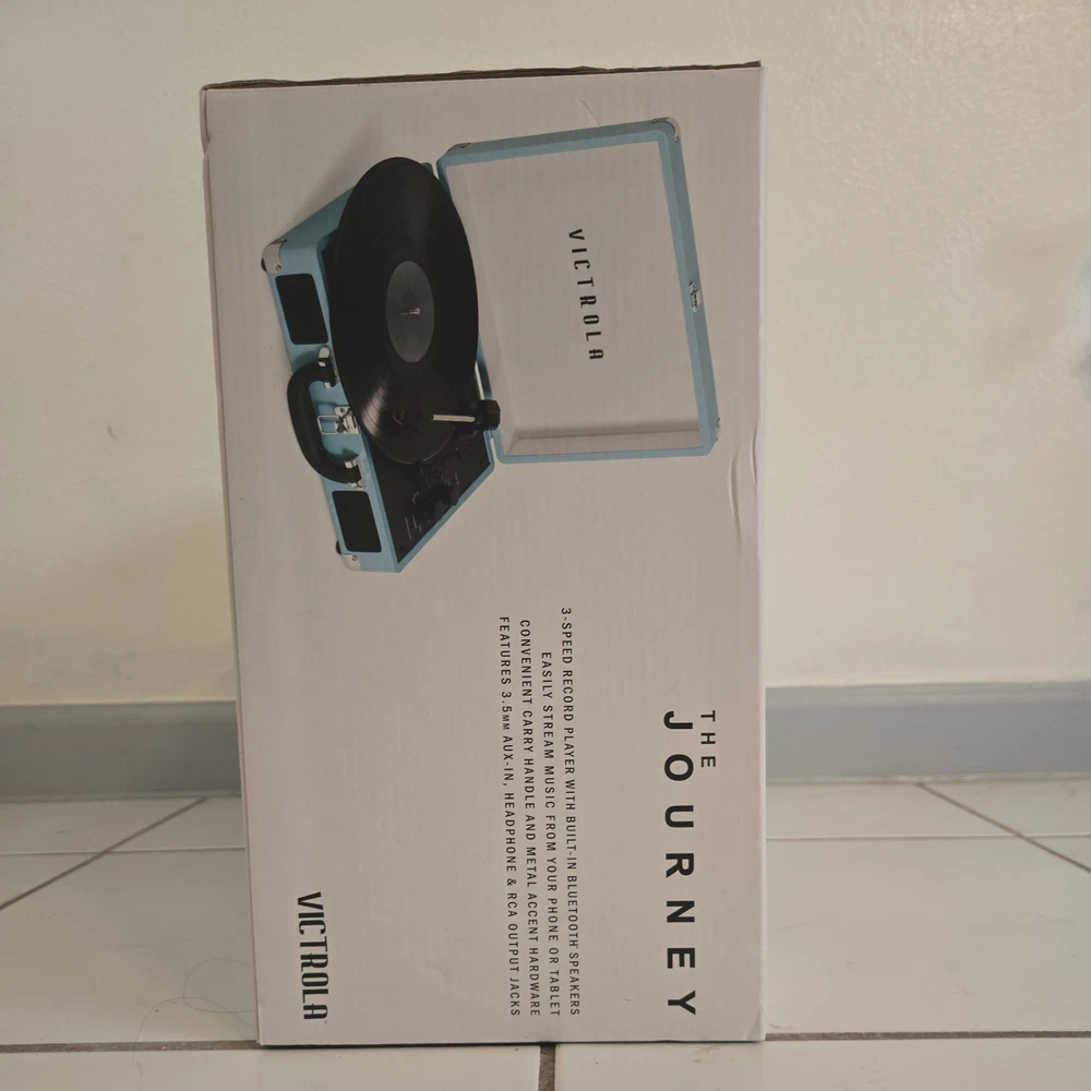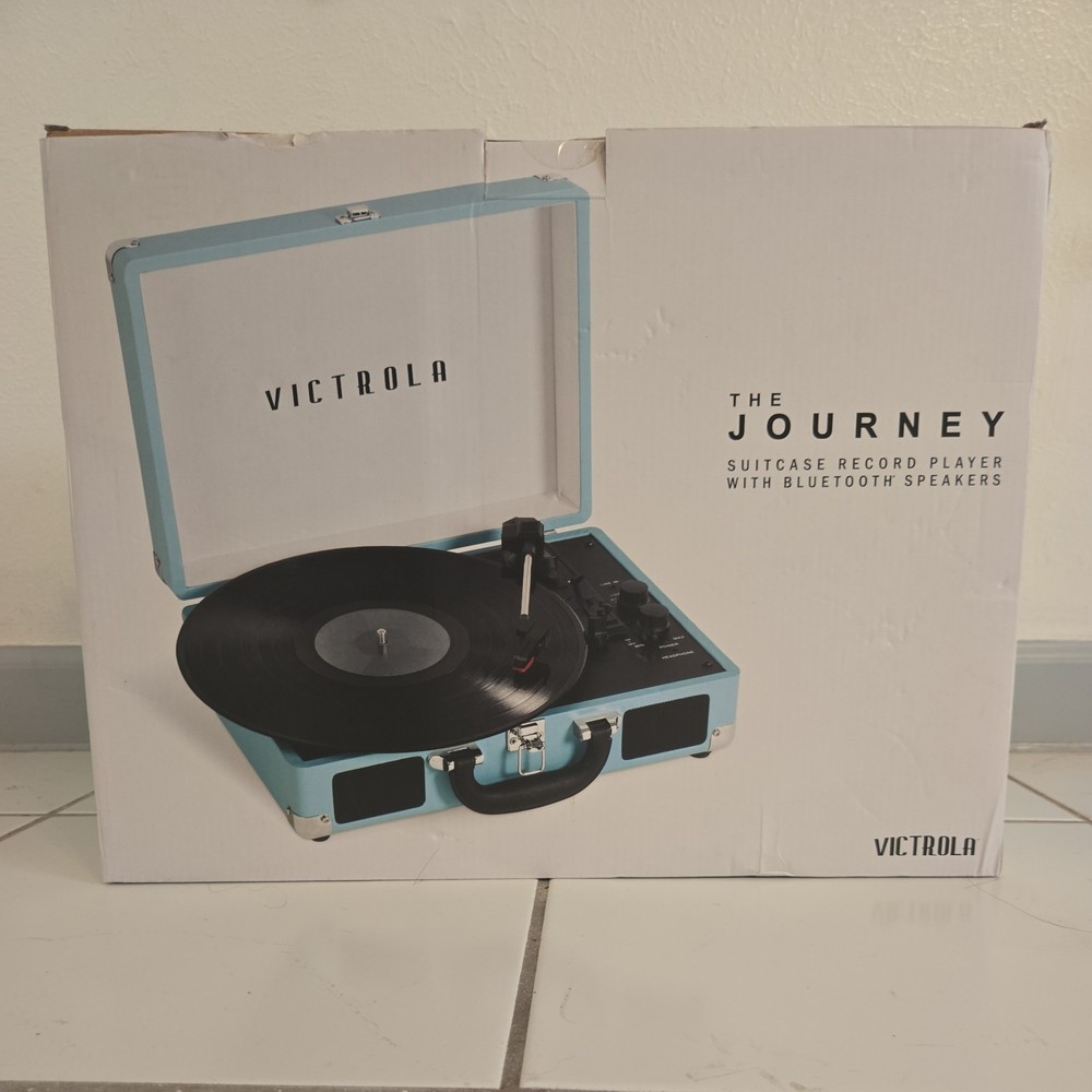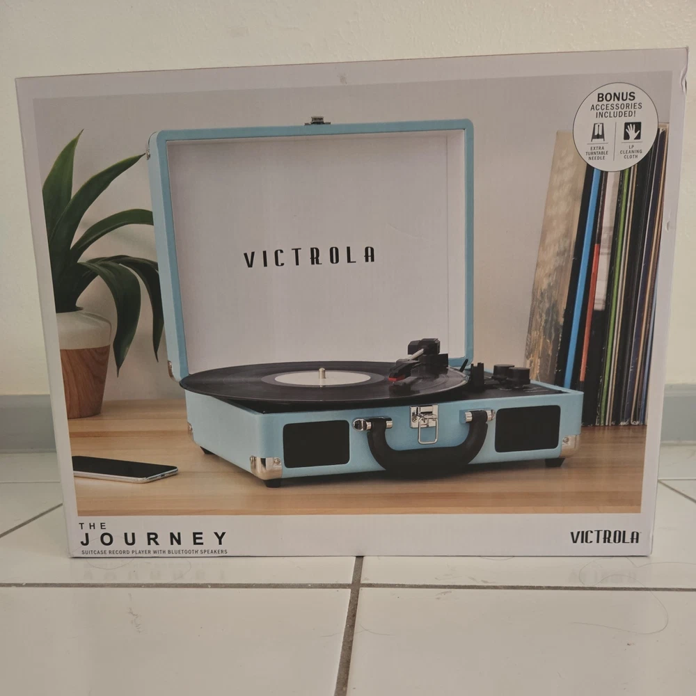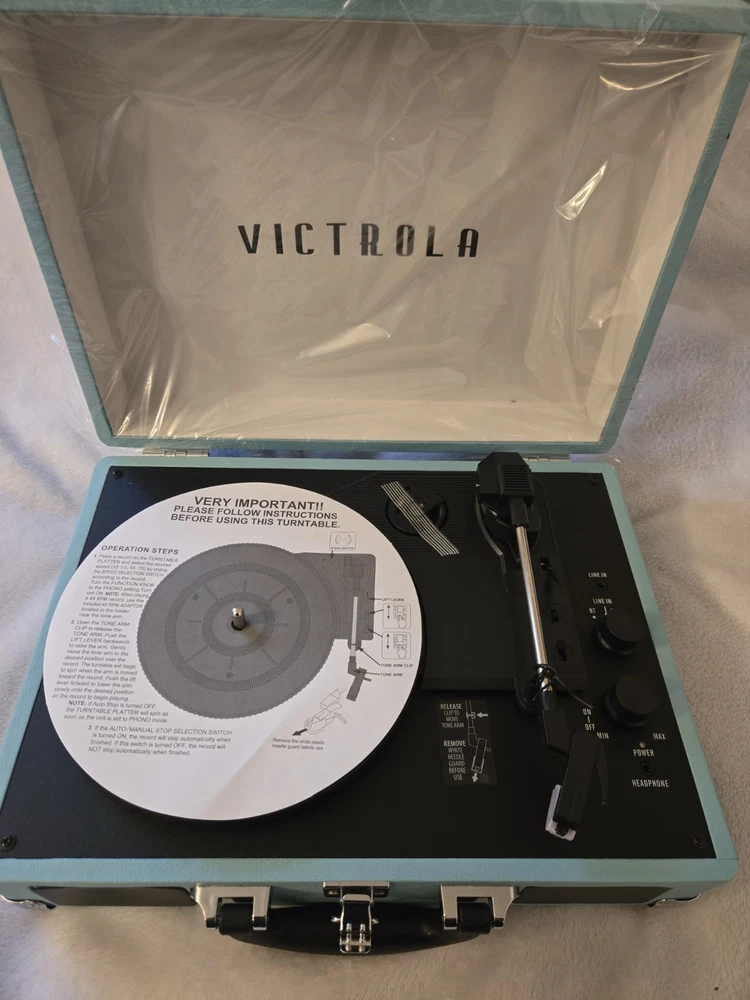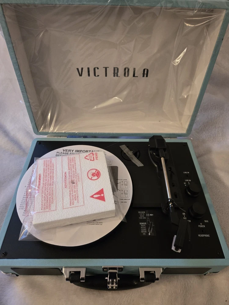 Item Description:This Victrola Bluetooth Suitcase Record Player is brand new and has never been used. All original packaging and contents inside the box are still sealed. The box itself has minor cosmetic damage, but the player and accessories inside are untouched and in perfect condition.Brand New – Never UsedBluetooth & 3-Speed TurntablePortable Suitcase Design – TurquoiseAll Original Packaging – Box Slightly DamagedFeatures:3-Speed Turntable: Plays all vinyl records at 33 1/3, 45, and 78 RPM.Bluetooth Connectivity: Stream music wirelessly from your smartphone or tablet.Built-In Stereo Speakers: Crisp sound without the need for extra equipment.Portable Suitcase Design: Compact with carrying handle – great for on-the-go music.Aux-In & Headphone Jack: Connect other devices or enjoy private listening.Condition:Brand new (never used) – All packaging is intact and unopened inside.Box has minor cosmetic damage (see photos).What’s Included:Victrola BT Suitcase Record Player (Turquoise)All original accessories and packaging (unopened).Shipping:Ships within 3-5 business day.Will be carefully packed to ensure safe delivery.